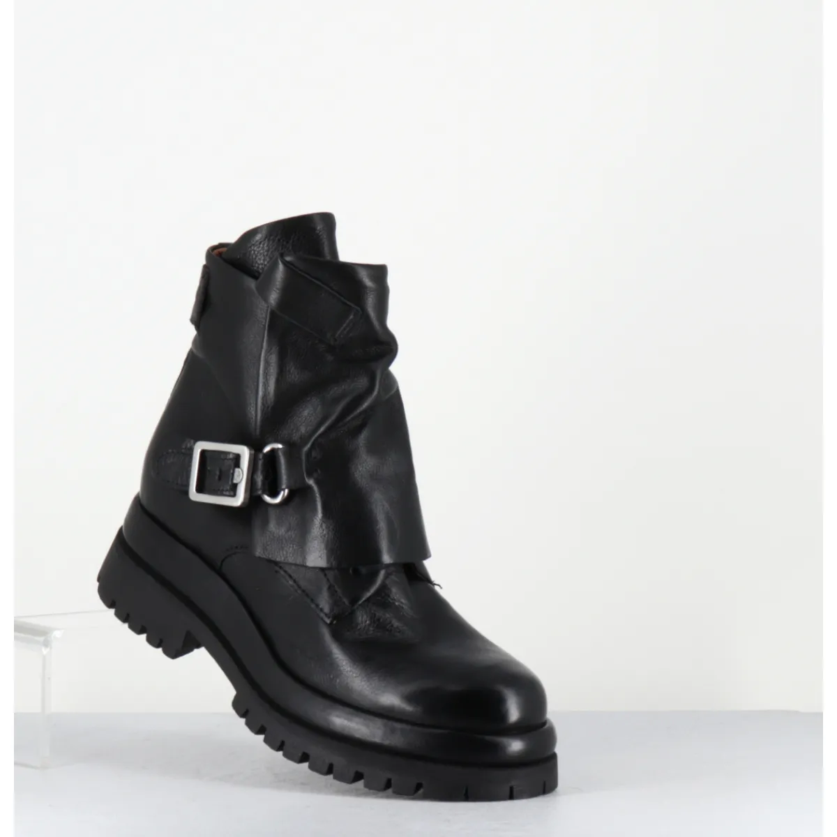 Boots à lacets en cuir noir souple avec empiècement asymétrique déstructuré et boucle réglable, montées sur une double semelle confortable