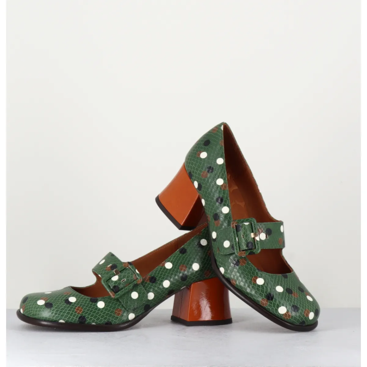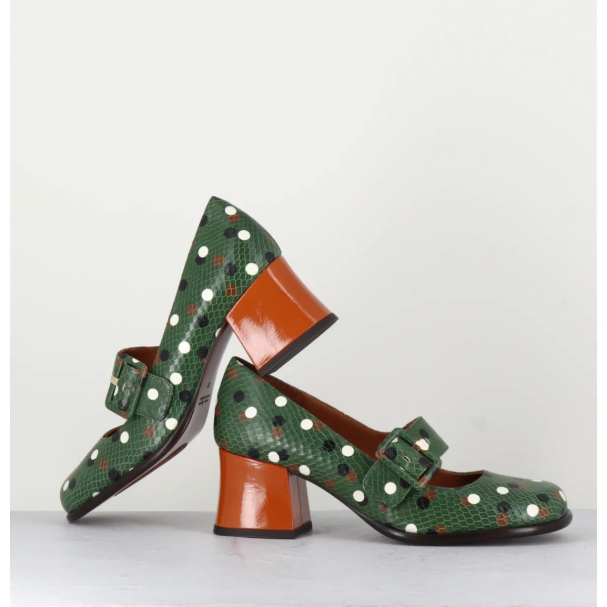 Petites chaussures babies rétro en cuir gaufré effet reptile vert & imprimé pois blanc/noir/marron, bout carré arrondi, montées sur un petit talon recouvert de cuir effet vernis orangé, légèrement évasé esprit 70s