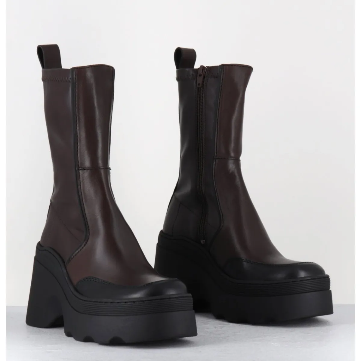 Boots réalisées à partir d’empiècements de cuir marron avec surpiqûres contrastantes, arrière en stretch pour un effet galbant sur la jambe; montées sur une semelle compensée esprit bratz