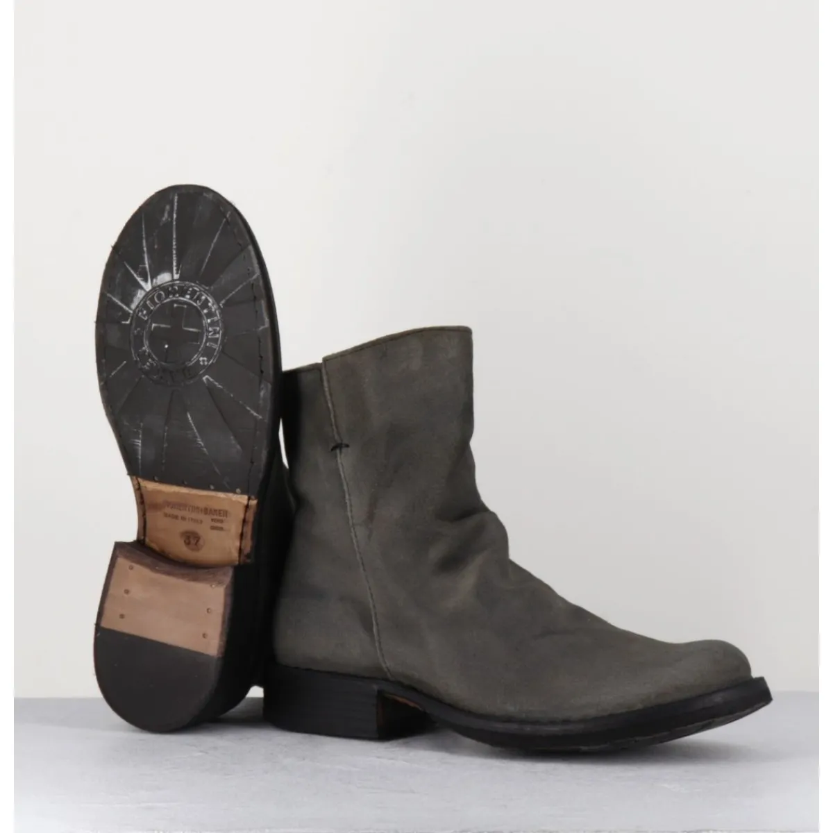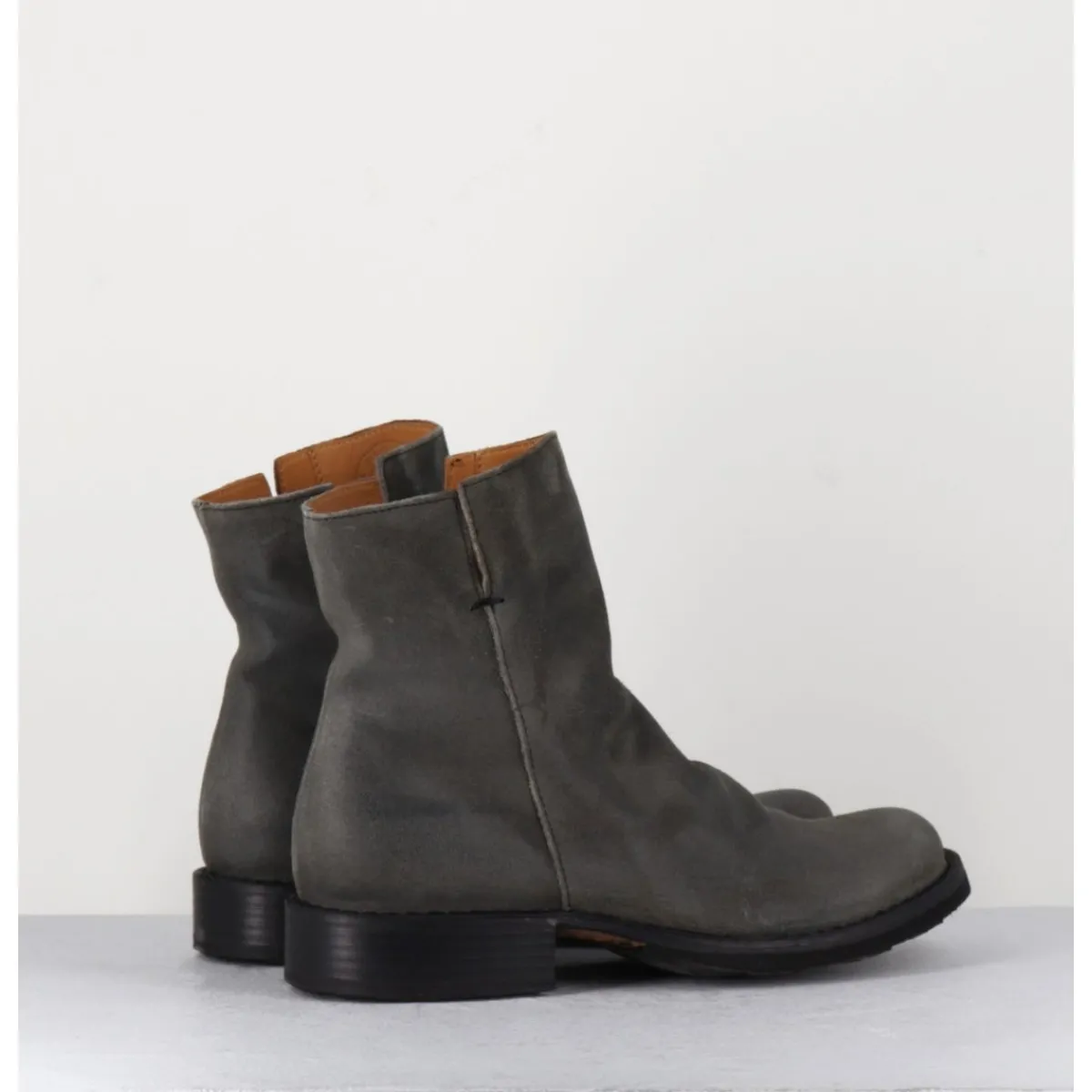 Boots esprit biker en veau velours gris taupe, bout arrondi, travail de plissé à l’avant & zip intérieur, montées sur une semelle en cuir et caoutchouc cousue. Modèle iconique de la Maison présent dans nos collections depuis de nombreuses années