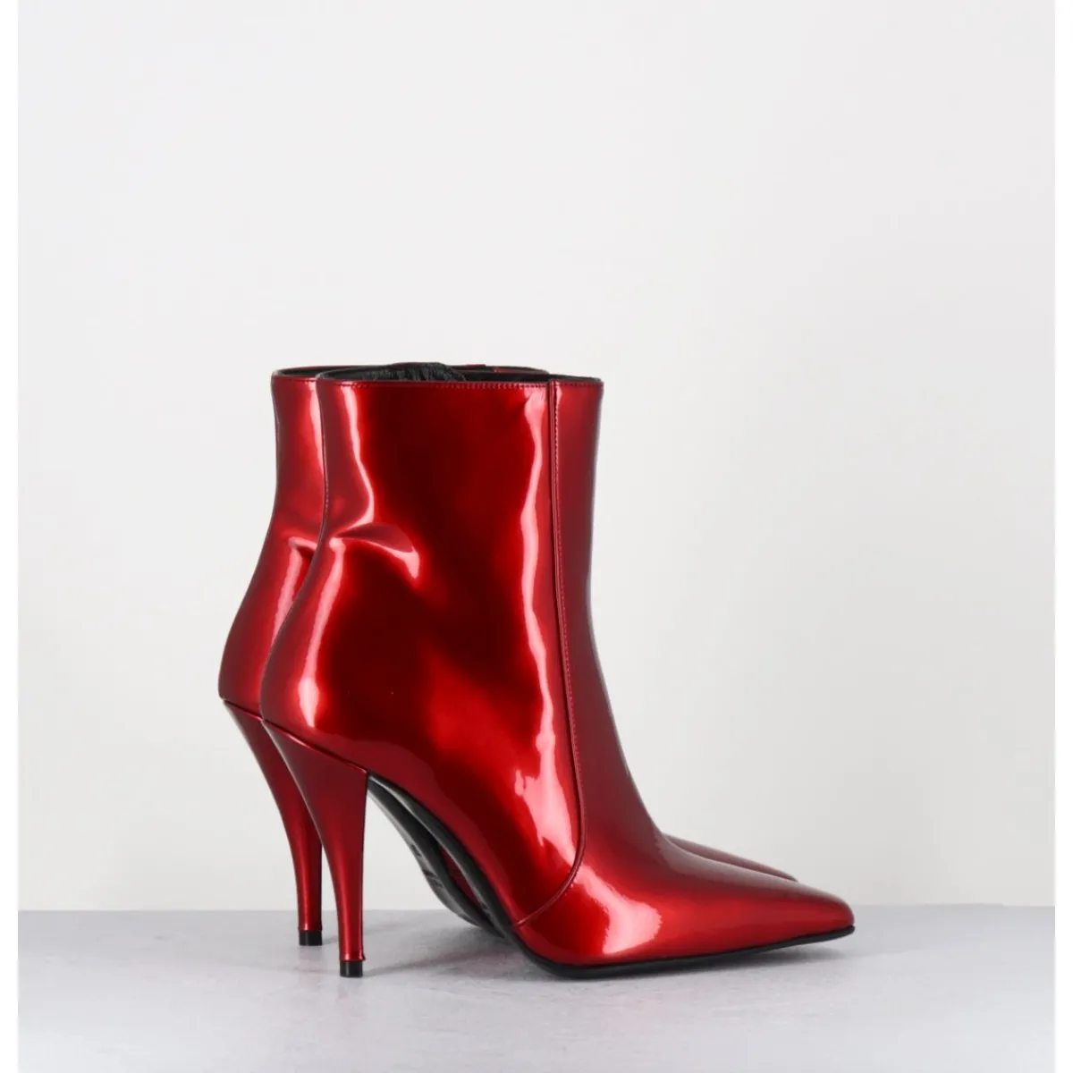Boots en cuir vernis rouge effet glossy, zip intérieur, bout effilé avec pointe carrée, montées sur un haut talon légèrement incurvé