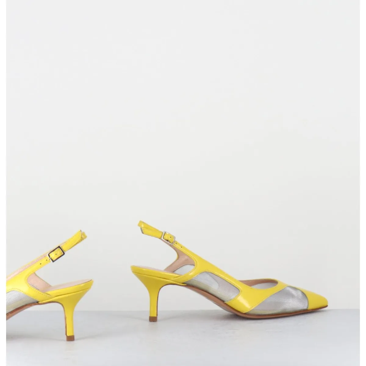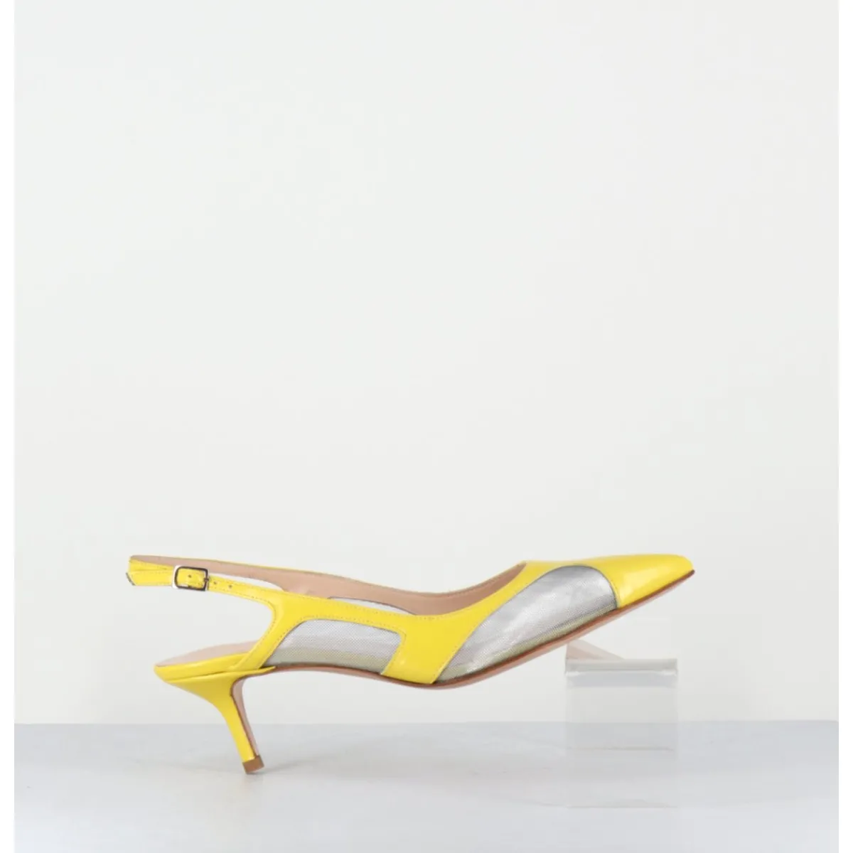 Escarpins slingback bout pointu, bride arrière réglable, cuir jaune et mesh métallisé argenté, montées sur un petit talon fin, mixte entre 90s & 60s