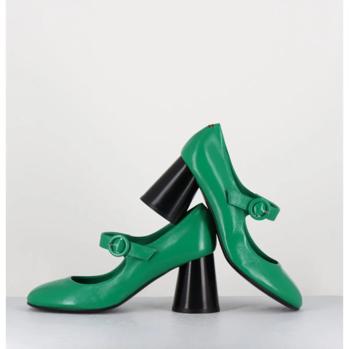 Babies à talon en cuir souple vert légèrement brillant, bout très rond, bride cheville réglable, couture signature de la maison sur le contrefort, montés sur un talon cylindrique évasé peint à la main en noir.