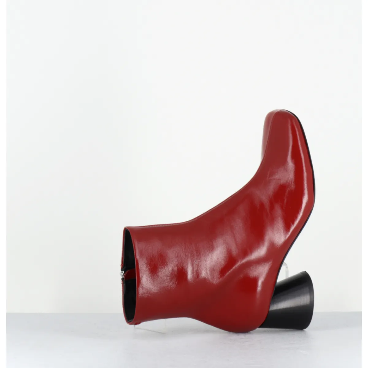 Boots en cuir rouge souple finition brillante, bout carré légèrement asymétrique, montées sur un petit talon à la structure légèrement évasé et peint à la main en noir