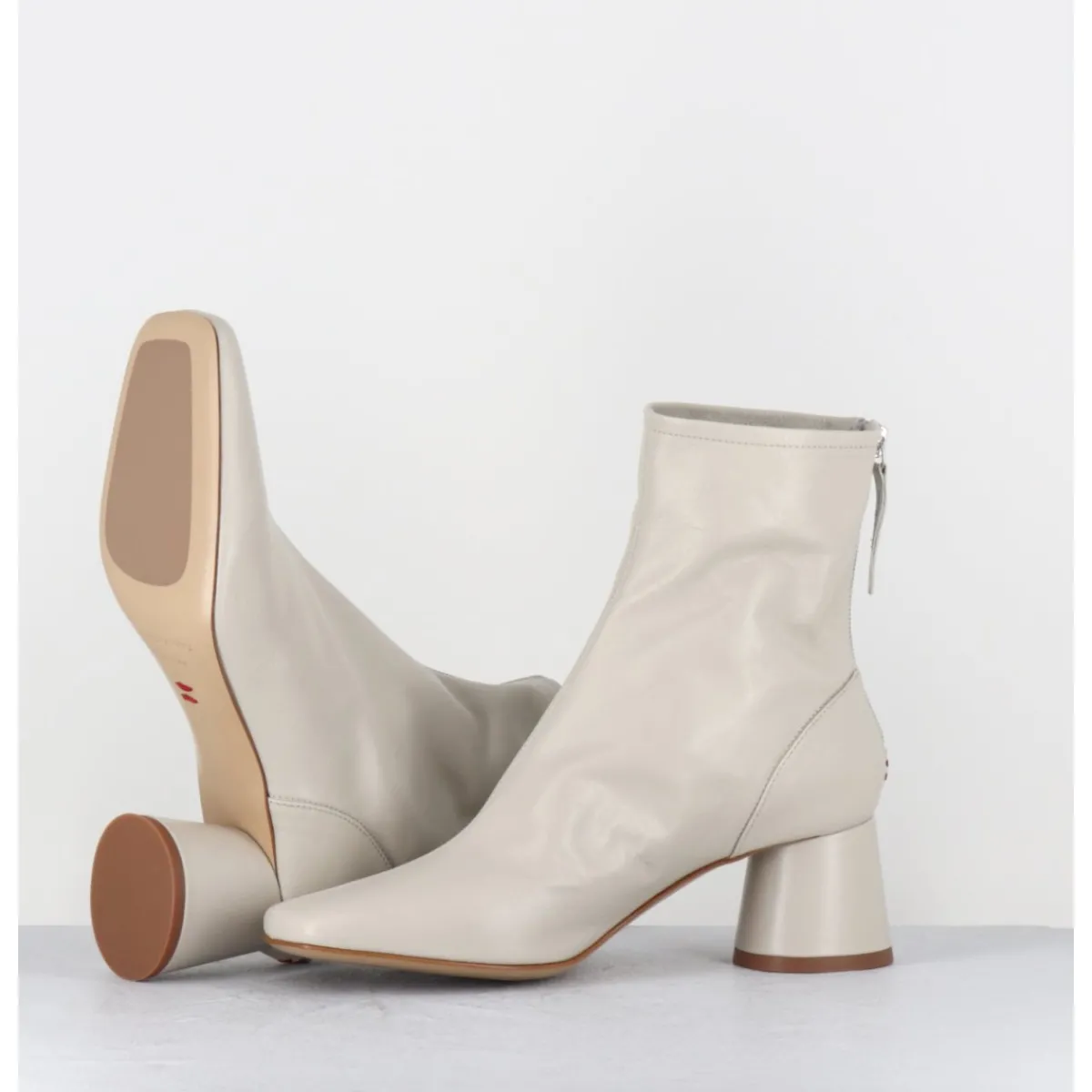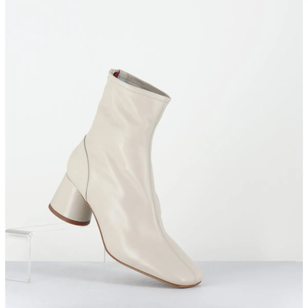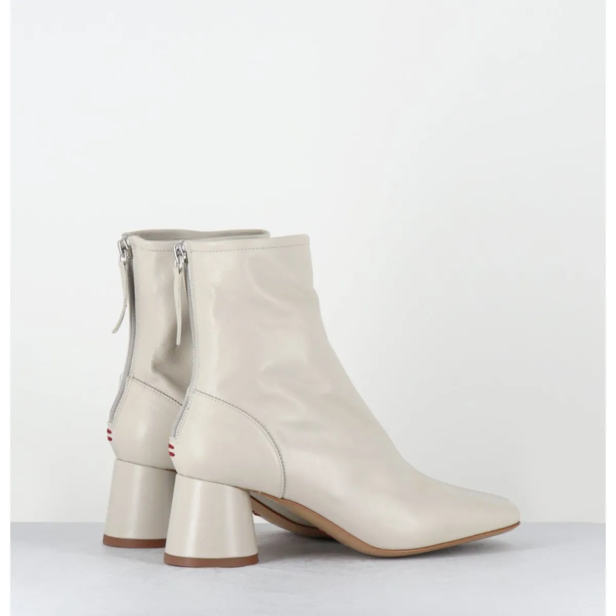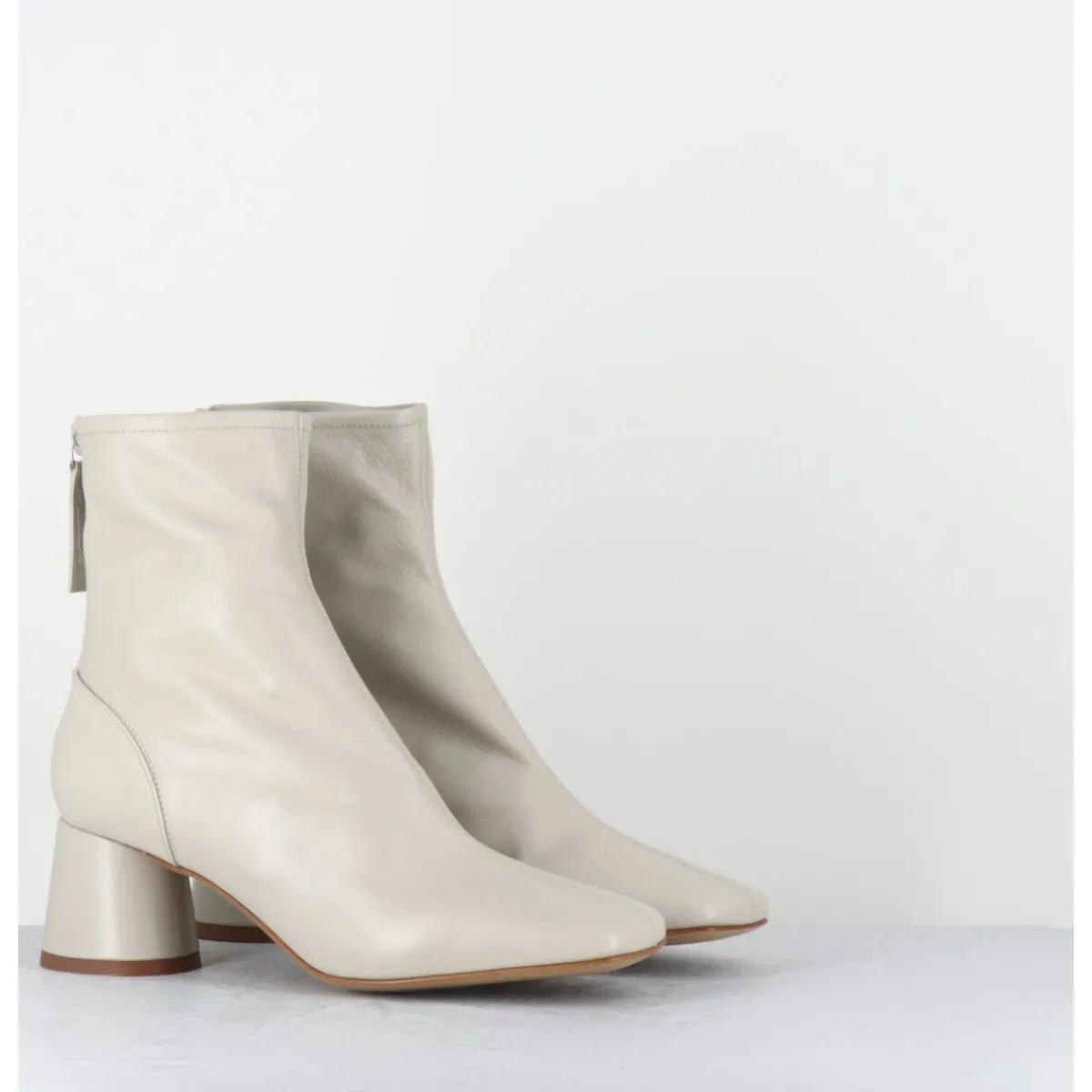 Boots en cuir souple non doublé blanc cassé, bout carré doux au look rétro, zip arrière, montés sur un petit talon cylindrique