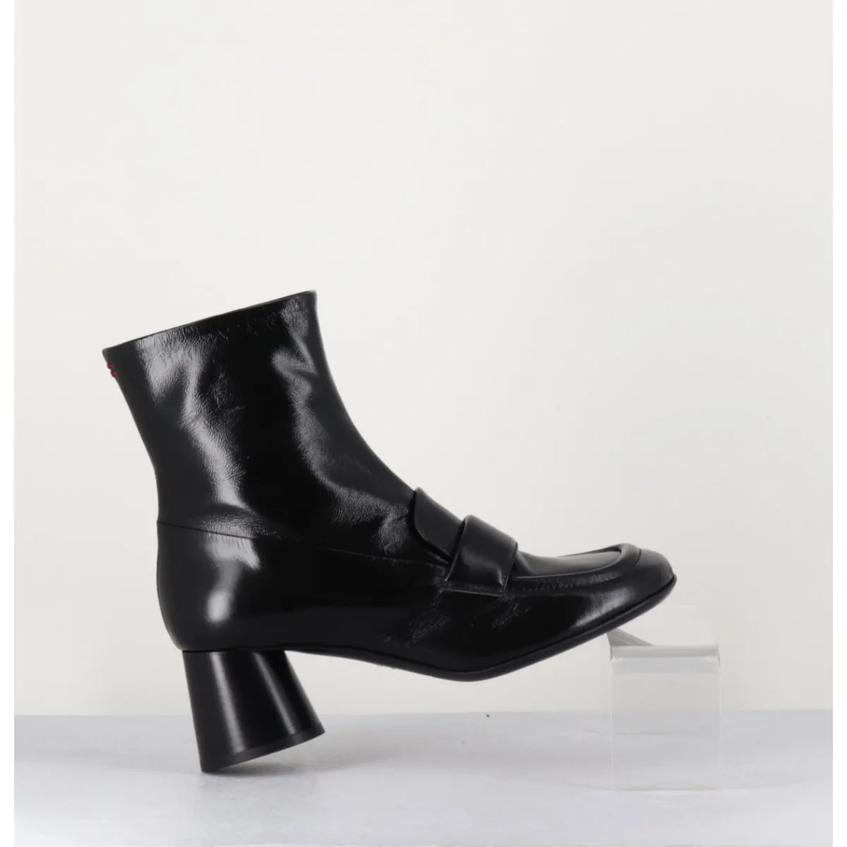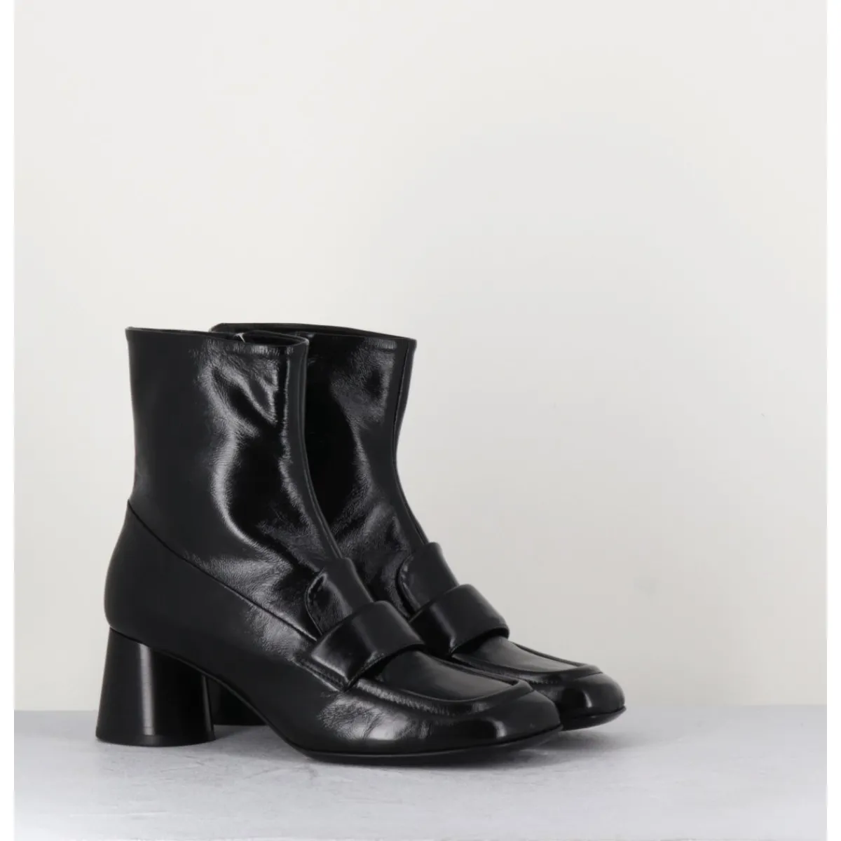 Boots mocassins à talon en cuir noir brillant, bout carré, zip intérieur, couture signature de la maison sur le contrefort, montés sur un talon cylindrique évasé.