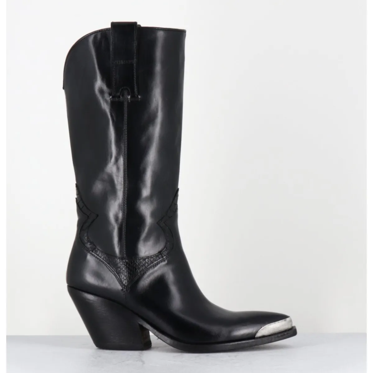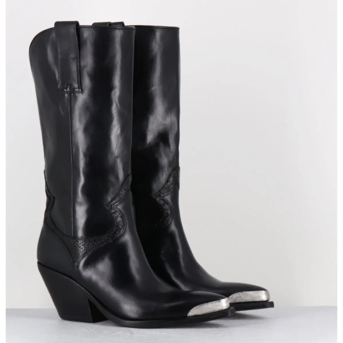 Bottes santiags en cuir lisse noir, pointe ornée d’un empiècement en métal argent, détails traditionnels en serpent, montées sur un talon biseauté