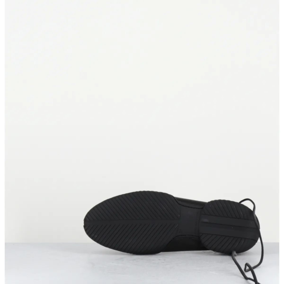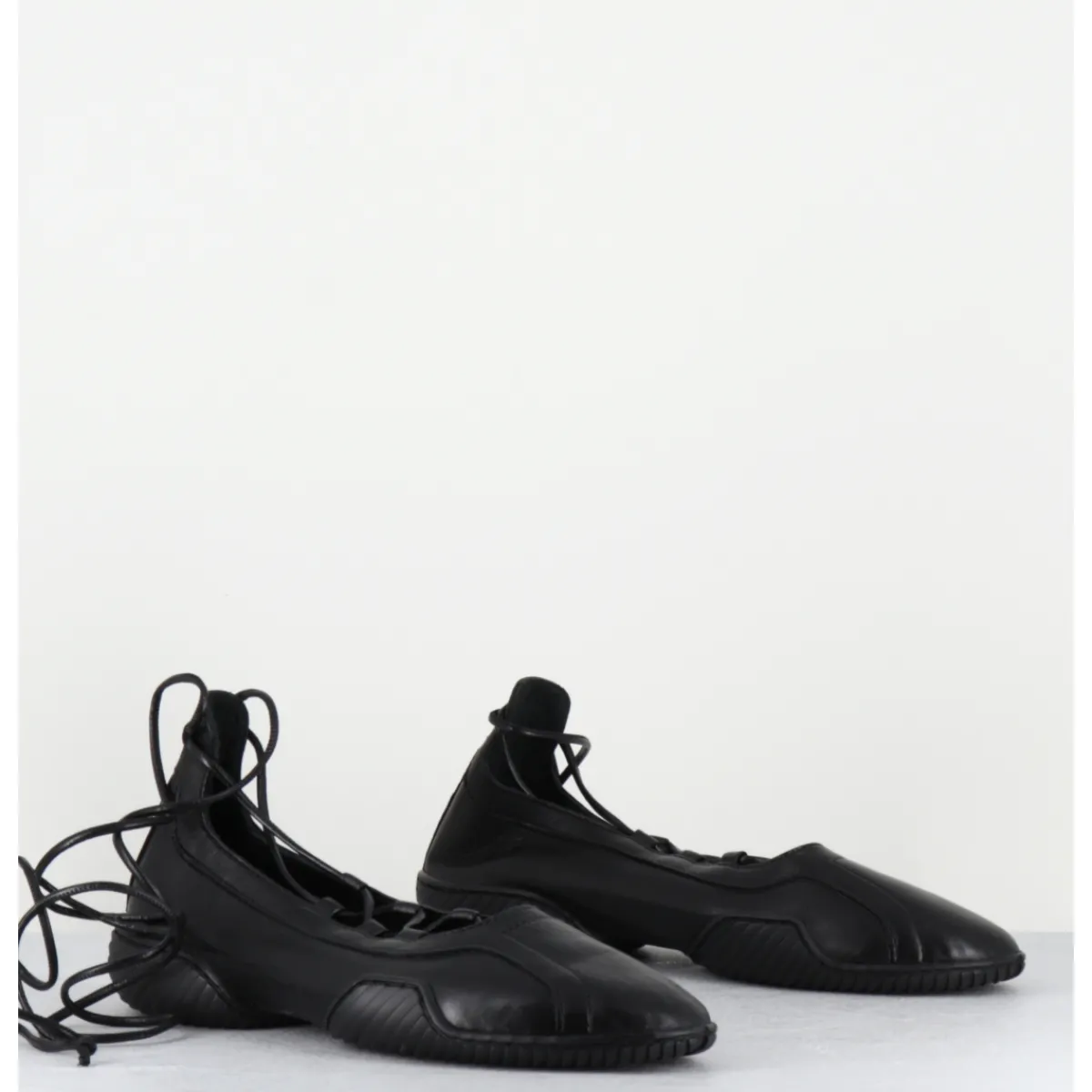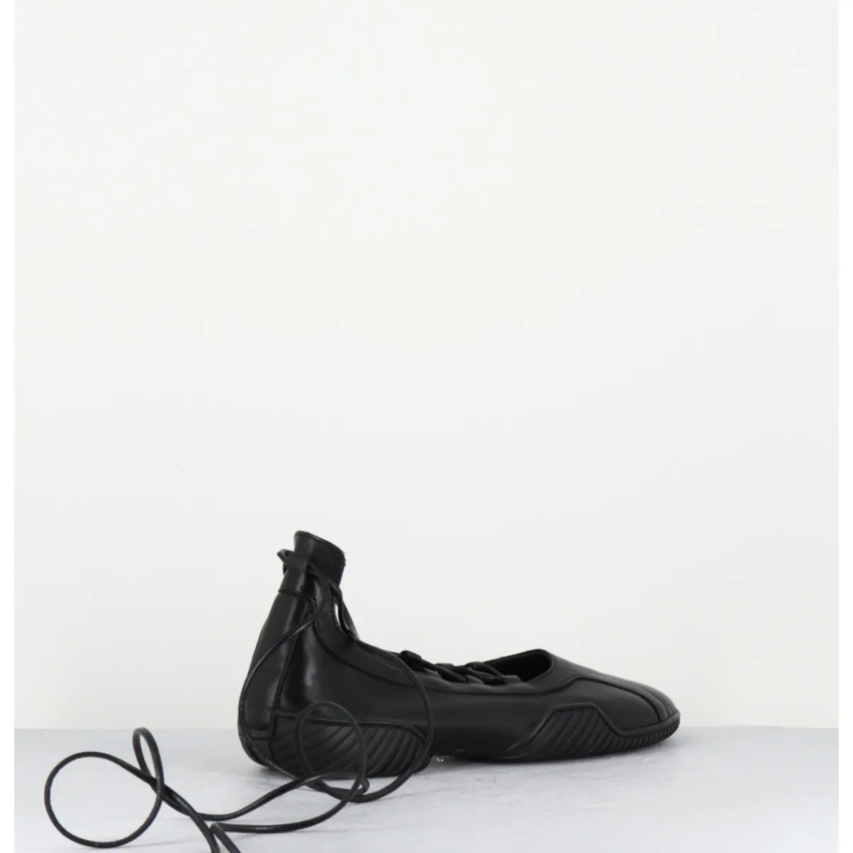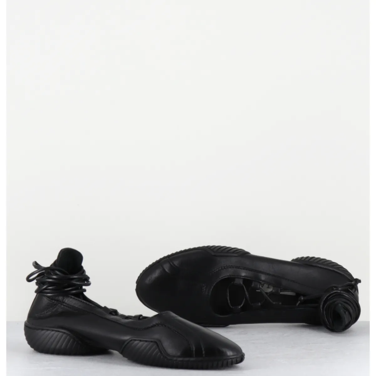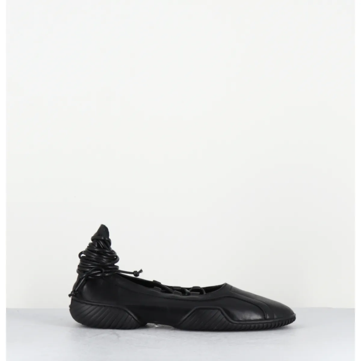 Ballerines en cuir noir souple avec longs lacets à enrouler autour de la jambe, bout arrondi, montées sur une semelle en gomme souple et légère à débords rappelant les chaussures de boxe et le début des années 2000