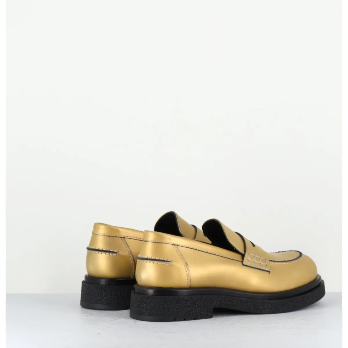 Mocassins en cuir métallisé doré mat, semelle épaisse en gomme légère