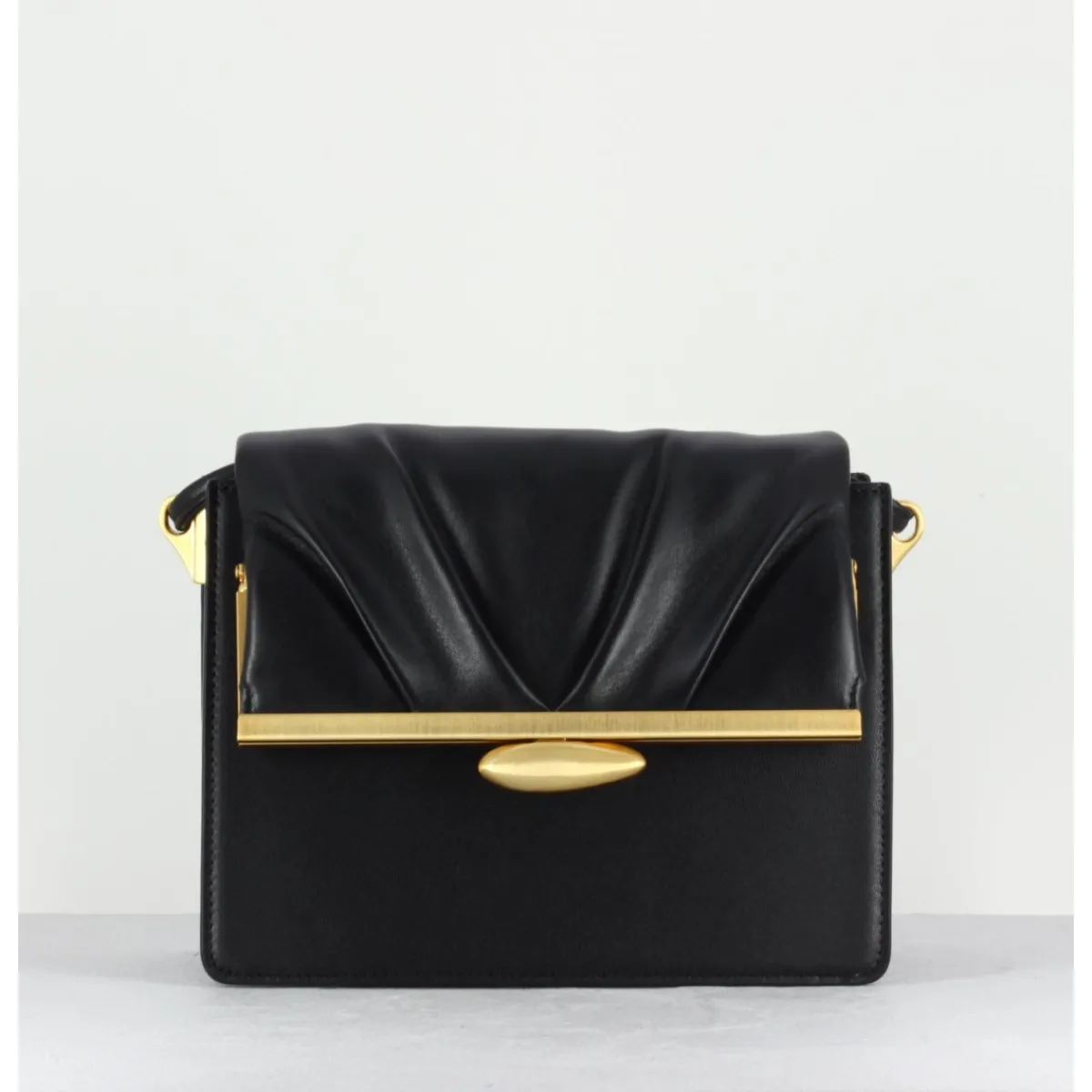 Sac sculptural en cuir noir au design carré, intérieur entièrement doublé qui possède assez d’espace pour transporter le nécessaire sans se sentir encombré! Il présente plusieurs compartiments, l’ouverture se fait en dépliant le rabat frontal en cuir souple et orné de détails dorés. Se porte en bandoulière ou à l’épaule grâce à sa double bride modulable. Fabriqué à la main en Corée dans les Ateliers de la Maison Reike Nen.