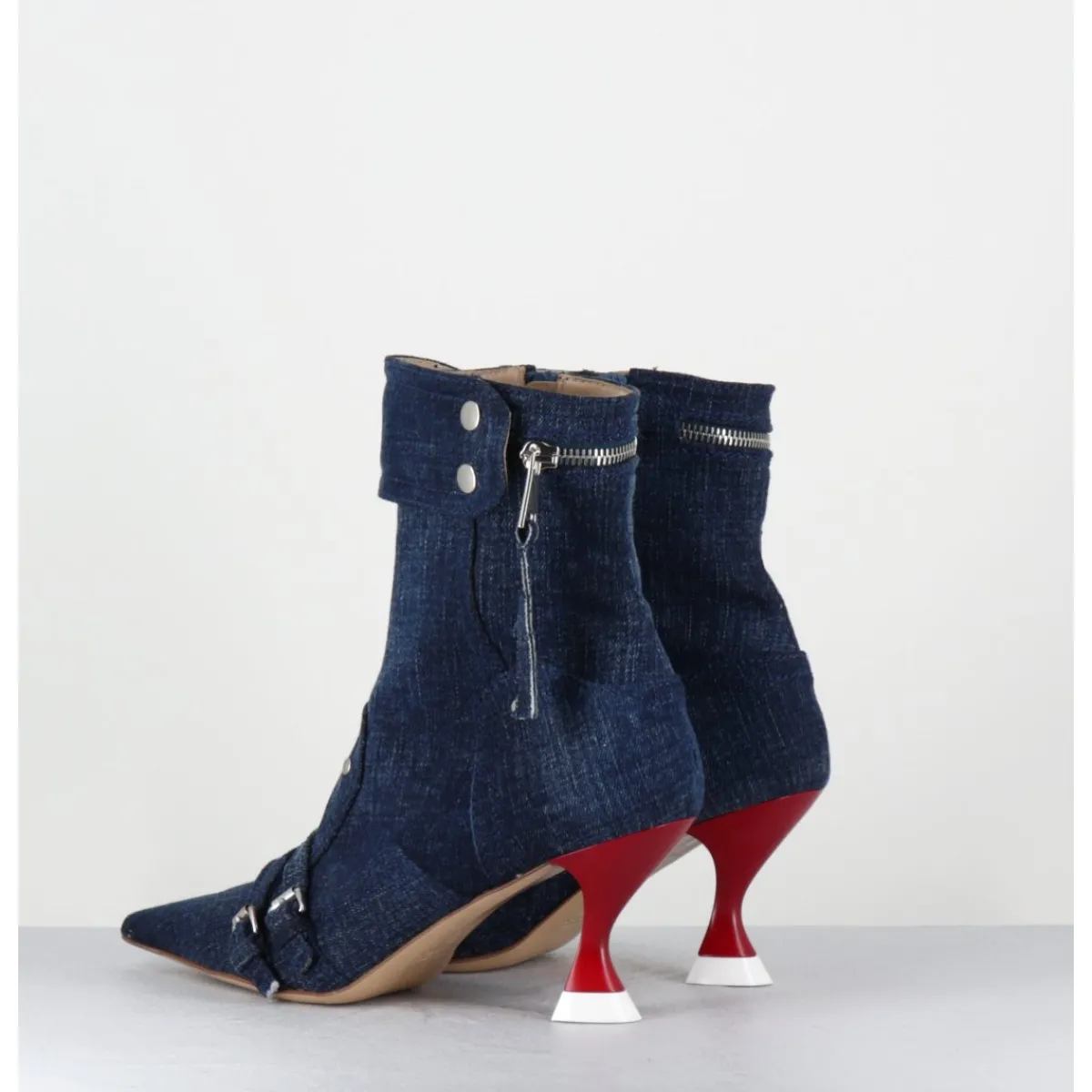 Boots bout pointu en jean bleu, ornées de rivets, de petites boucles à l’avant et d’un zip à l’arrière imitant la construction d’un jean, montées sur un talon stylisé et laqué rouge & blanc