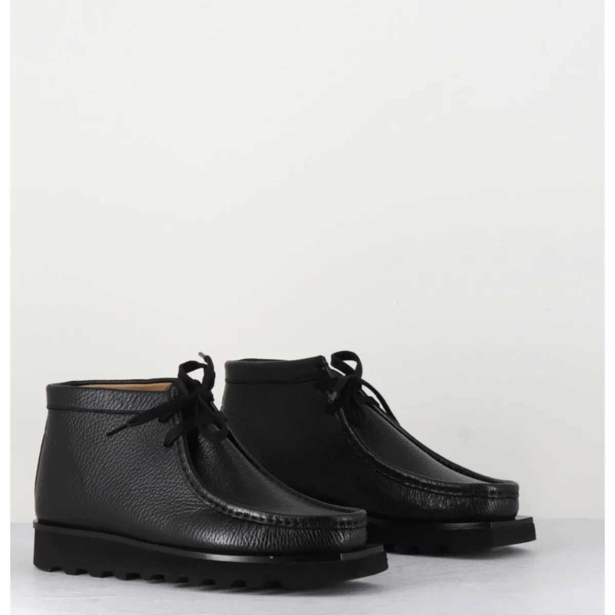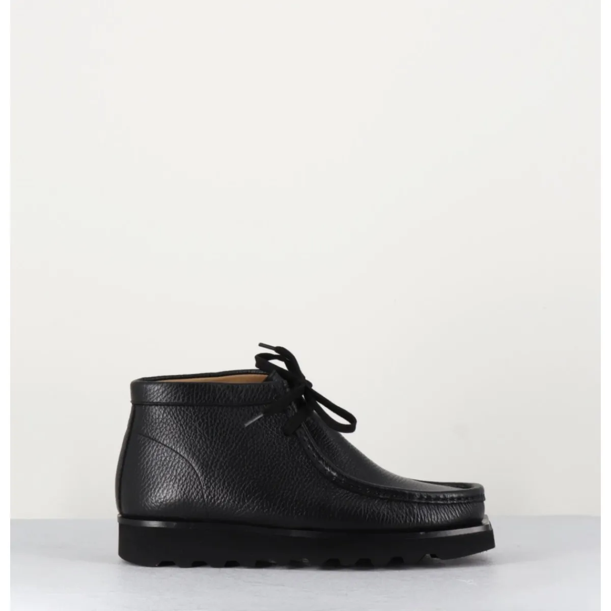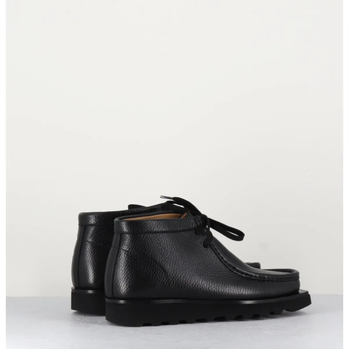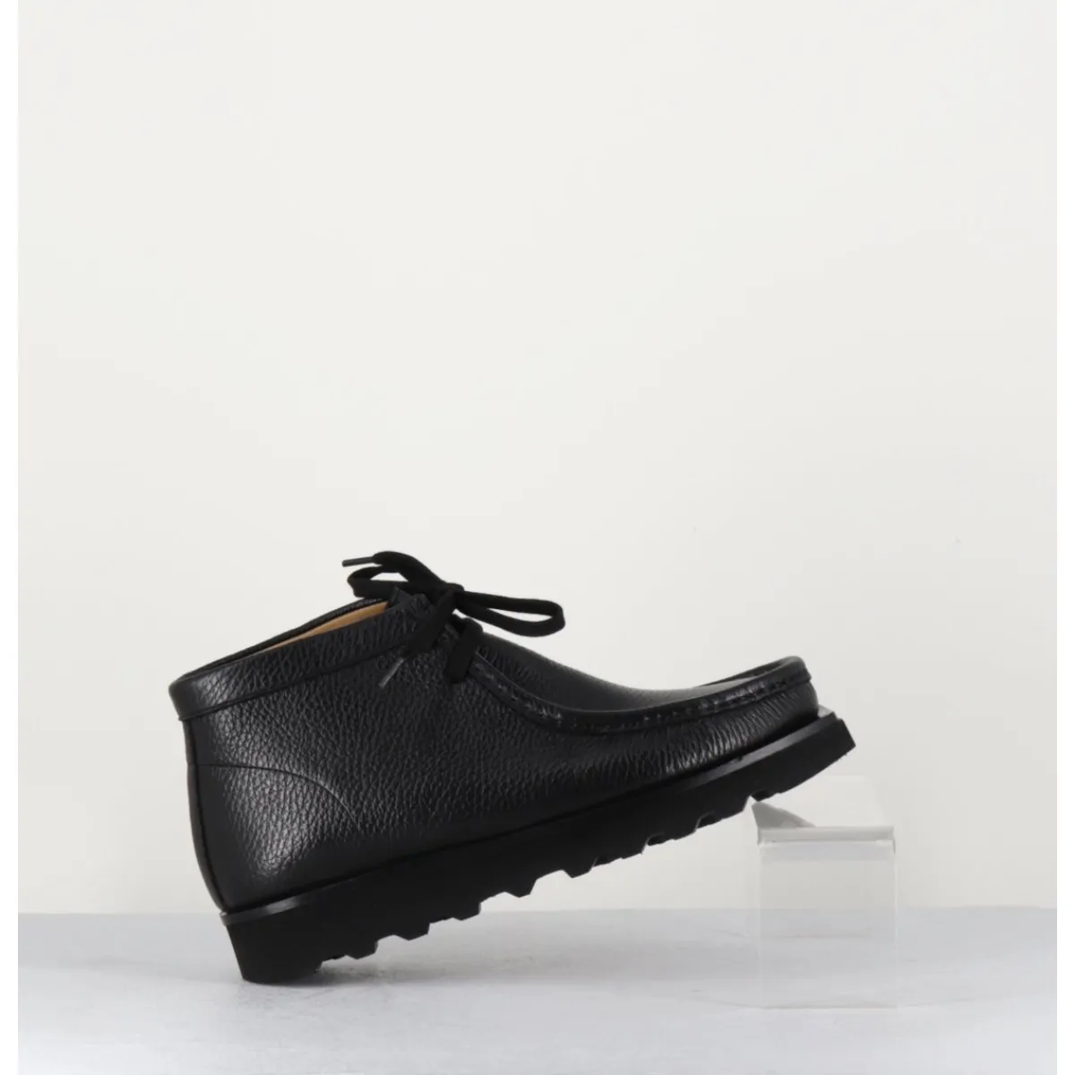 Chaussures à lacets en cuir grainé noir découpe brogue, surpiqûres ton sur ton, bout effilé, montées sur une semelle en micro fibre ultra légère au bout carré.