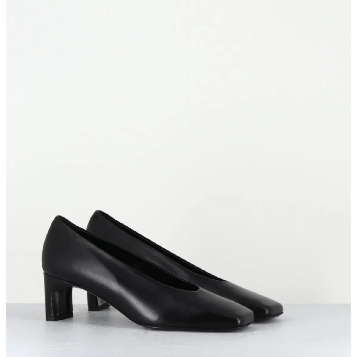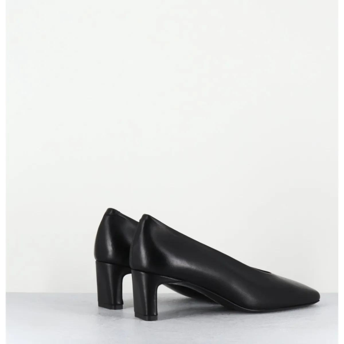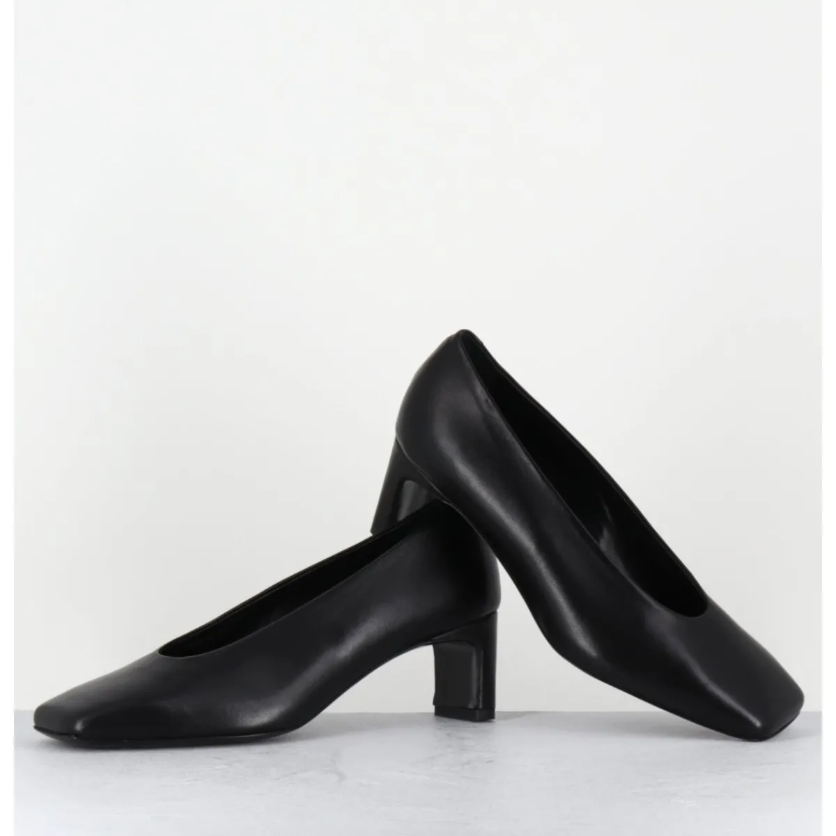 Escarpins en cuir souple noir, ligne minimaliste à bout carré doux, montées sur un petit talon structuré confortable