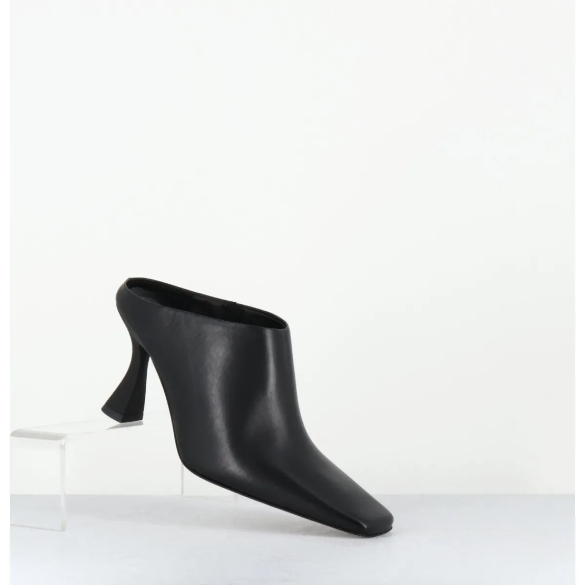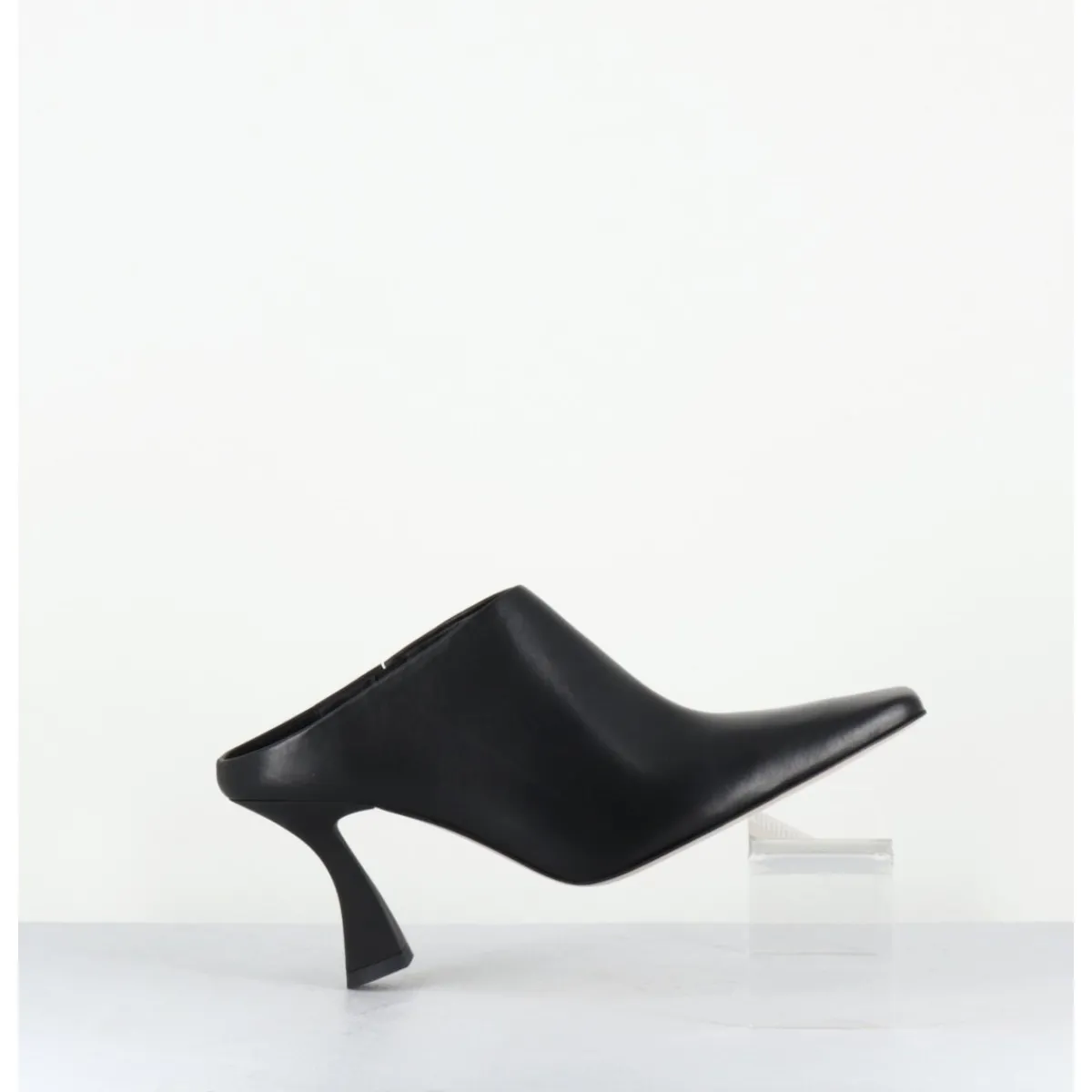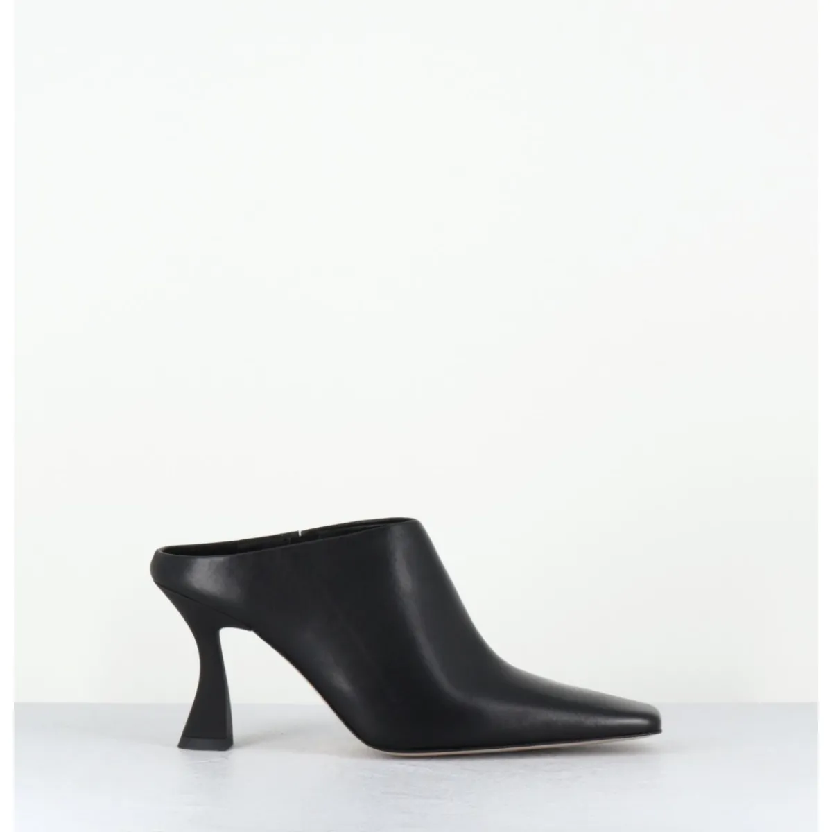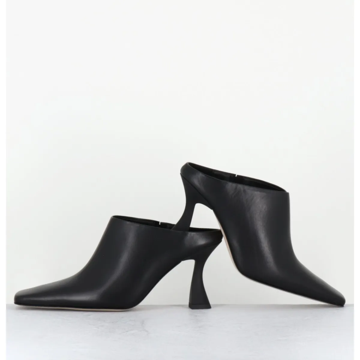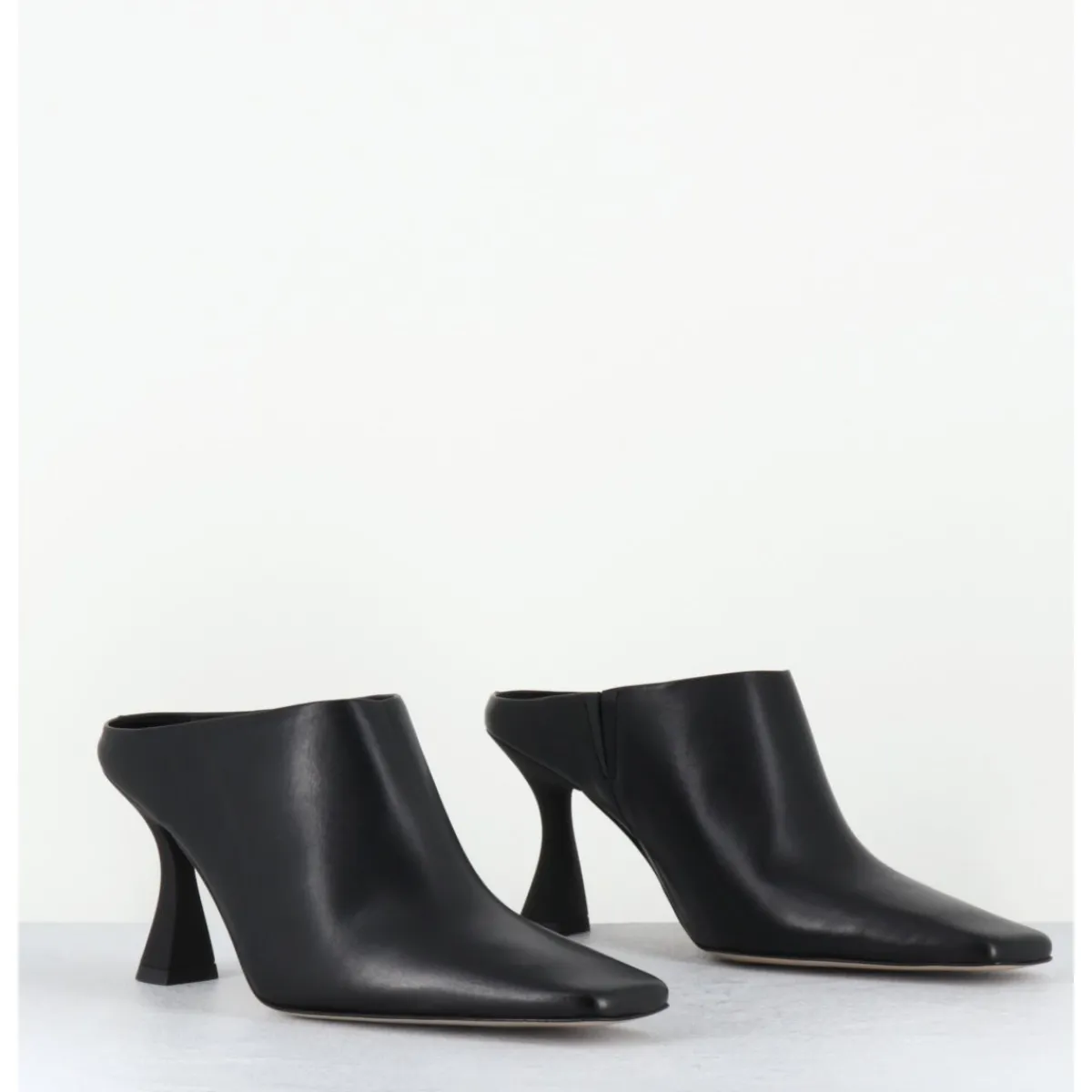 Mules en cuir noir, ligne effilée à bout carré, montées sur un haut talon stylisé en gomme mate