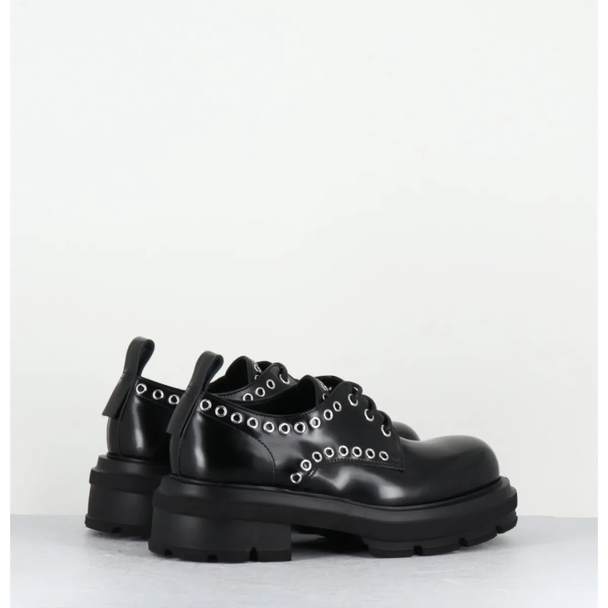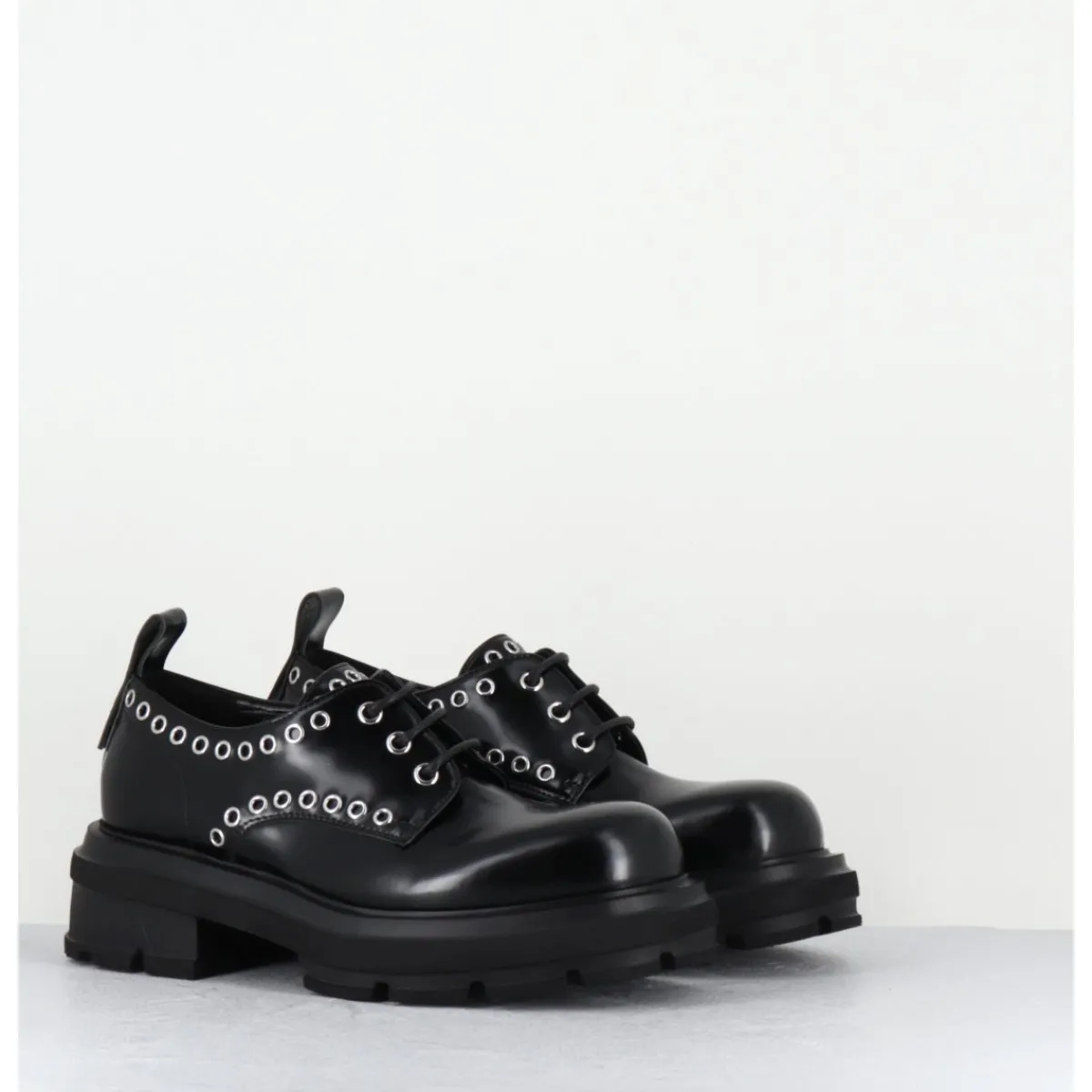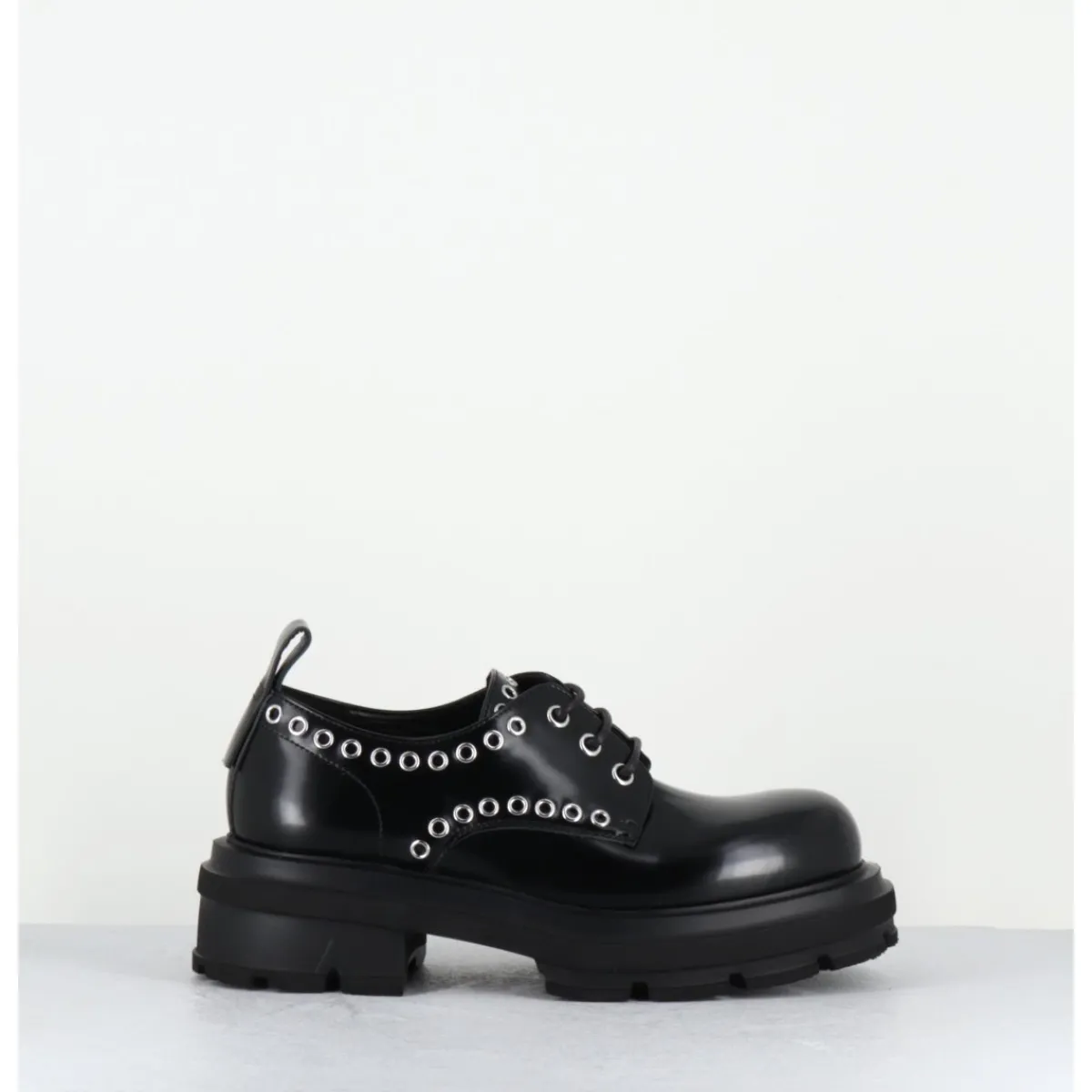 Derbies à lacets effet glacé noir, bout arrondi esprit années 90, rivets argentées, montées sur une semelle épaisse en gomme légère
