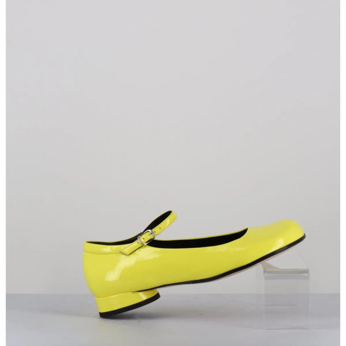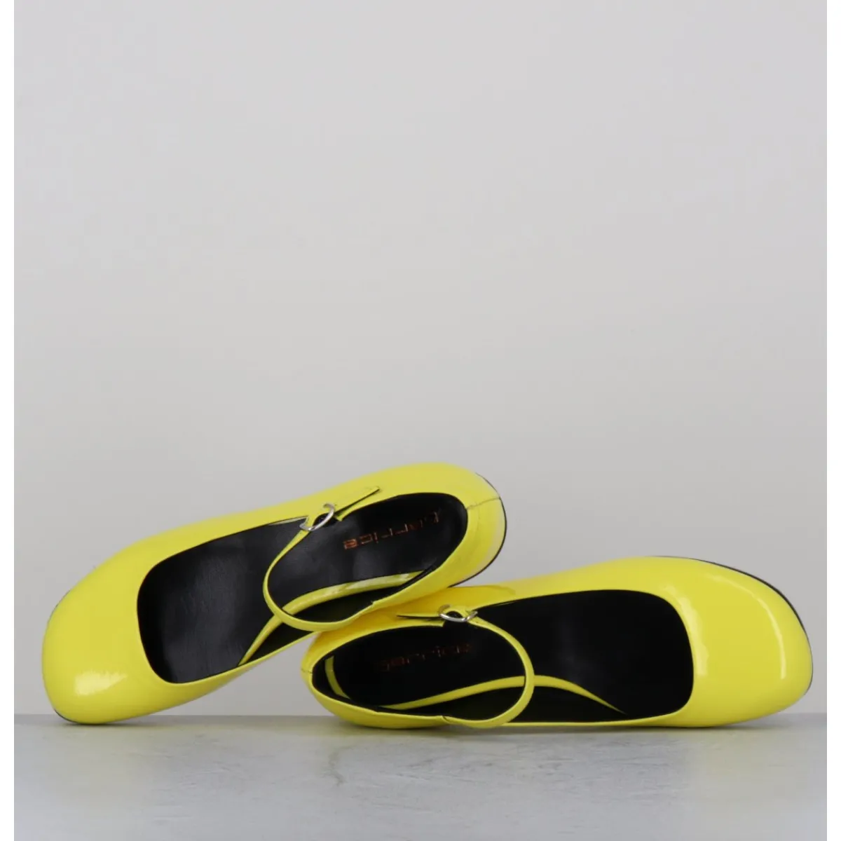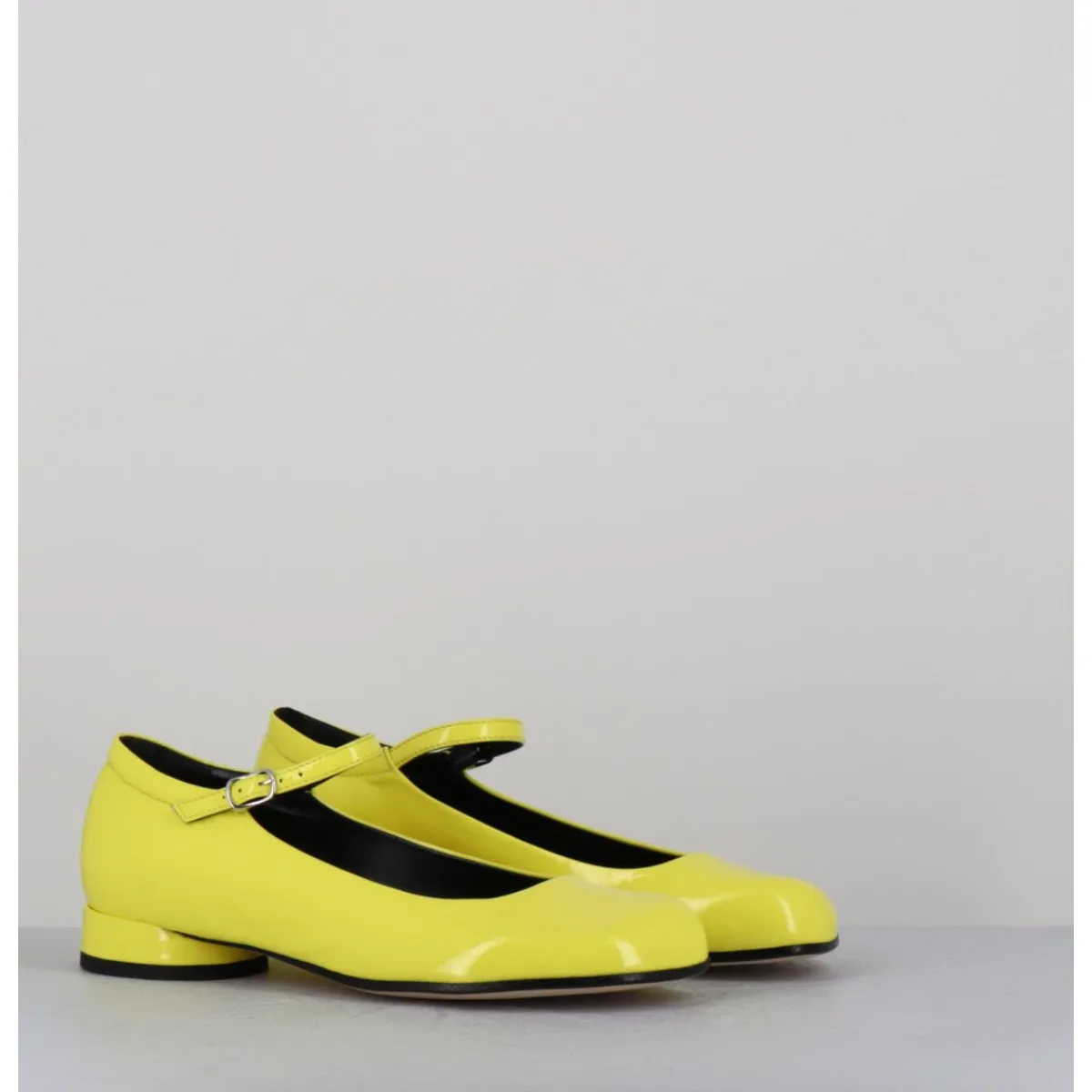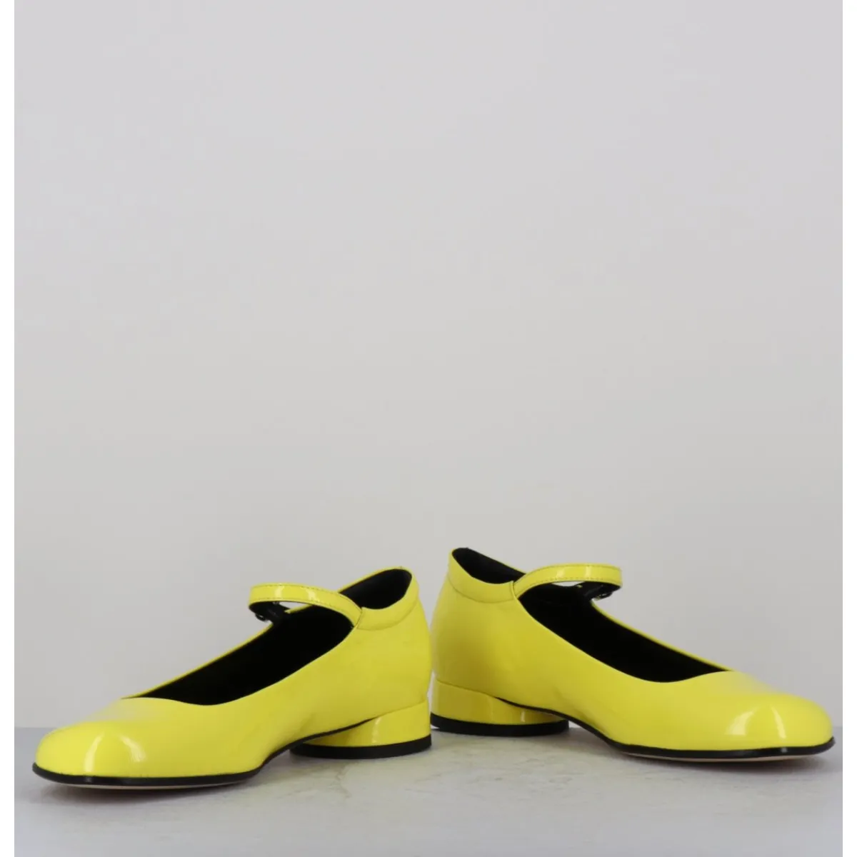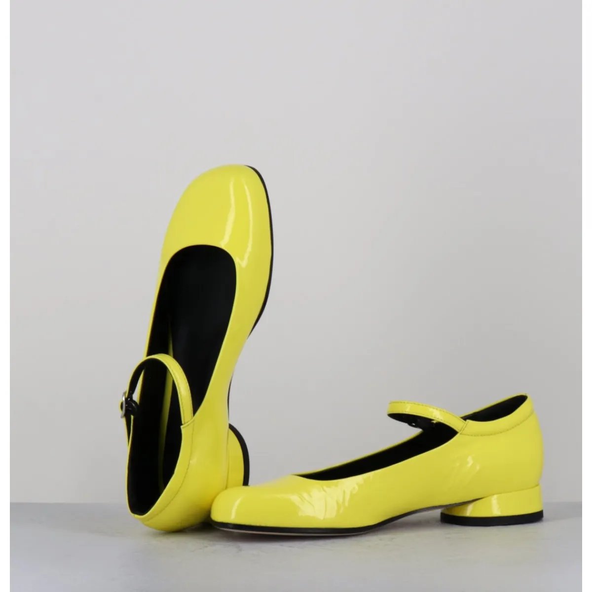 Chaussures babies en cuir vernis jaune souple, bride cheville réglable & bout très légèrement asymétrique, montées sur un petit talon cylindrique recouvert esprit années 60