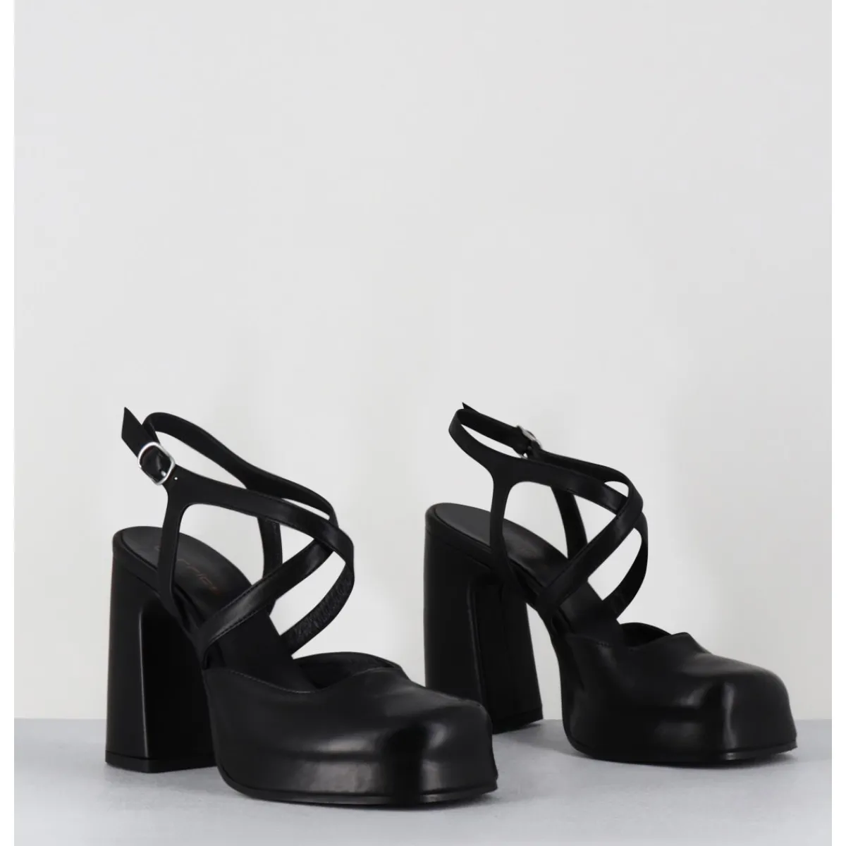 Babies à plateforme brides croisés en cuir noir souple, bout carré recouvert, ligne pure, montées sur un talon large stylisé