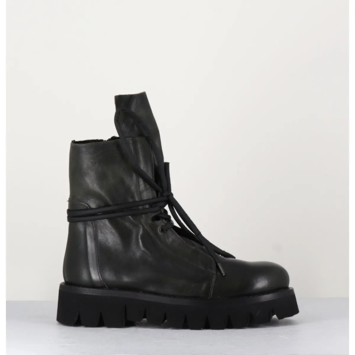 Boots esprit rangers en cuir vert bouteille, bout rond, zip intérieur, laçage textile, languette over size, montées sur une semelle épaisse crantée en micro-fibre extra légère.