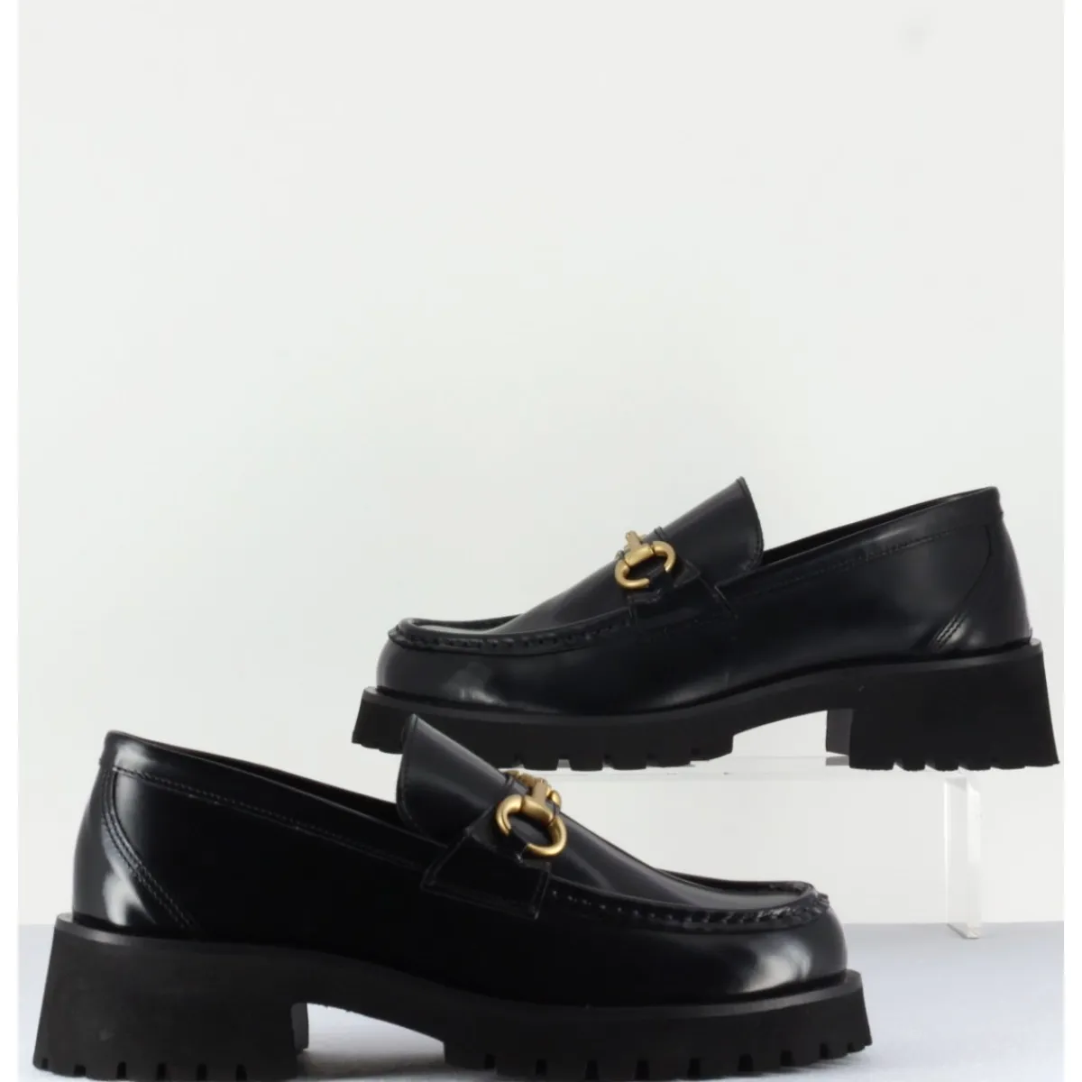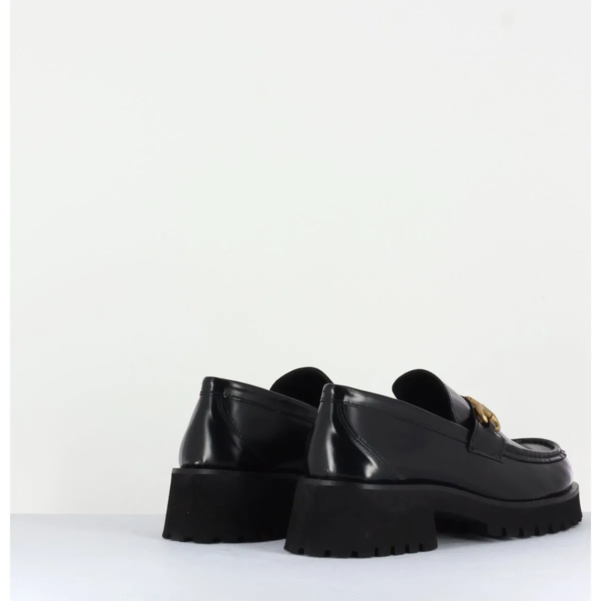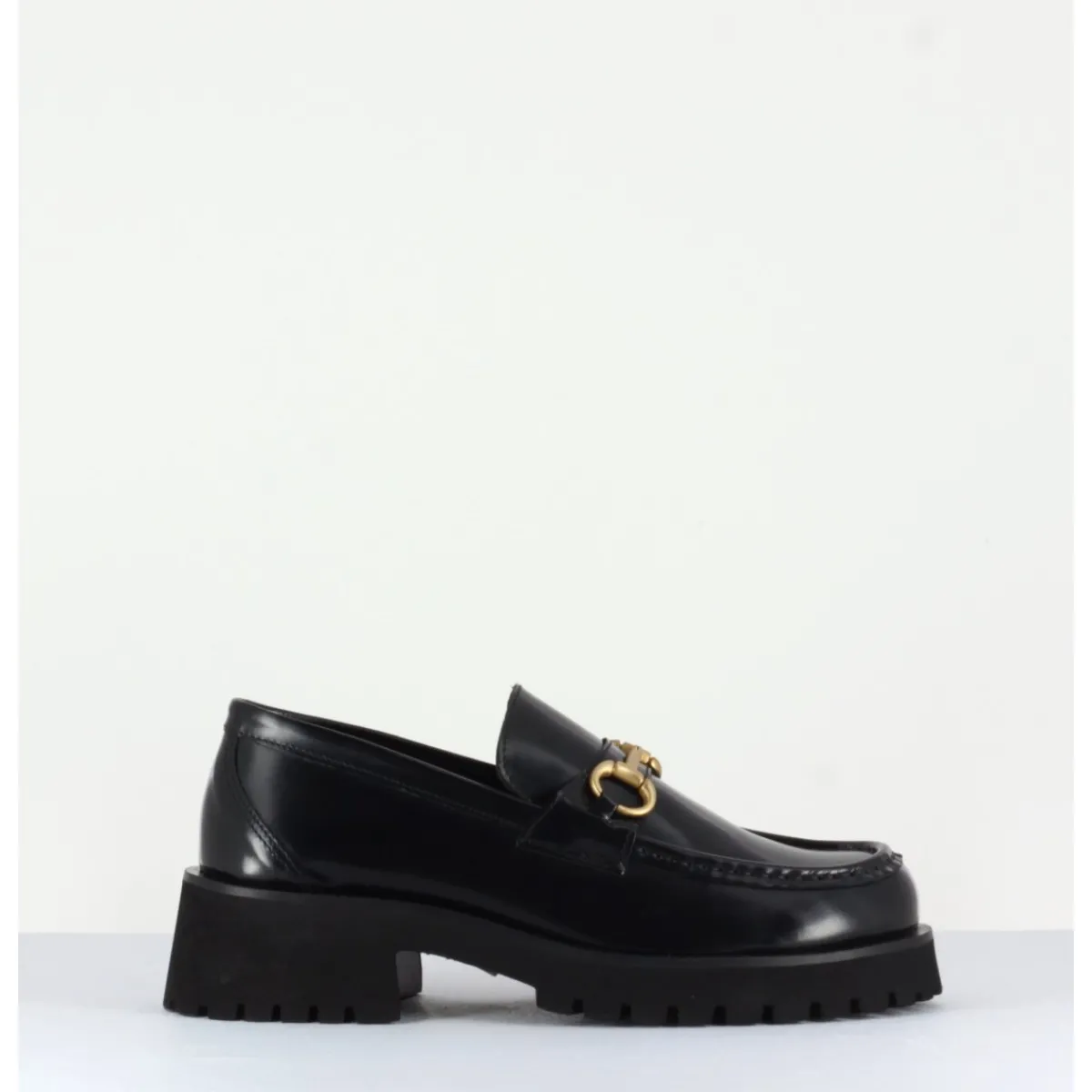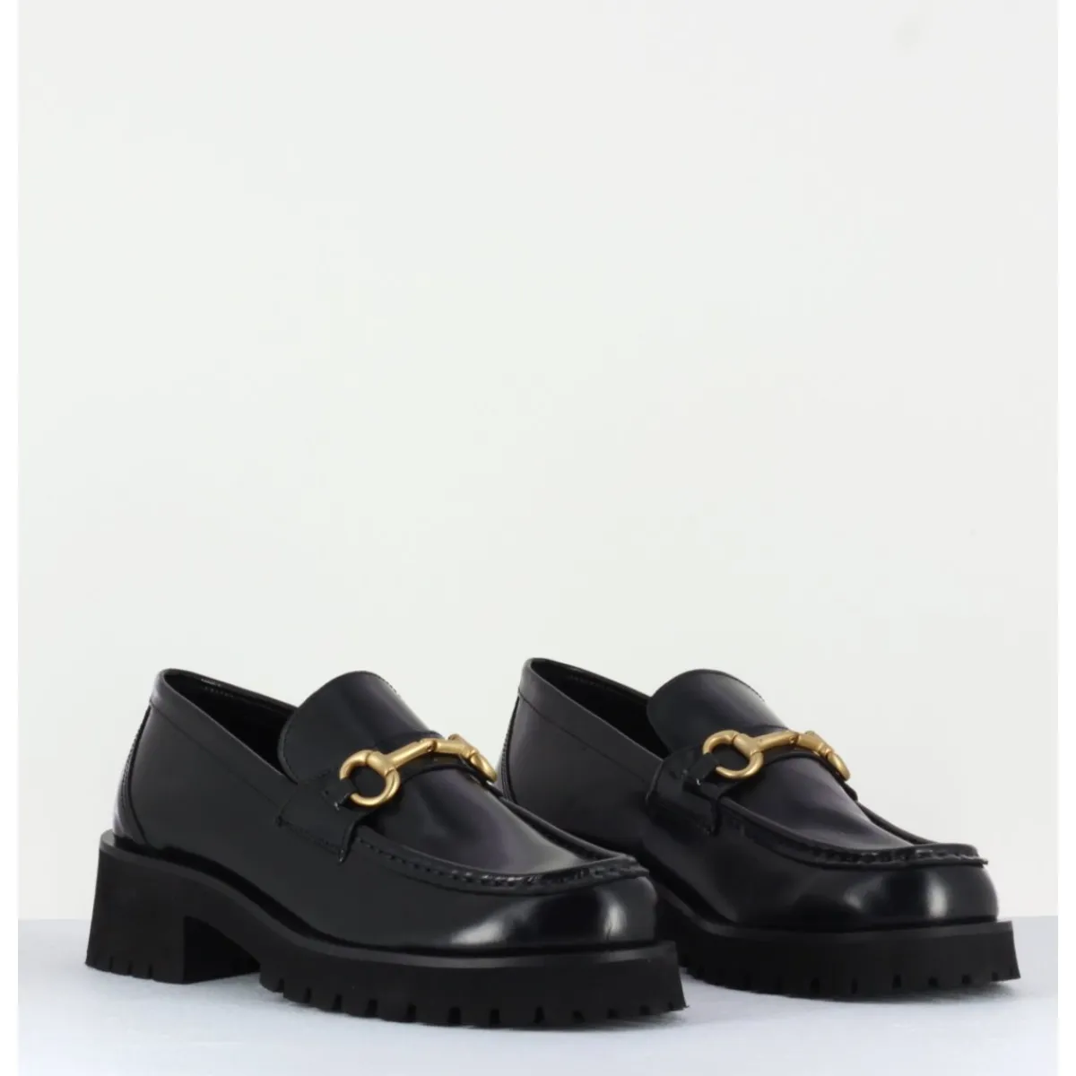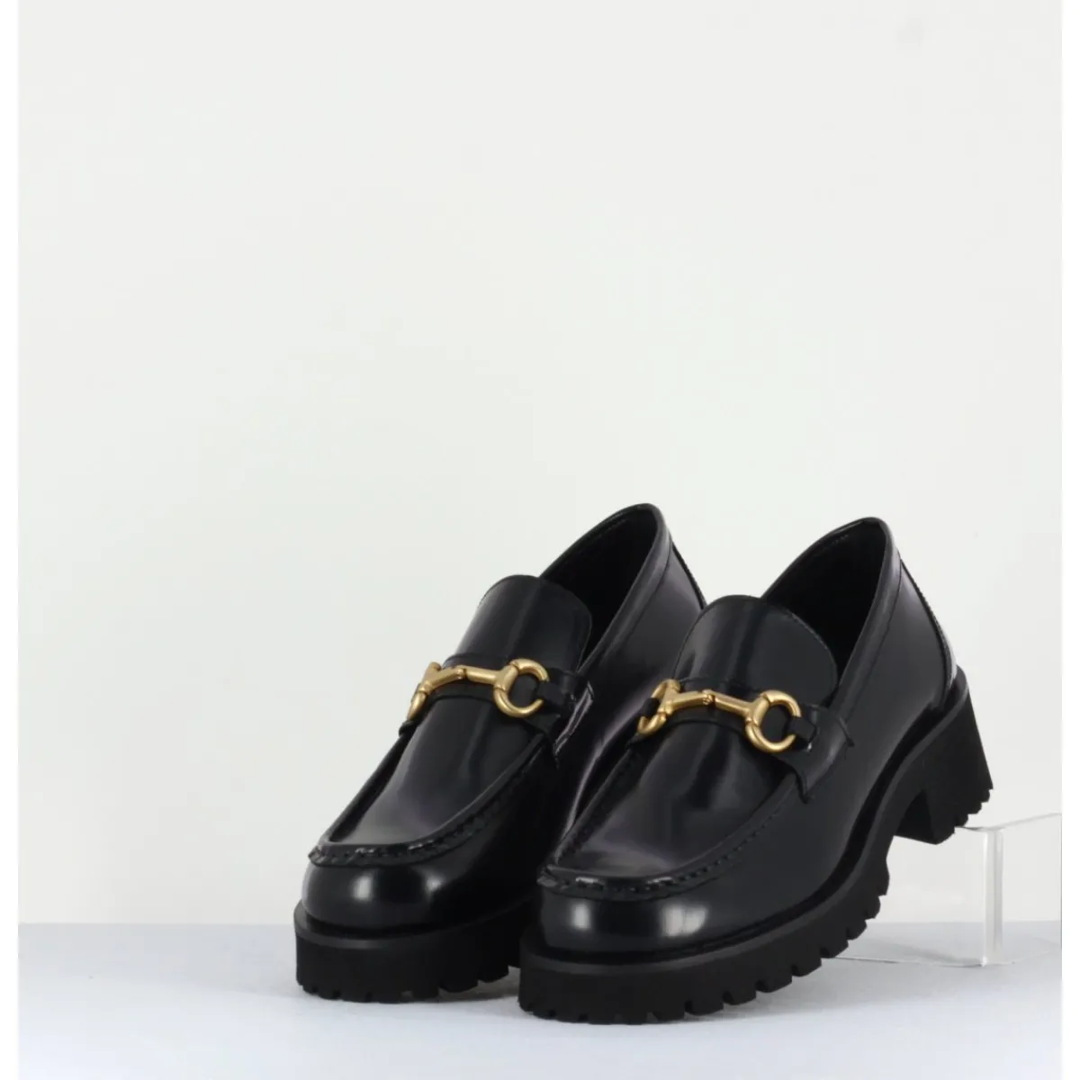 Mocassin style anglais en cuir glacé noir avec mors or mat et bout en amande à pointe légèrement carrée, montés sur une semelle épaisse en micro ultra-légère. Conçu dans les Ateliers Italiens.