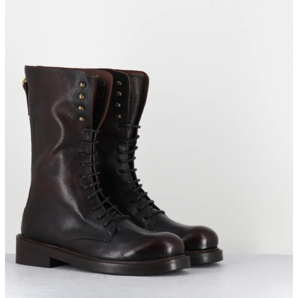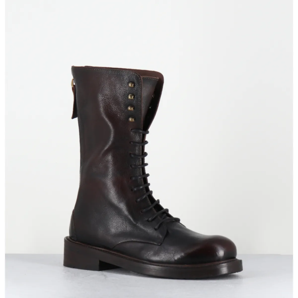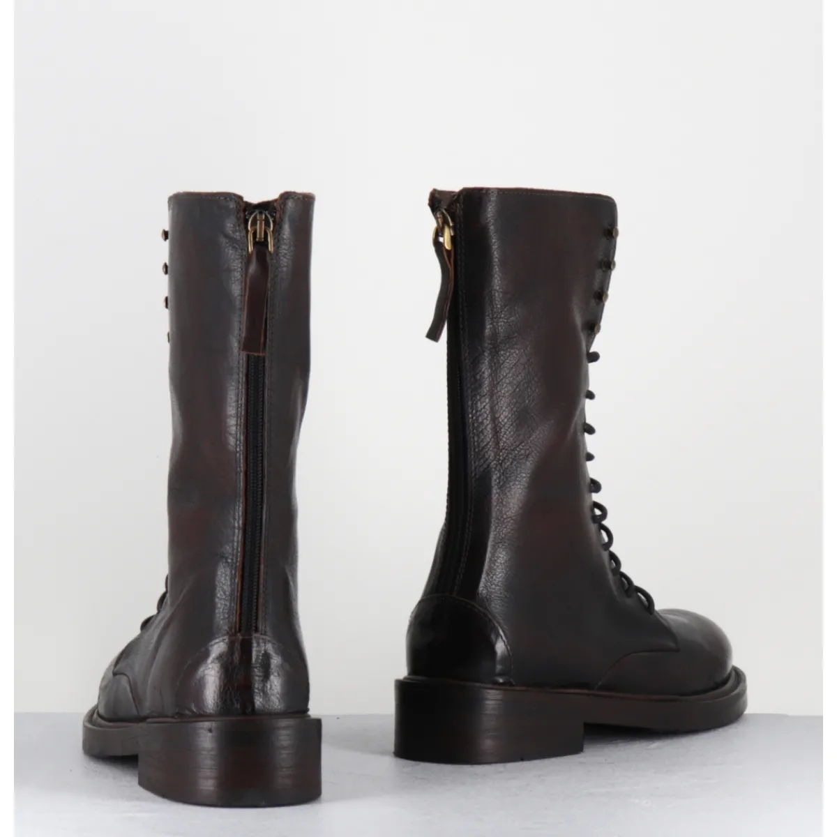 Boots rangers à lacets en cuir marron brossé au noir pour un effet ‘vintage’, bout rond , zip arrière, montées sur une semelle en gomme