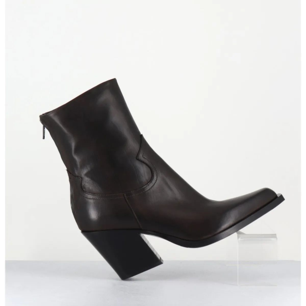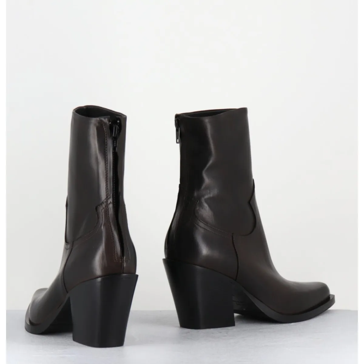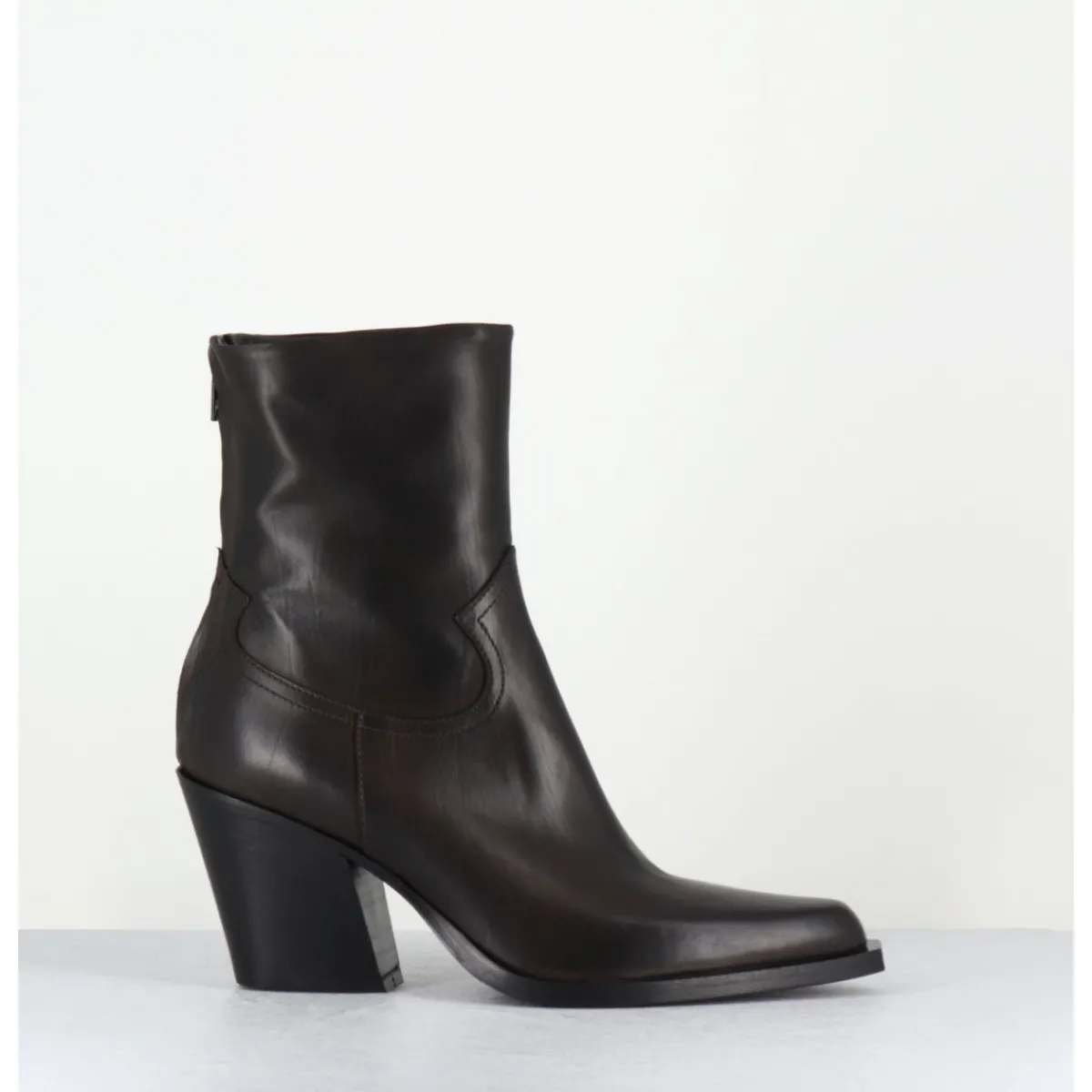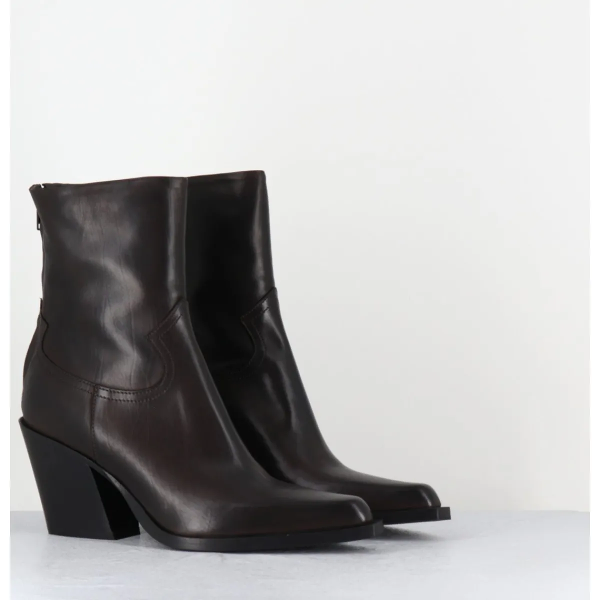 Boots Santiags en cuir marron chocolat souple, ligne pure à bout pointu avec petite pointe carrée, design traditionnel cousu, zip arrière, montées sur un talon haut biseauté.