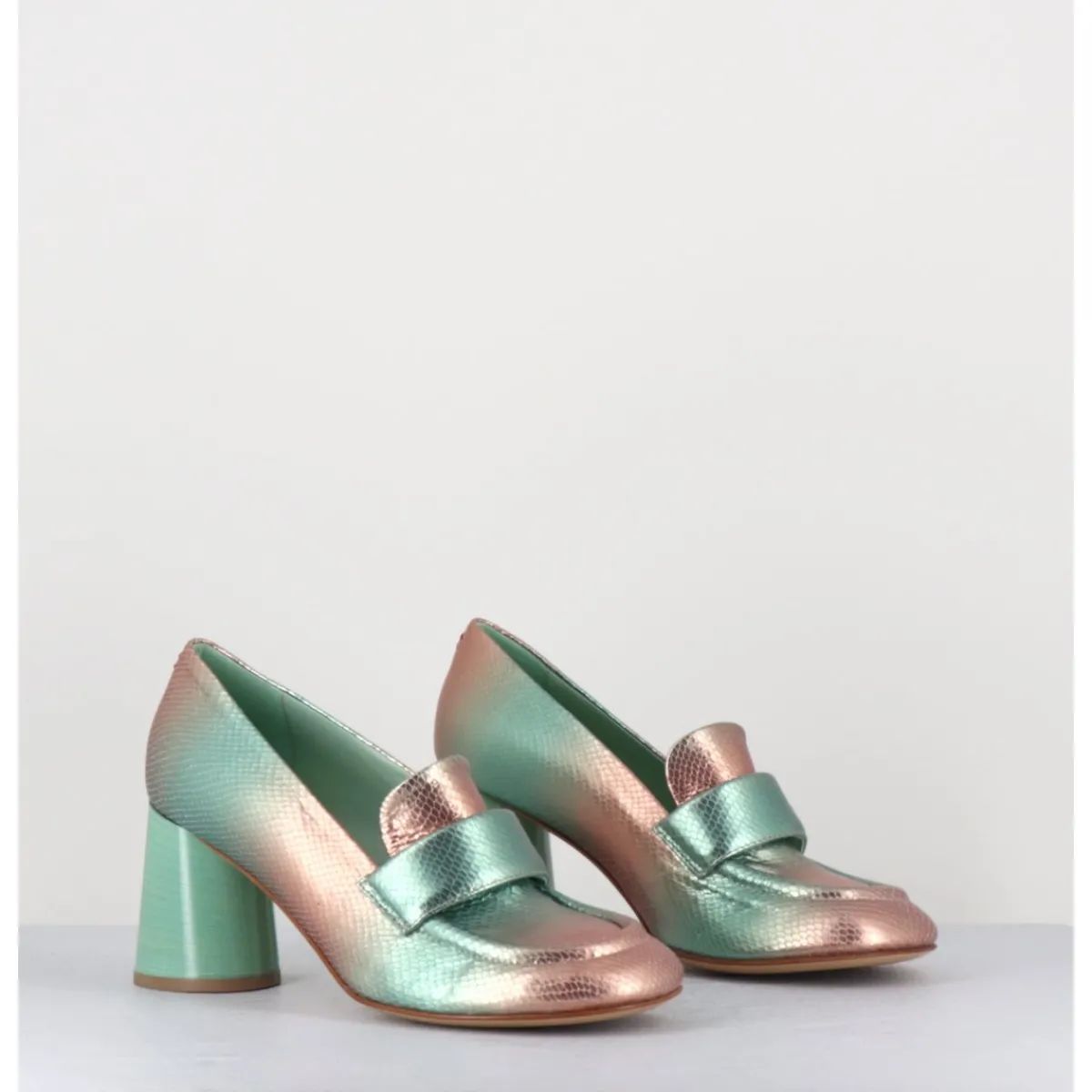 Mocassins à talon en cuir imprimé serpent métallisé vert d’eau & cuivre, bout très rond, couture signature de la maison sur le contrefort, montés sur un talon cylindrique légèrement évasé.