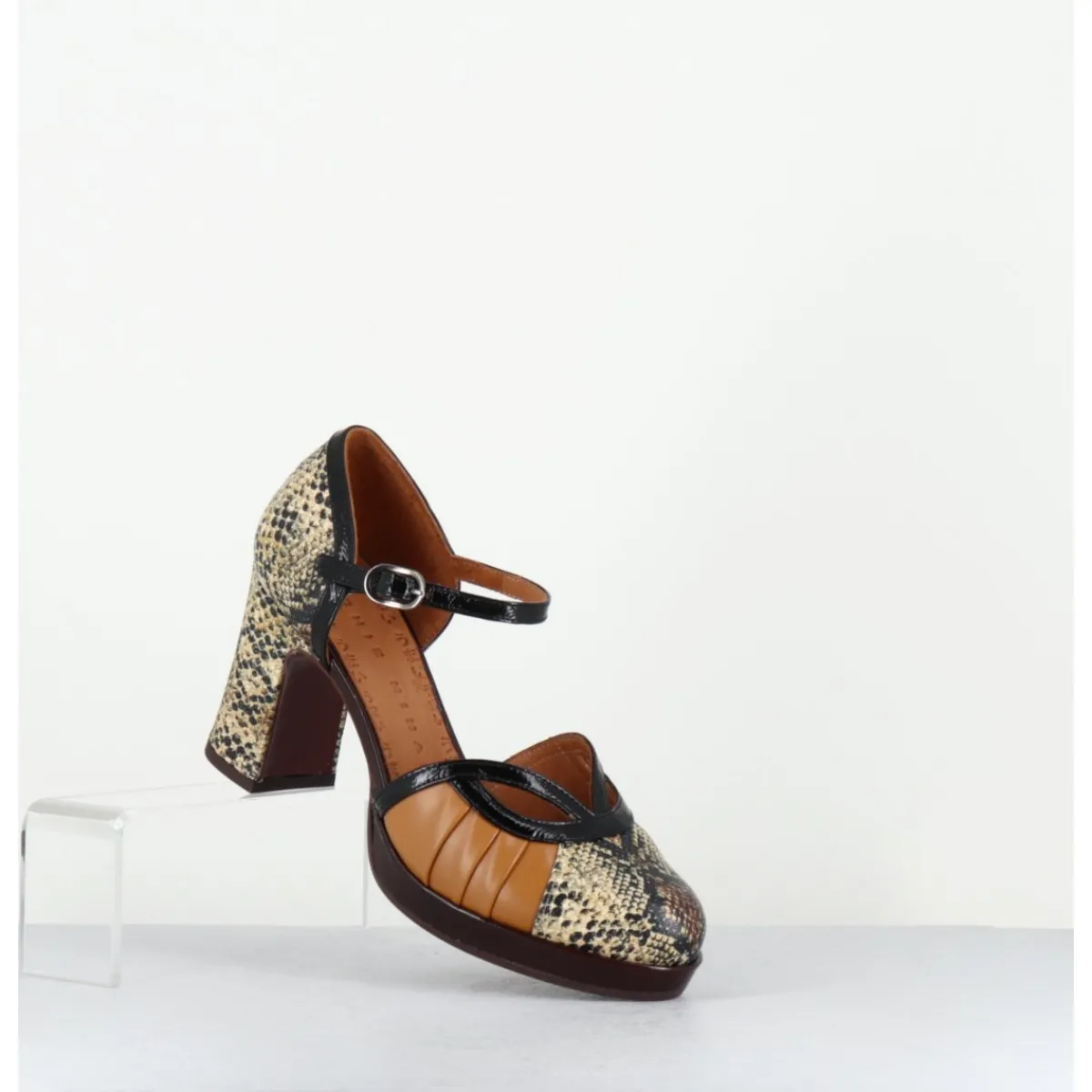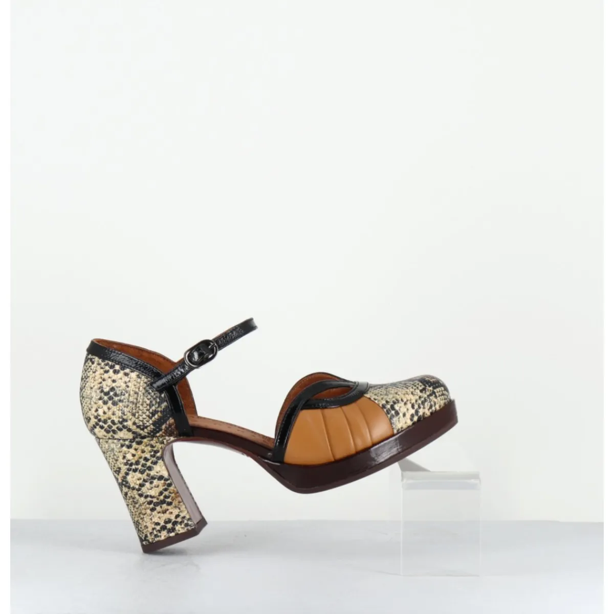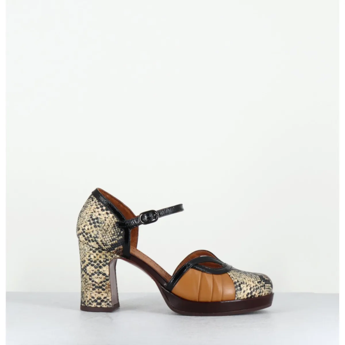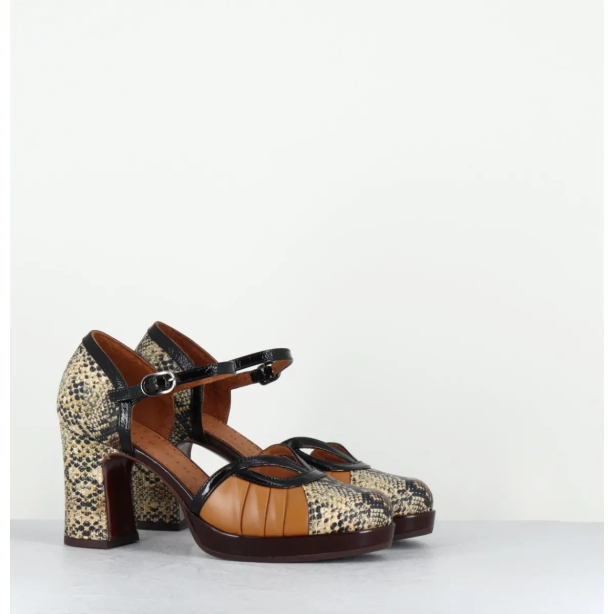 Chaussures babies à bride réglable en cuir imprimé serpent, détails ajourés à l’avant, montées sur une fine plateforme recouverte et un talon large confortable