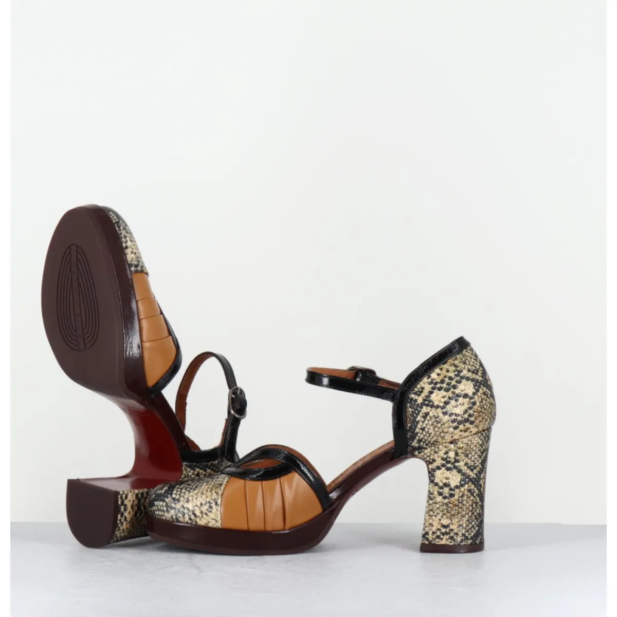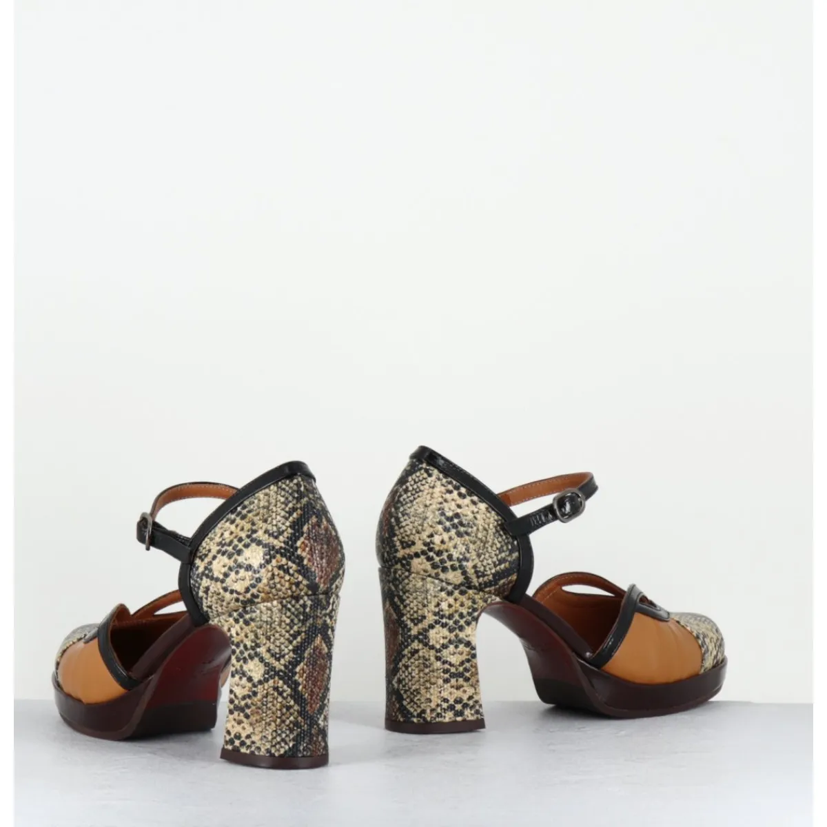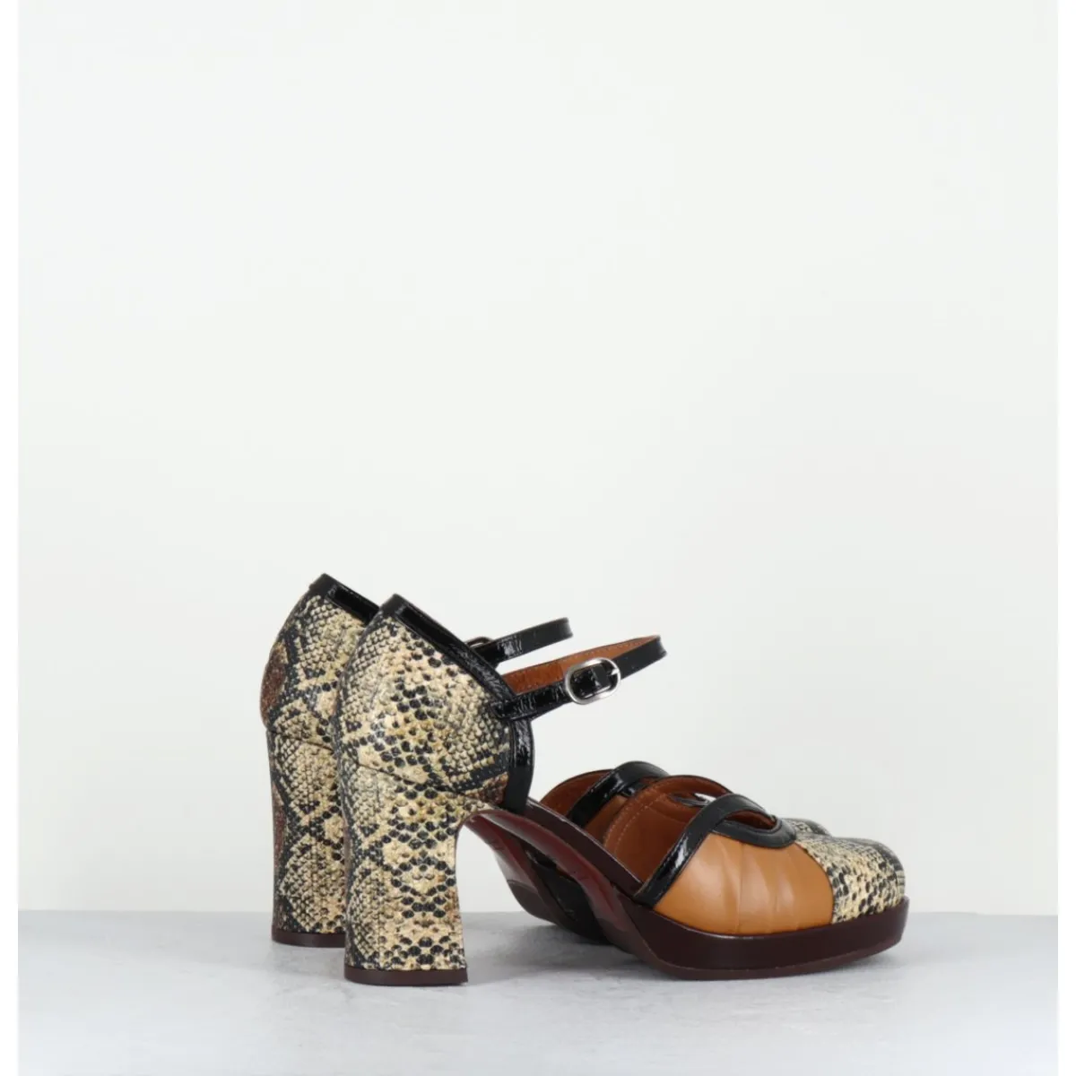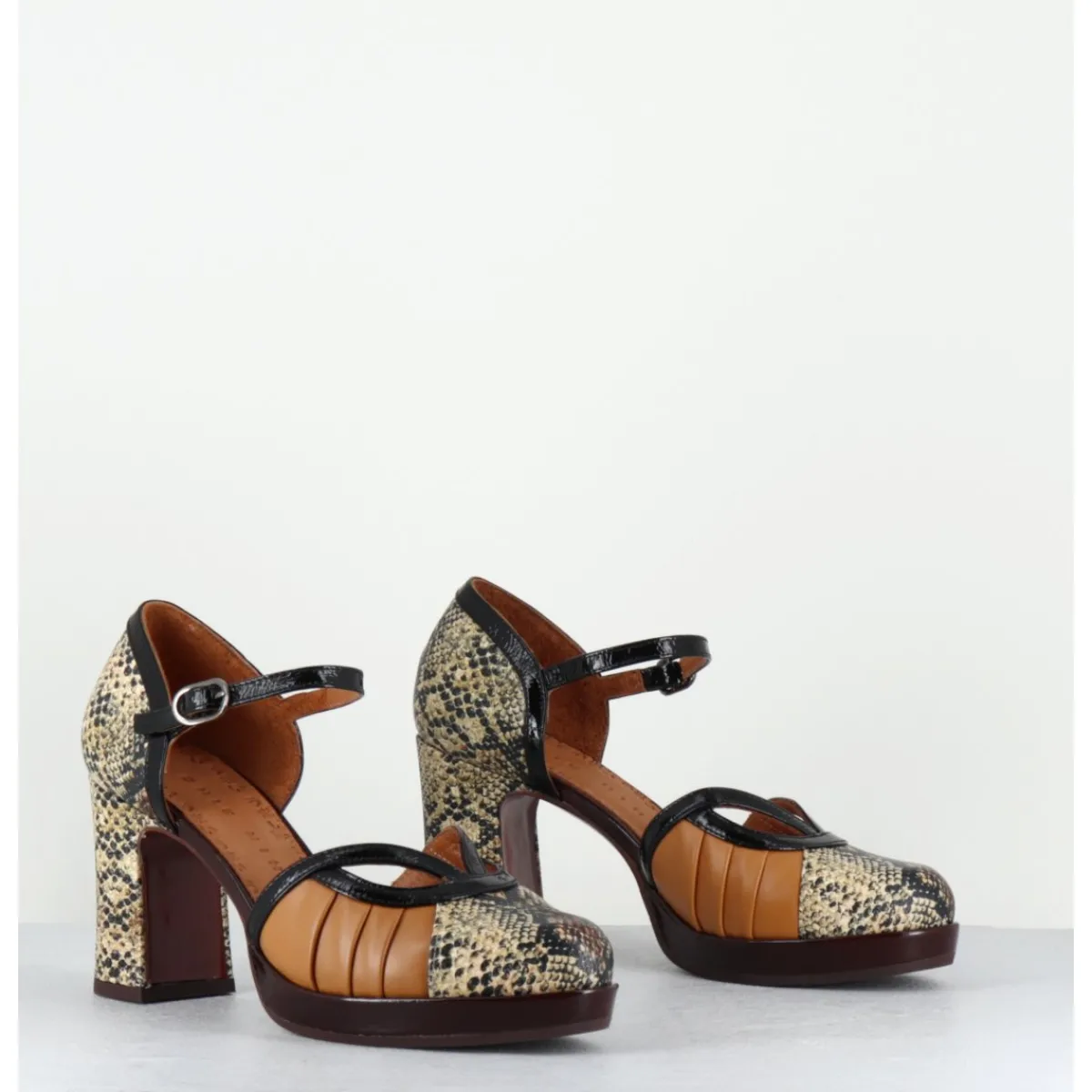 Chaussures babies à bride réglable en cuir imprimé serpent, détails ajourés à l’avant, montées sur une fine plateforme recouverte et un talon large confortable