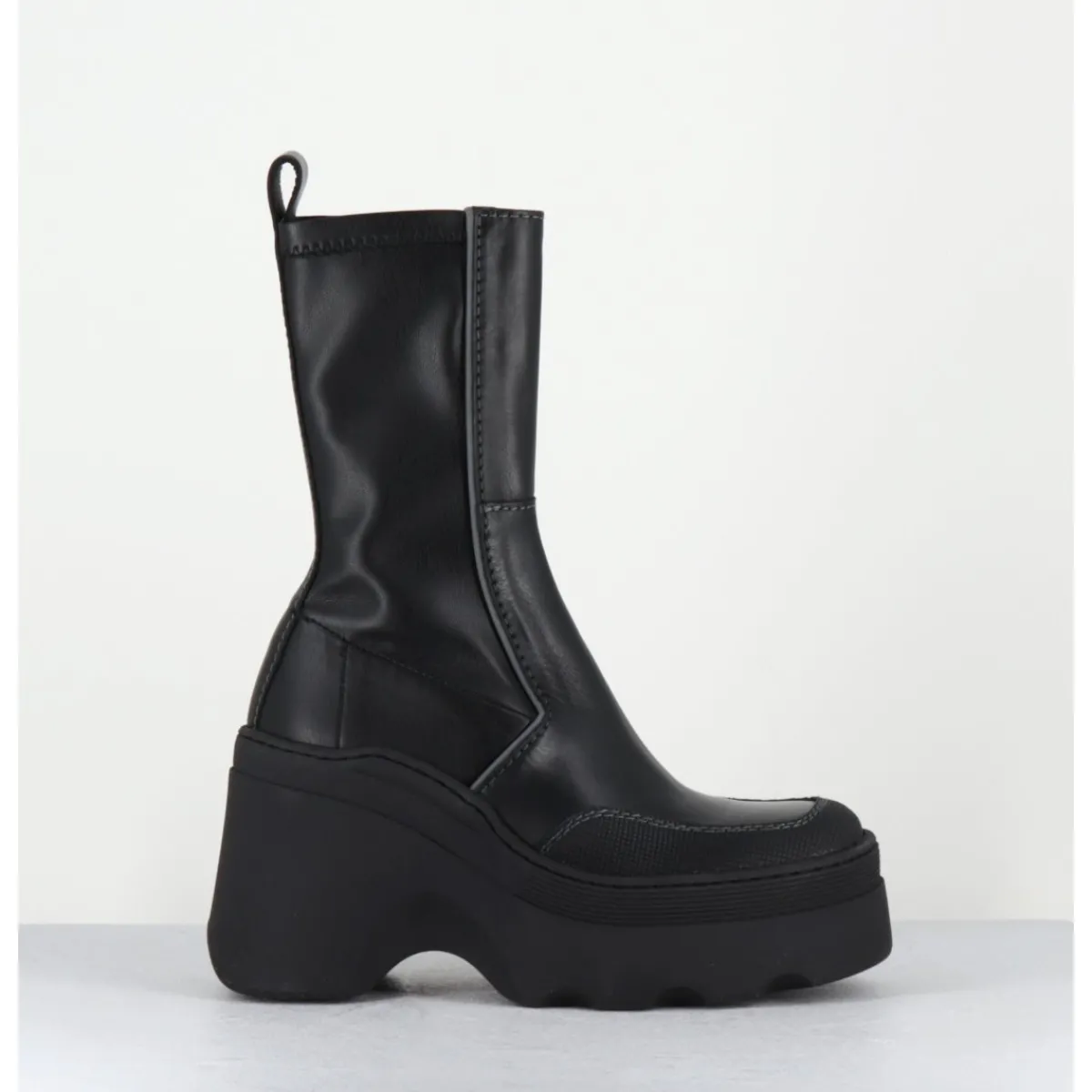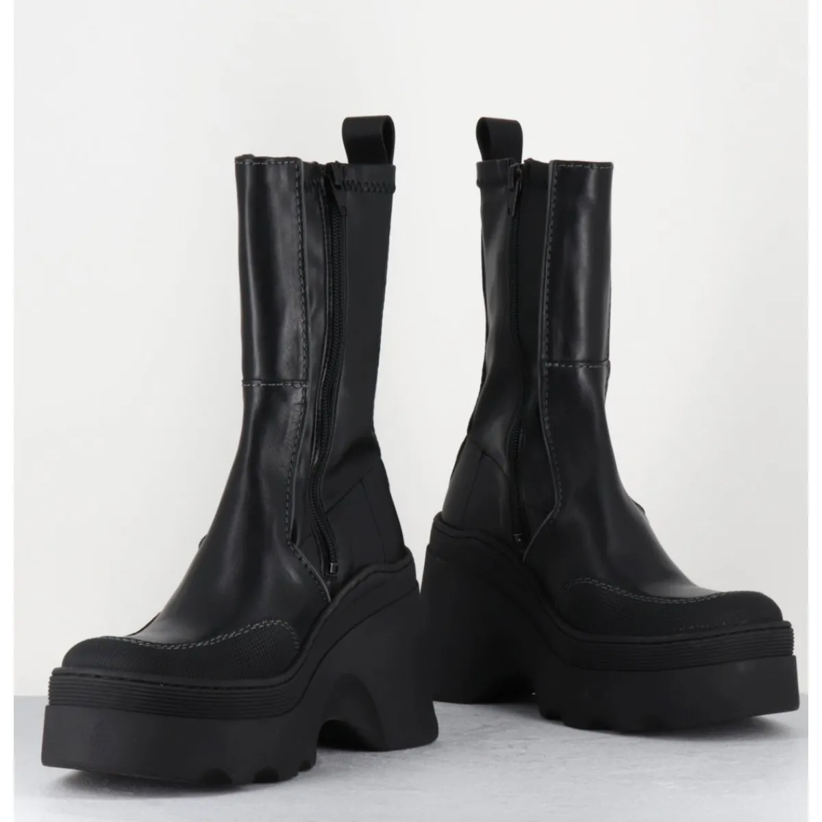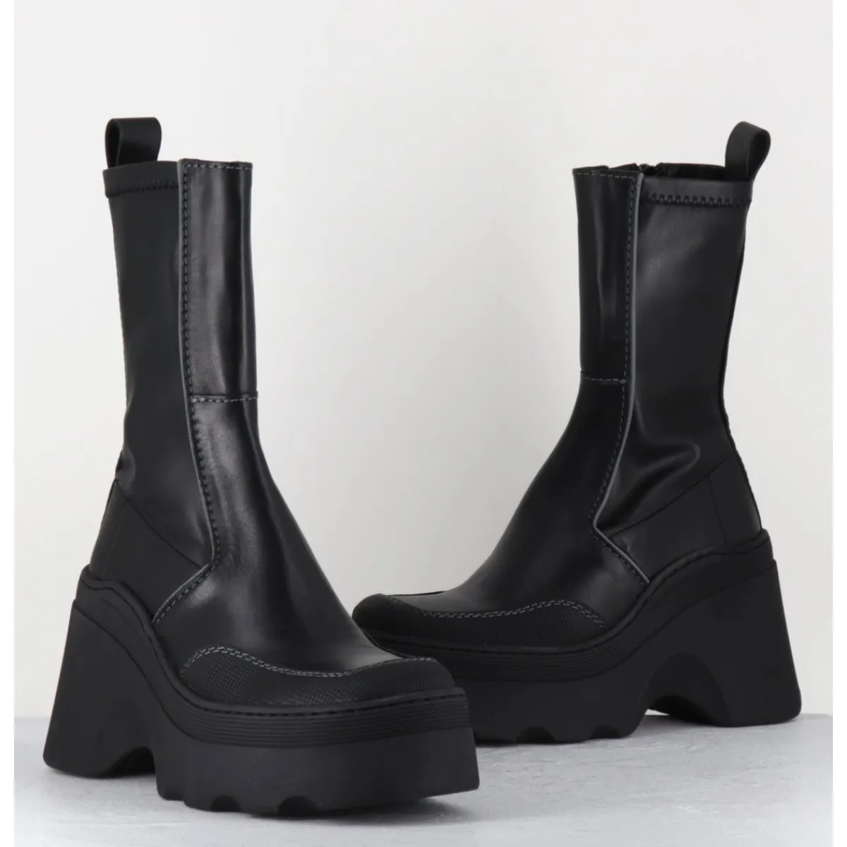 Boots réalisées à partir d’empiècements de cuir noir avec surpiqûres contrastantes, arrière en stretch pour un effet galbant sur la jambe; montées sur une semelle compensée esprit bratz