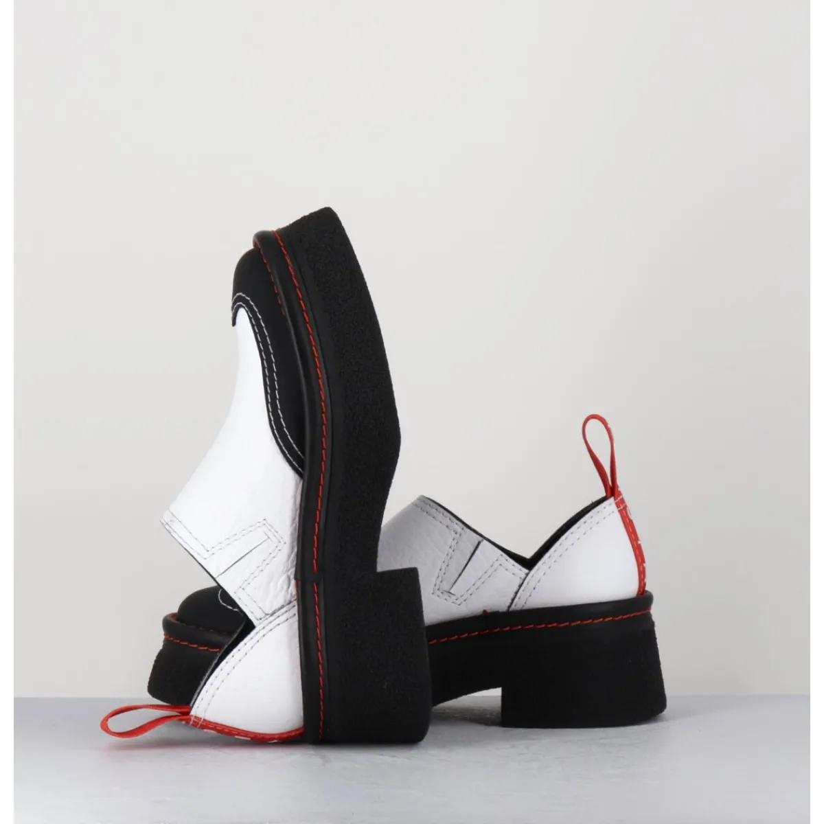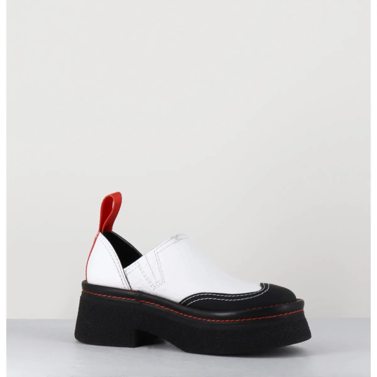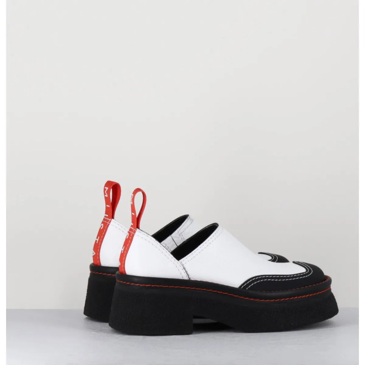 Entre le sabot et la mule, Odile est réalisé dans un cuir grainé blanc, découpe avec empiècement gomme noire à l’avant & surpiqures blanches, bout arrondi esprit 90s, montées sur une semelle épaisse en gomme texturé avec surpiqures orange contrastantes et un petit talon confortable légèrement évasé, signature de la Maison Miista à l’arrière de la chaussure