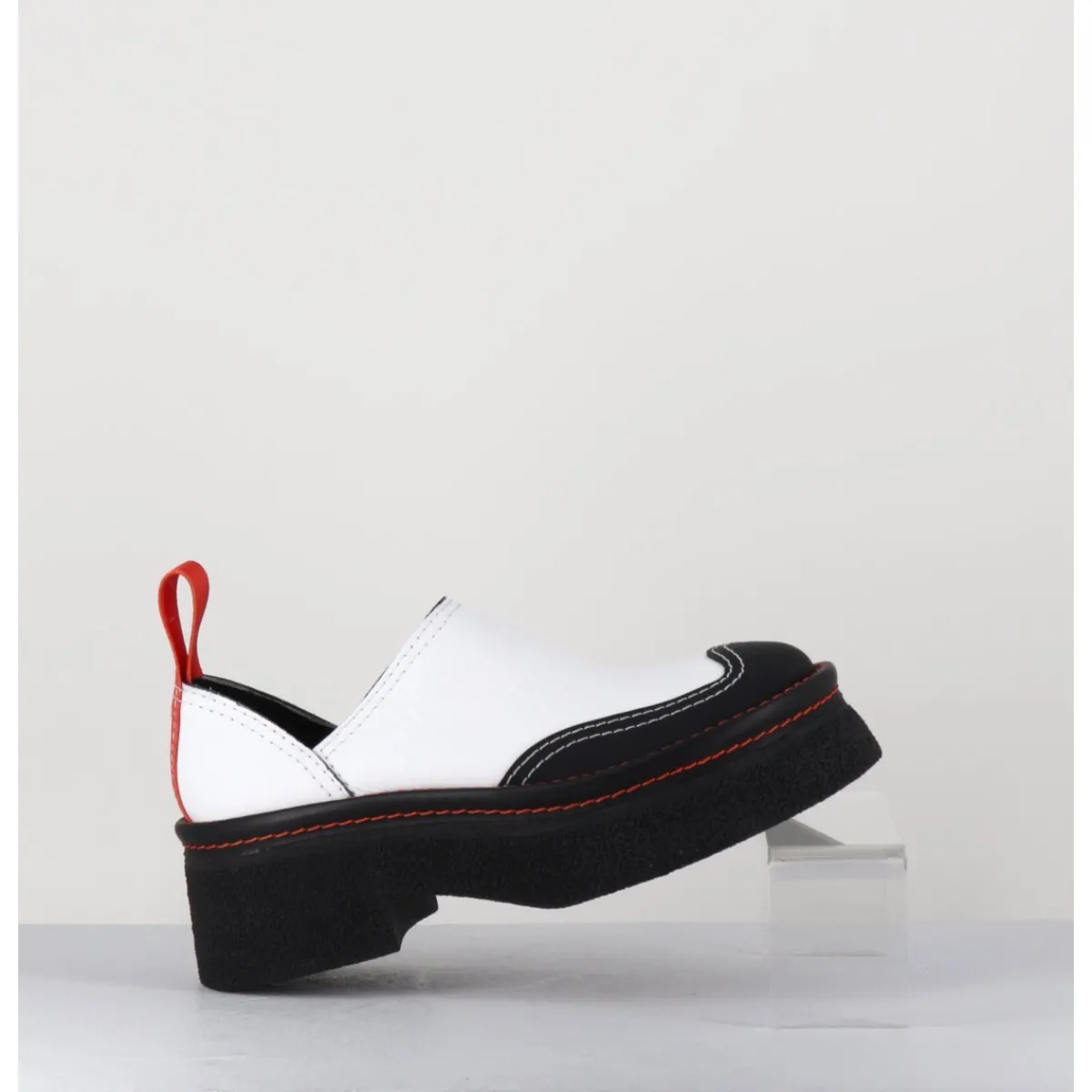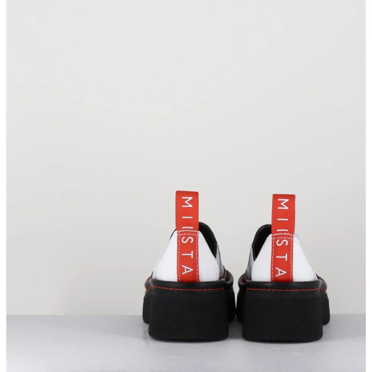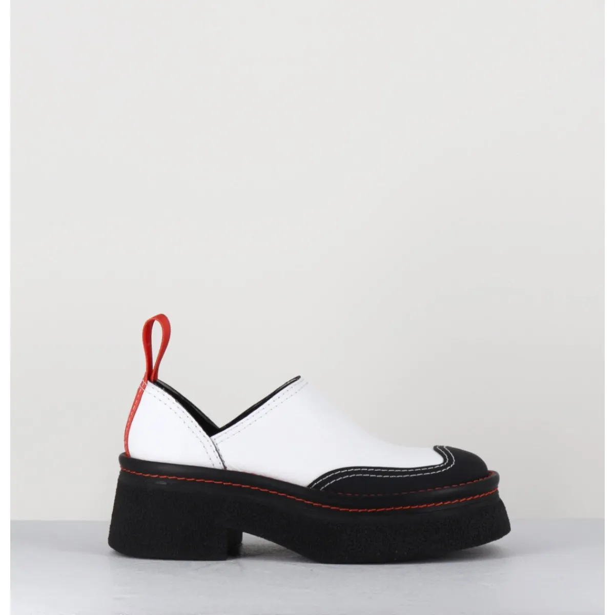 Entre le sabot et la mule, Odile est réalisé dans un cuir grainé blanc, découpe avec empiècement gomme noire à l’avant & surpiqures blanches, bout arrondi esprit 90s, montées sur une semelle épaisse en gomme texturé avec surpiqures orange contrastantes et un petit talon confortable légèrement évasé, signature de la Maison Miista à l’arrière de la chaussure