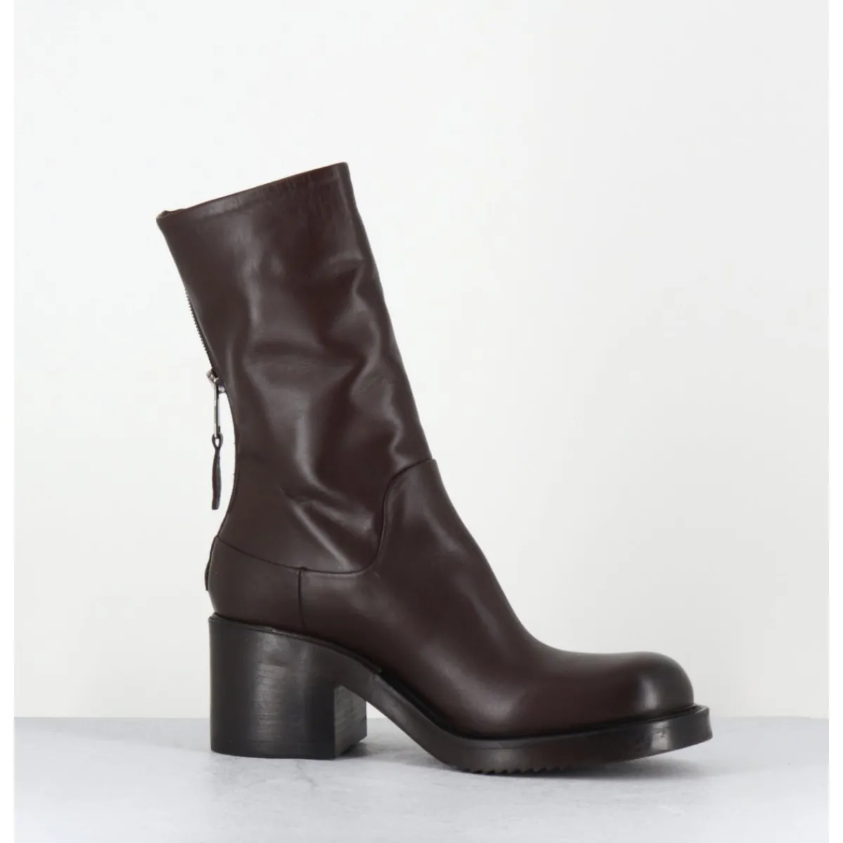 Boots en cuir souple marron chocolat, ligne pure esprit bikers avec zip arrière, montées sur un talon bloc et une semelle en gomme légère