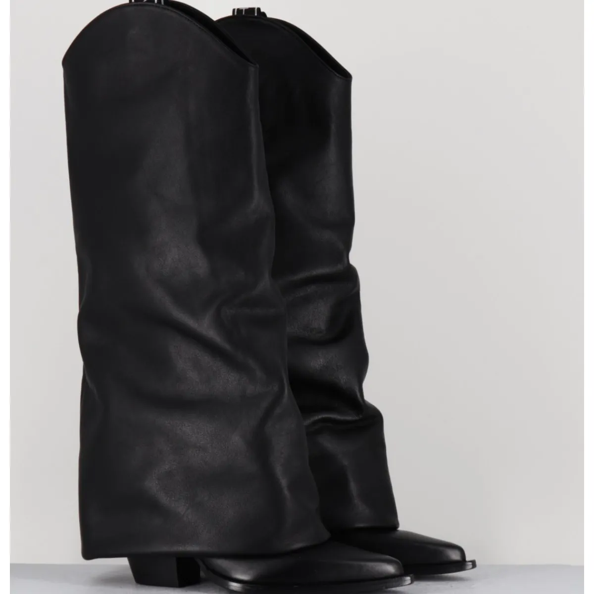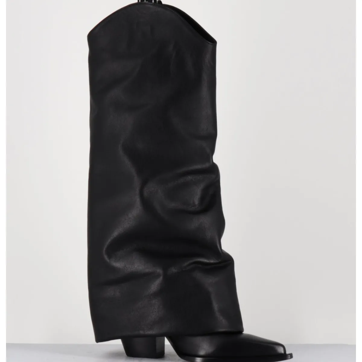 Bottes Santiag à guêtre en cuir souple noir effet froissé, montées sur une semelle en cuir noir et un talon haut biseauté