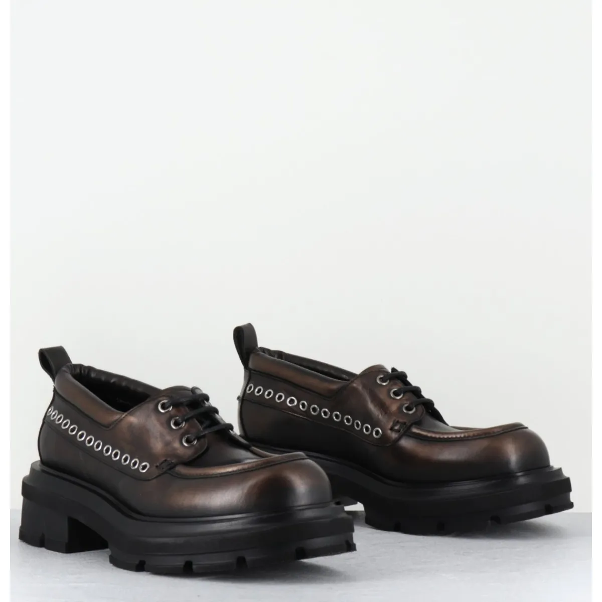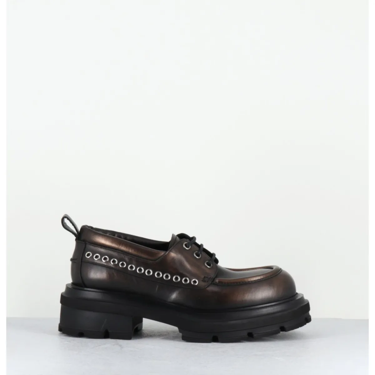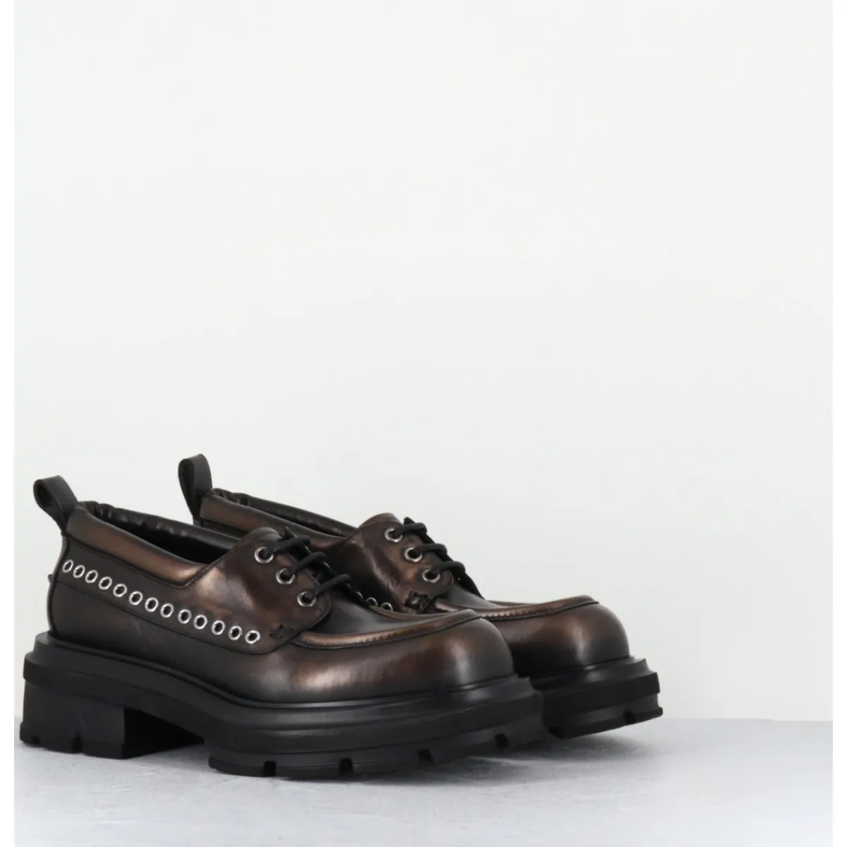 Derbies à lacets en cuir effet vieilli marron métallisé bronze , bout arrondi & design esprit années 90, rivets argentées, montées sur une semelle épaisse en gomme légère
