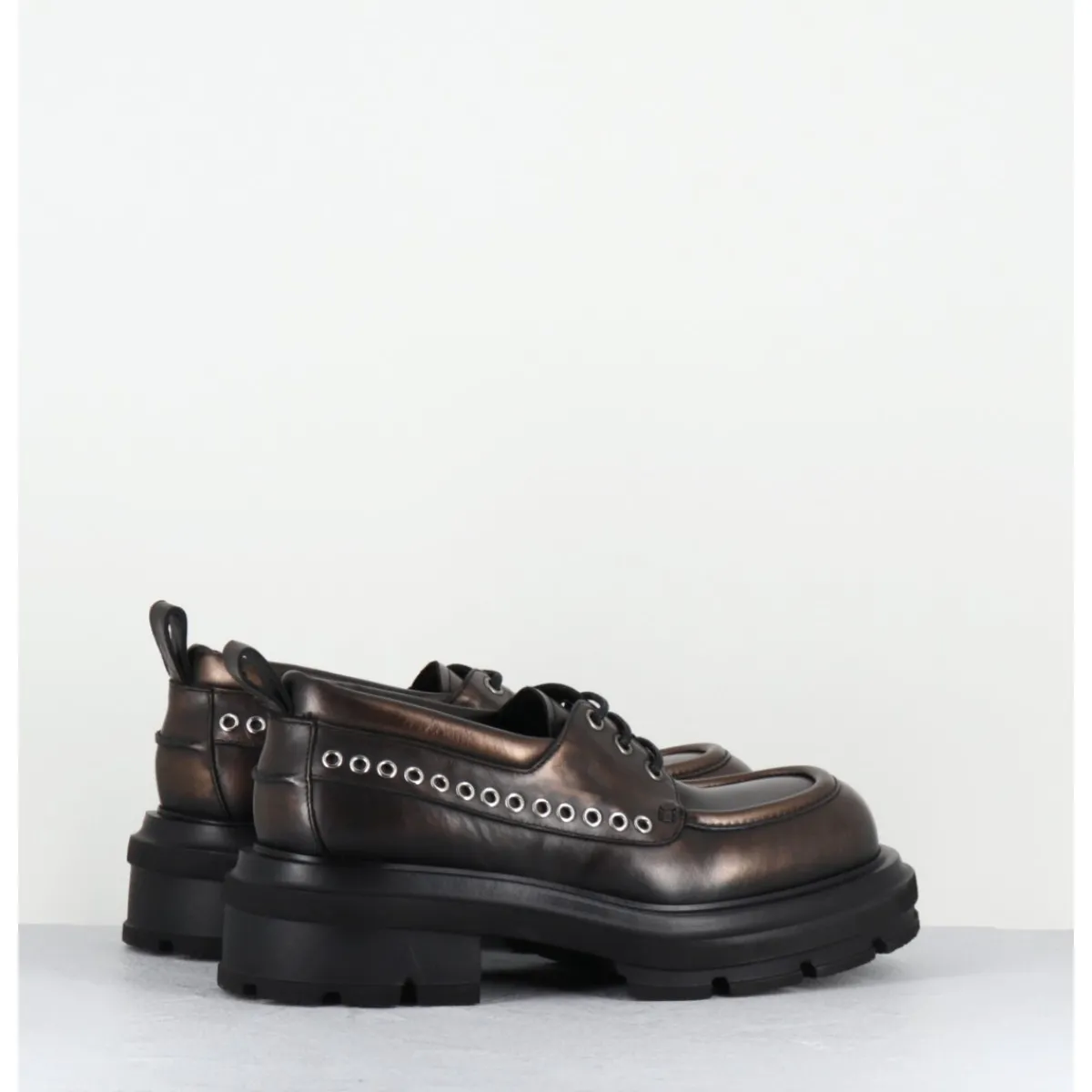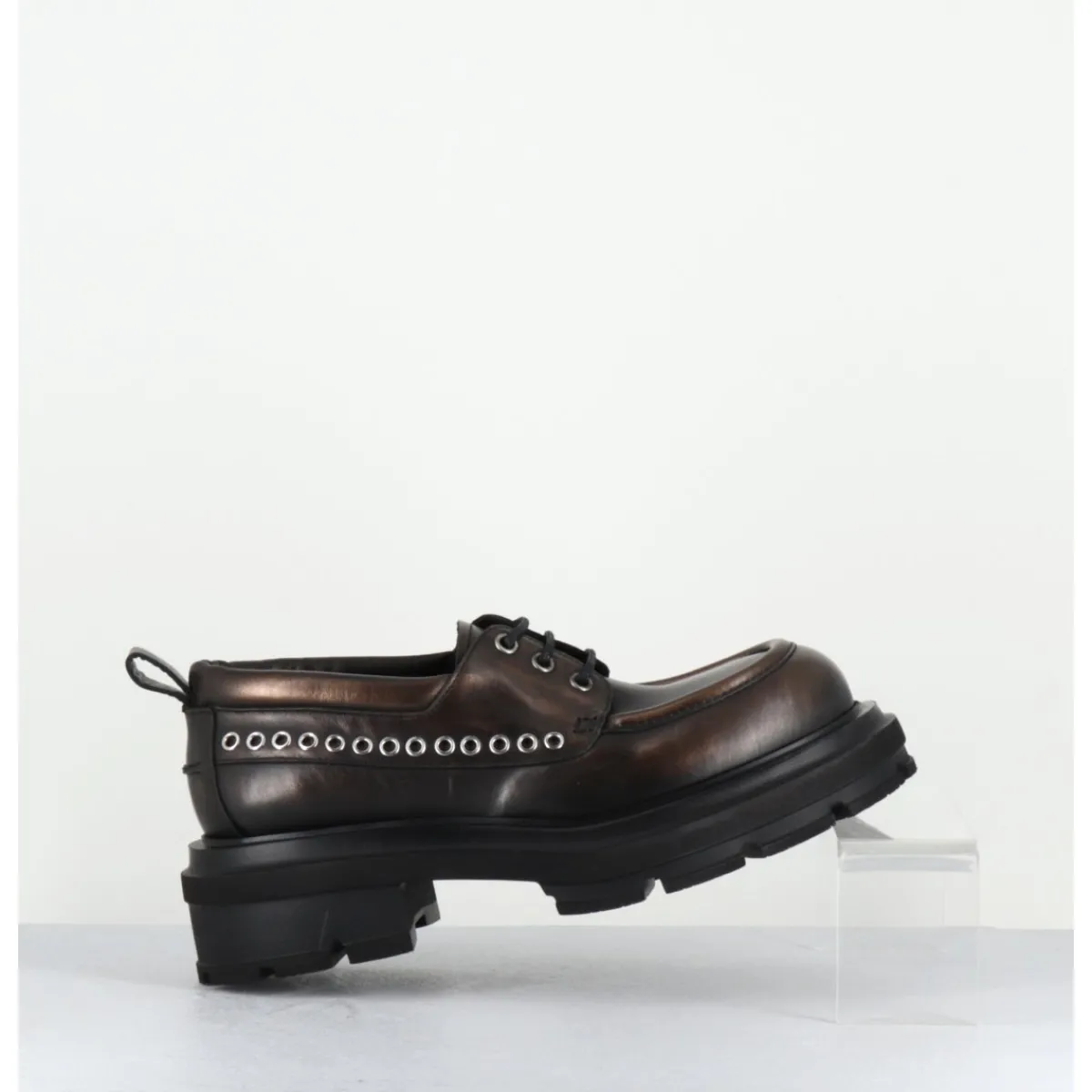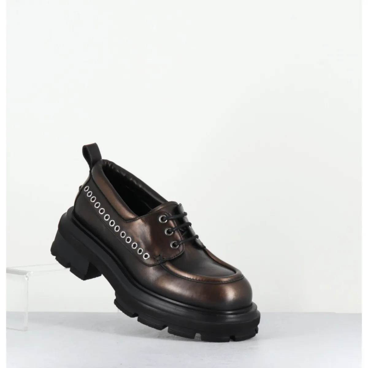 Derbies à lacets en cuir effet vieilli marron métallisé bronze , bout arrondi & design esprit années 90, rivets argentées, montées sur une semelle épaisse en gomme légère