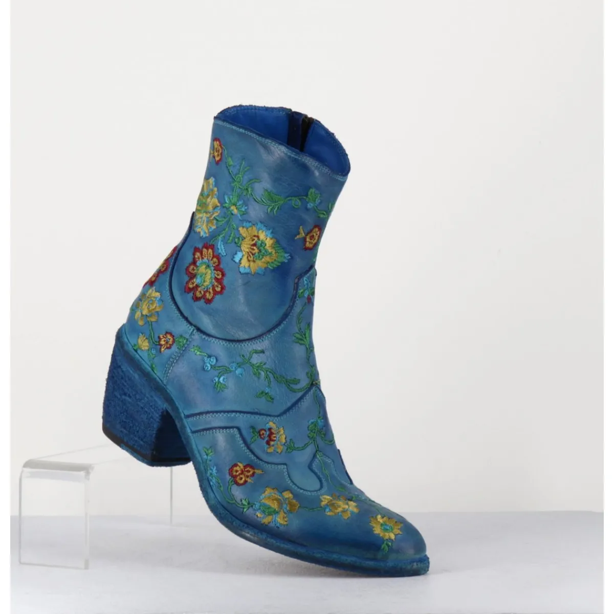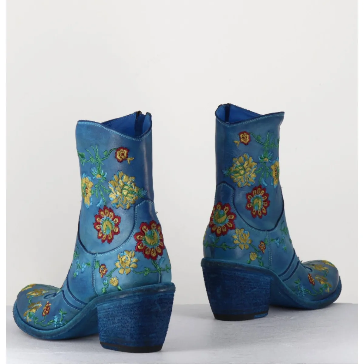 Boots esprit santiags en cuir bleu, ornées de broderies motif fleurs jaune/rouge/vert/bleu, surpiqûres traditionnelles, montées sur une semelle cousue main et un talon biseauté confortable.