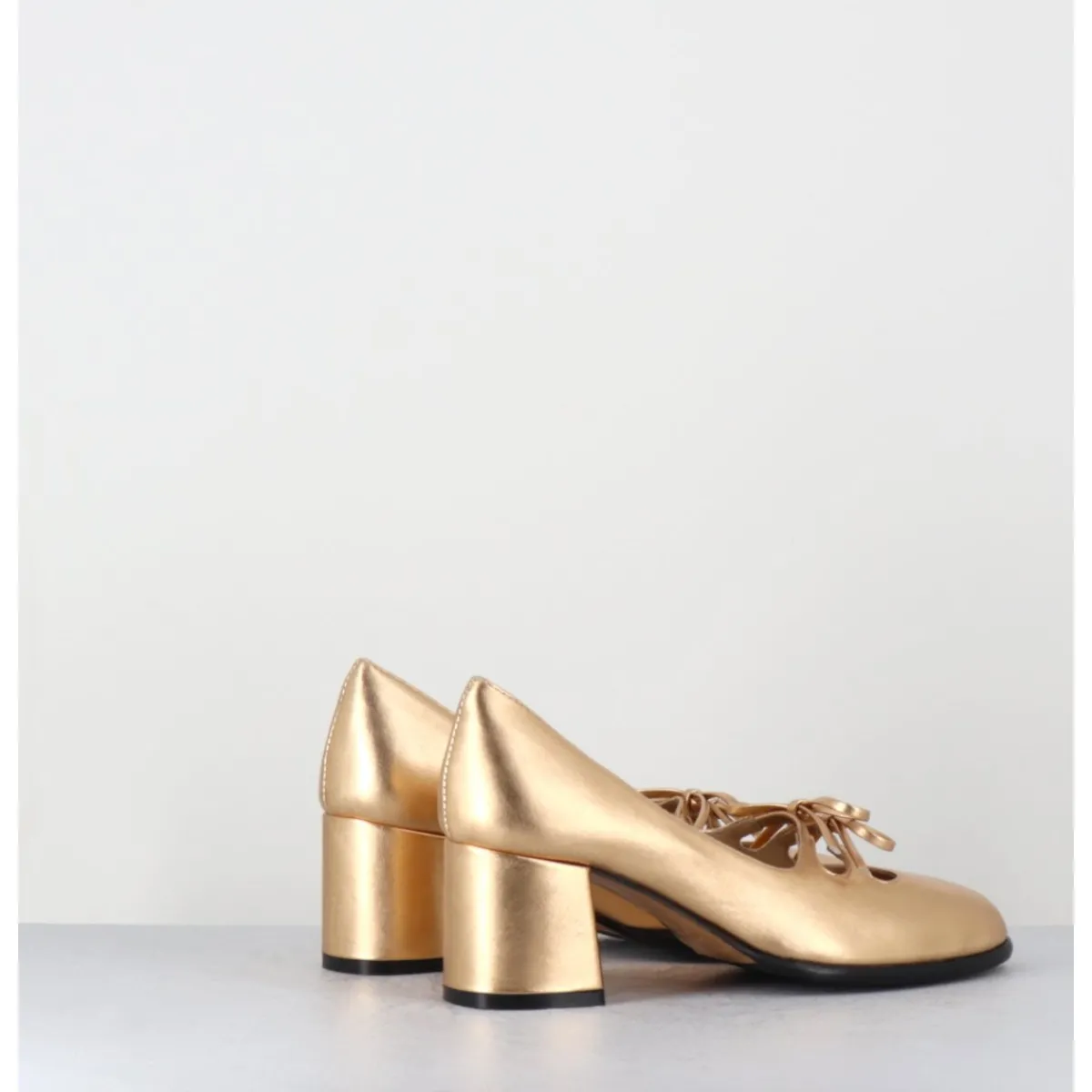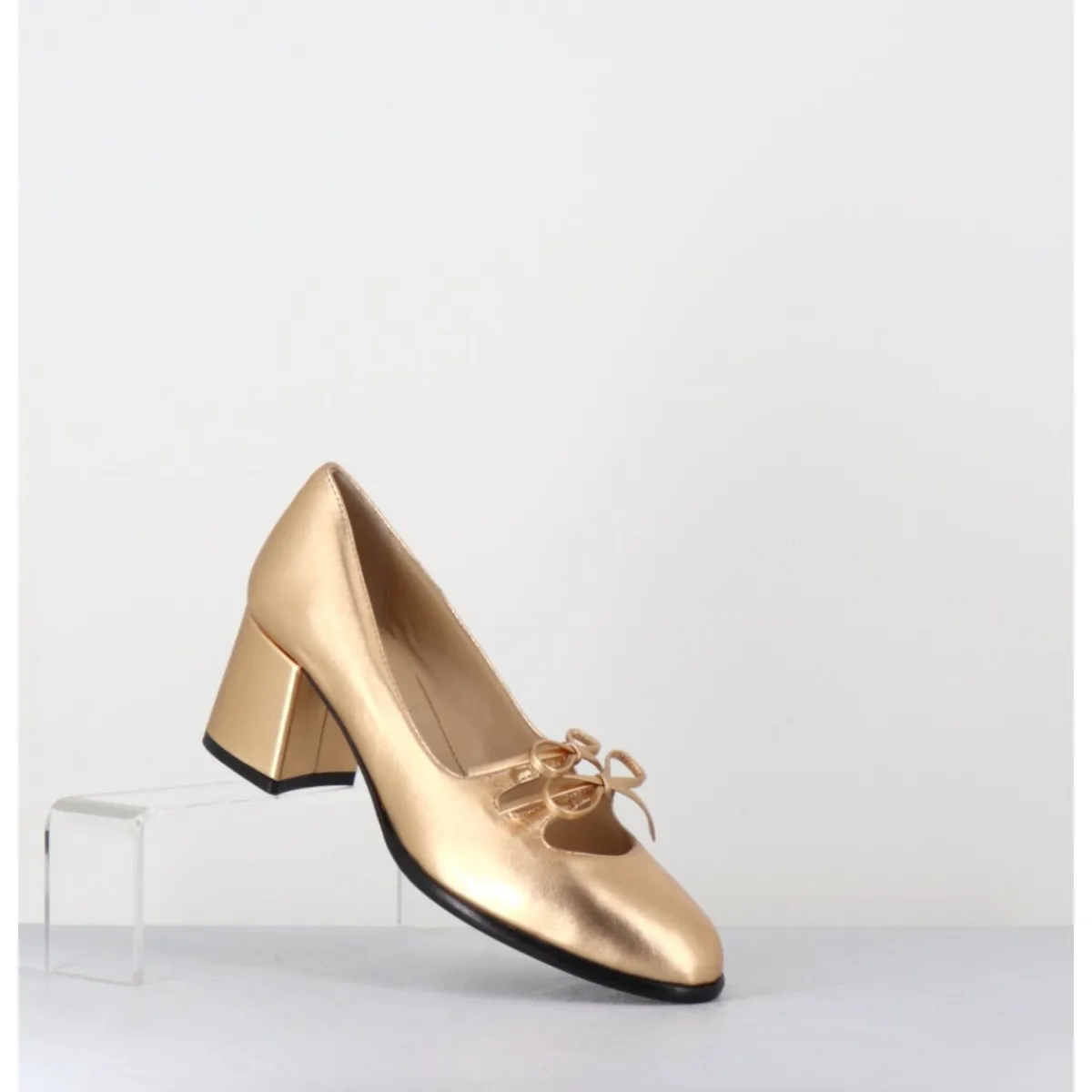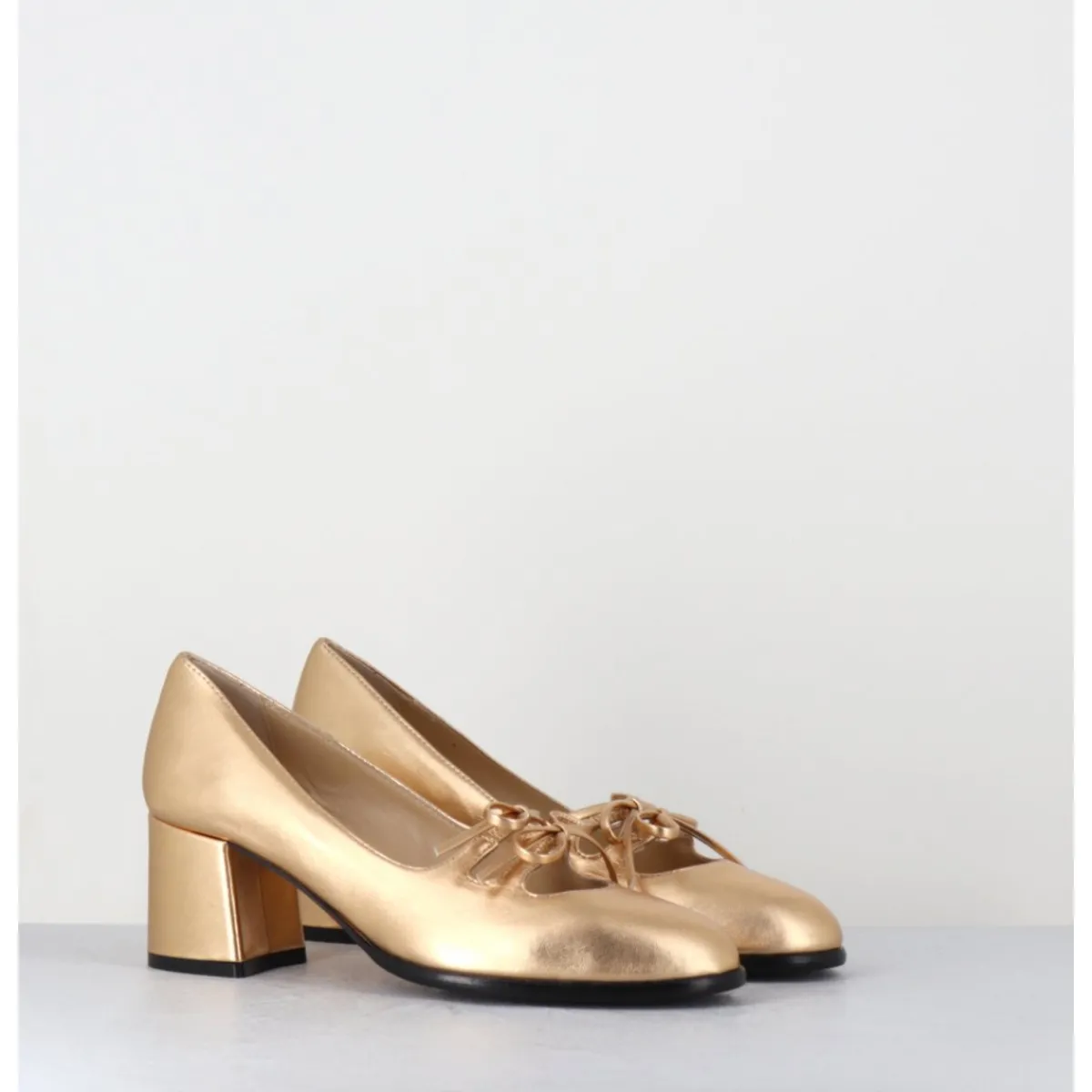 Babies à talon en cuir métallisé doré avec petits noeuds décoratifs cousus sur des élastiques de confort invisibles, bout en amande, montées sur un talon bloc