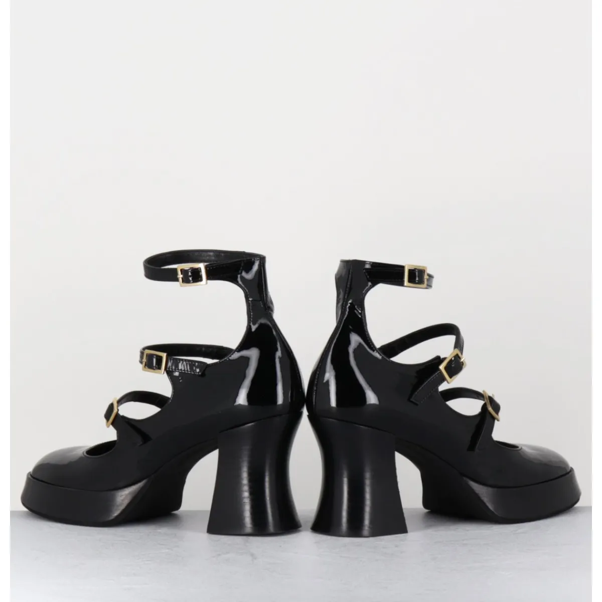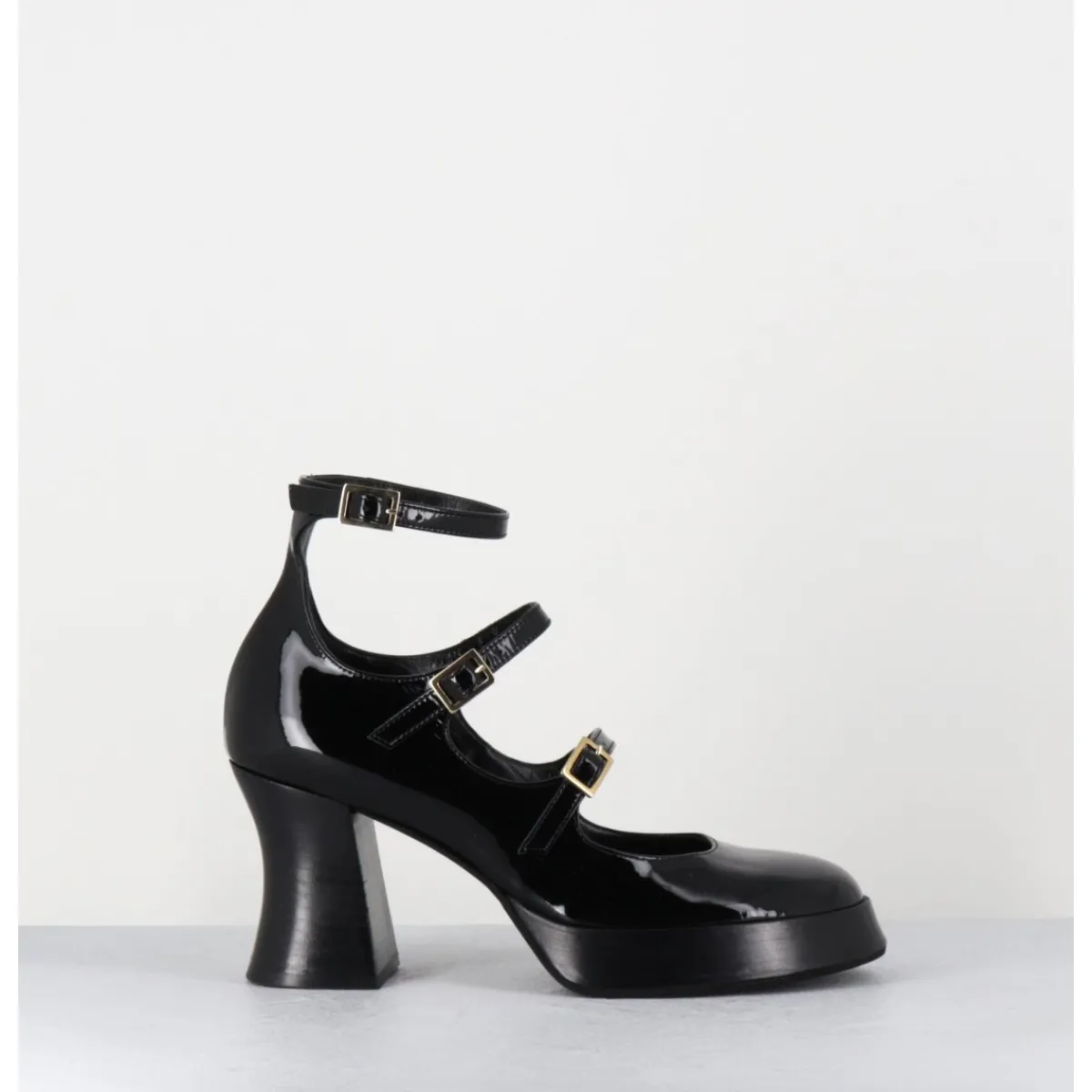 Chaussures babies multi-brides en cuir vernis noir, 3 boucles dorées réglables, bout rond, montées sur une fine plateforme et un talon esprit bobine rétro