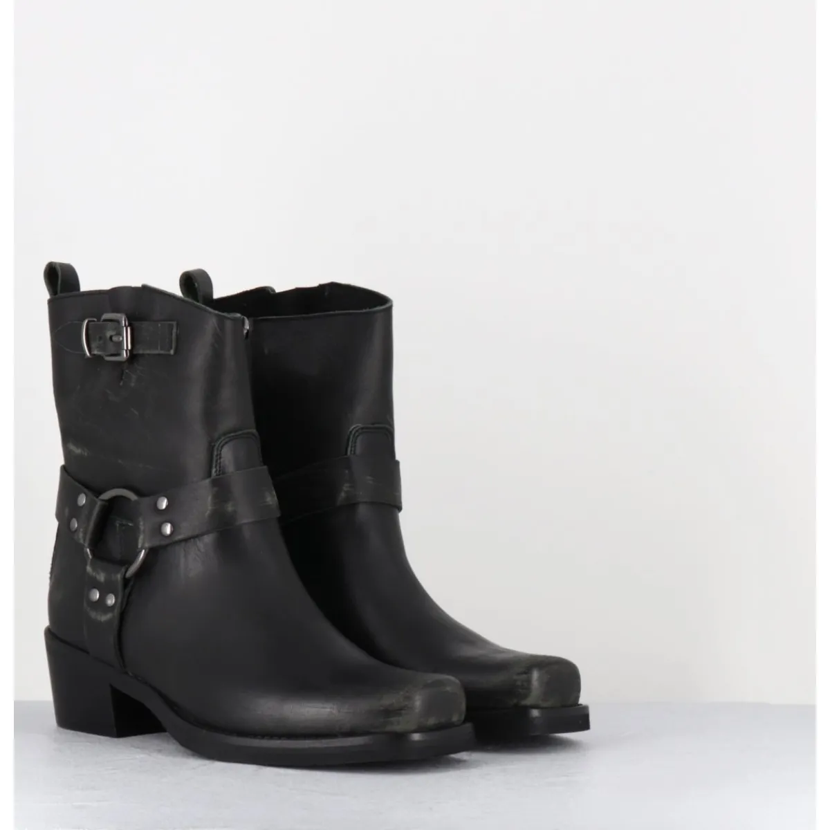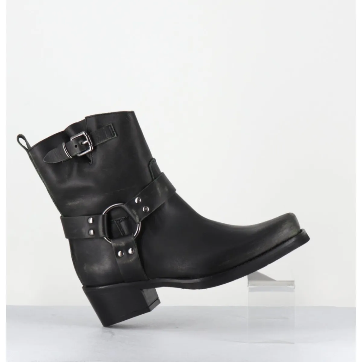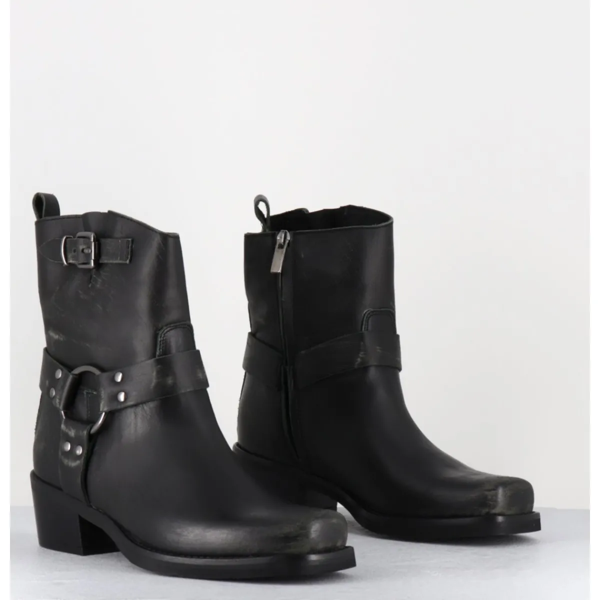 Boots en cuir souple noir effet usé anthracite, boucle ceinturon argent esprit biker, bout carré, zip intérieur, montées sur une semelle en gomme et un petit talon bloc confortable