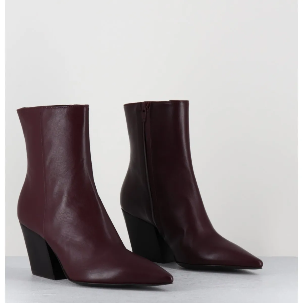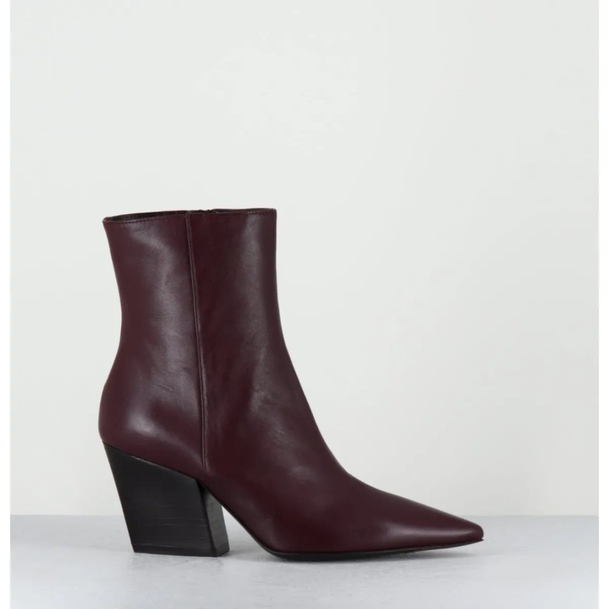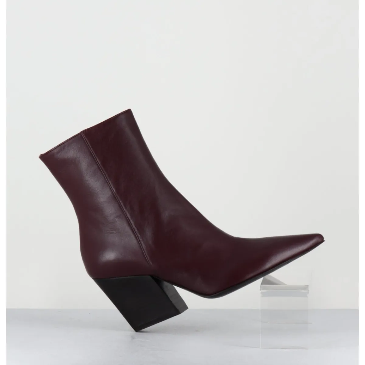 Boots en cuir prune bout pointu, zip intérieur, montées sur une talon haut légèrement biseauté