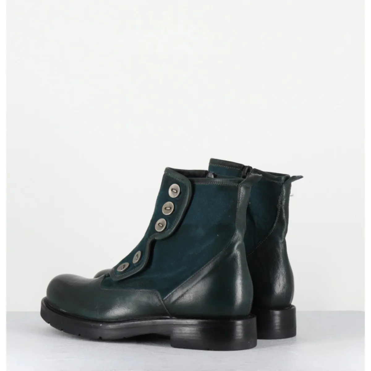 Bottines plates bi-matière en cuir vert bouteille & daim bleu pétrole, ornées de petits boutons au look vintage, bout arrondi, zip intérieur, montées sur une semelle en gomme légère
