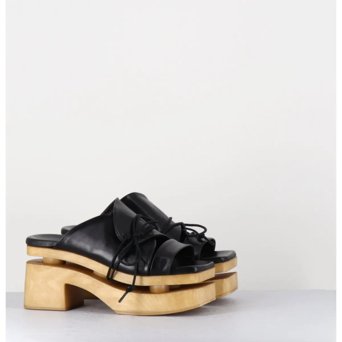 Forme originale des années 70 réalisée sur un bloc large effet bois léger, bout carré, adorable design cache-coeur en cuir noir souple avec lacets noués à la semelle, rappelant les plateformes traditionnelles japonaises