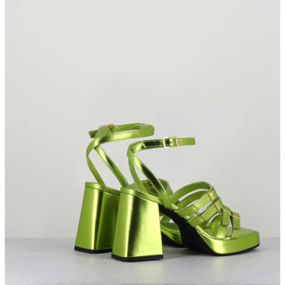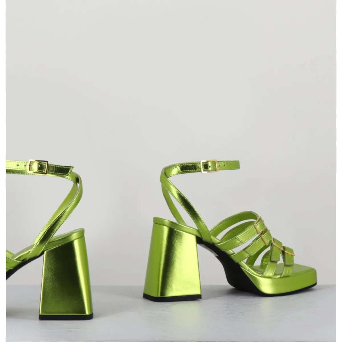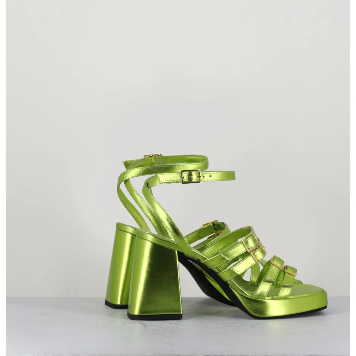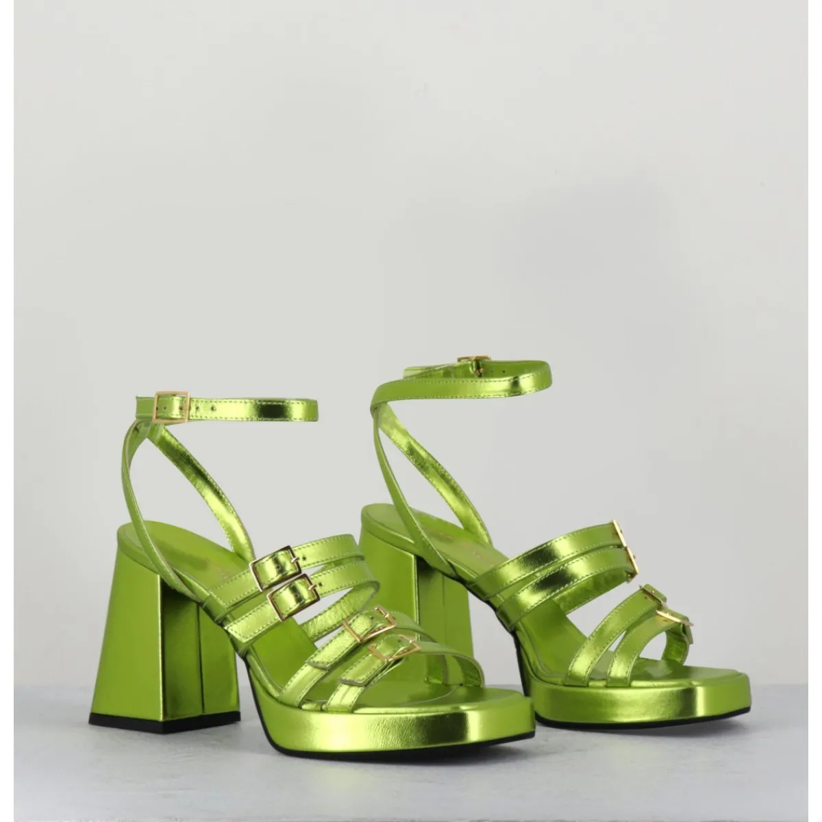 Sandales à plateforme 90s bout carré en cuir métallisé vert acide, multi-brides à petites boucles dorées réglables, montées sur un talon large légèrement évasé.