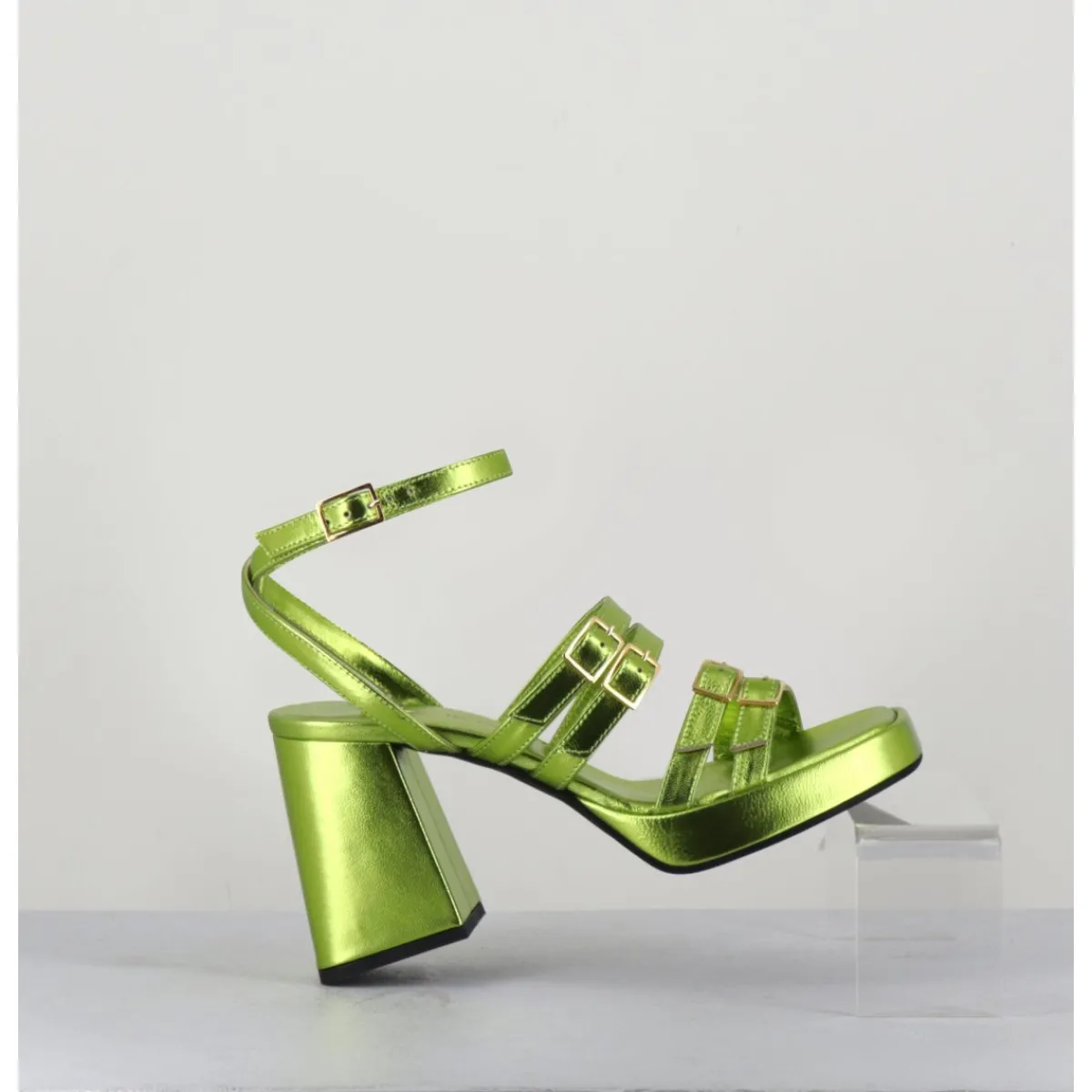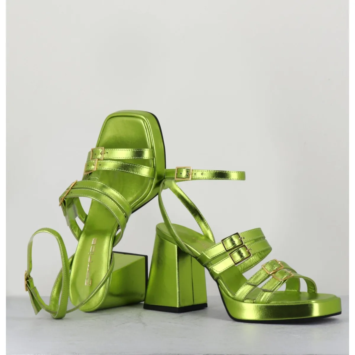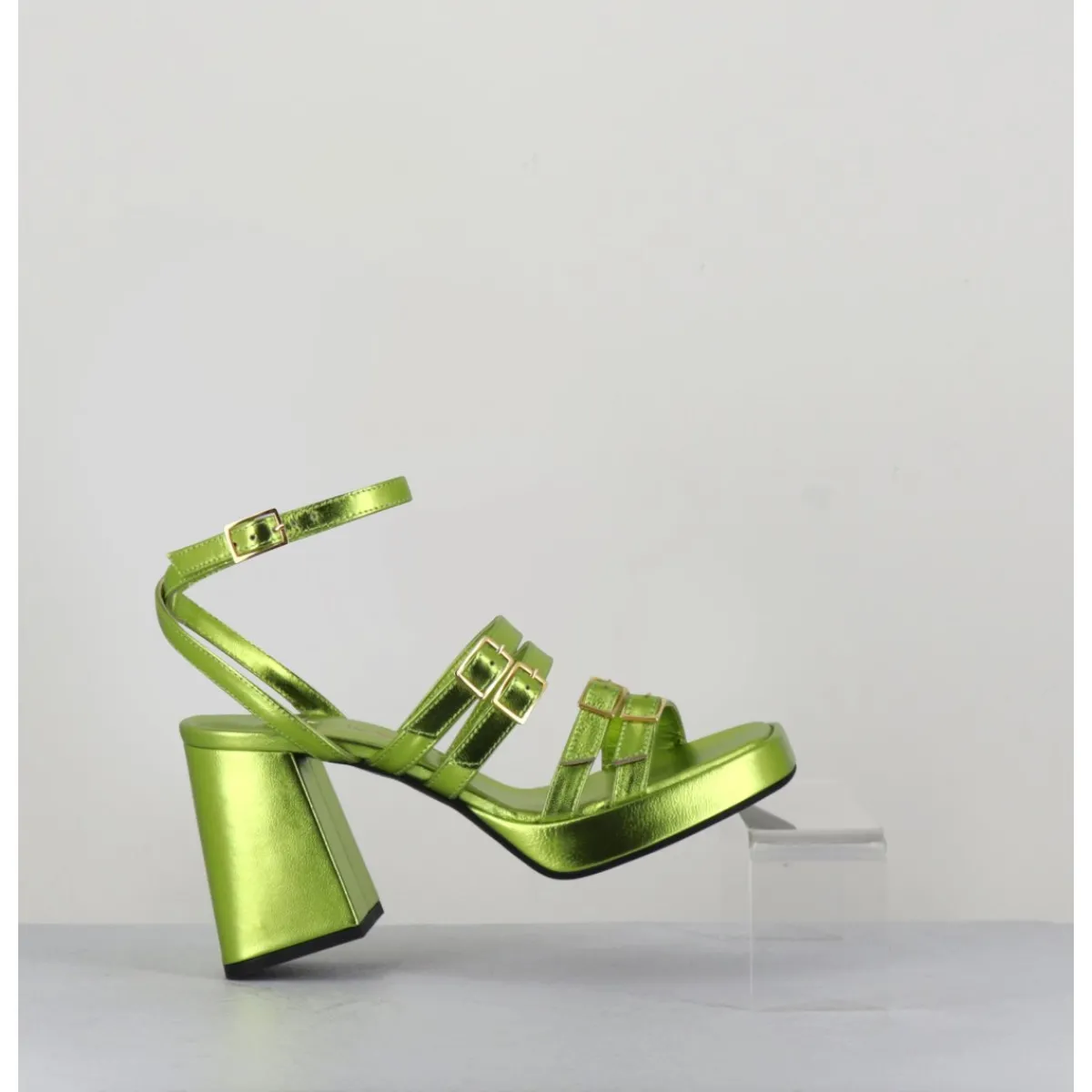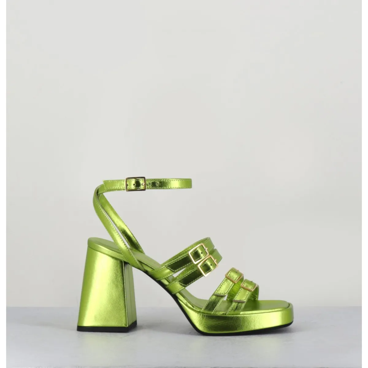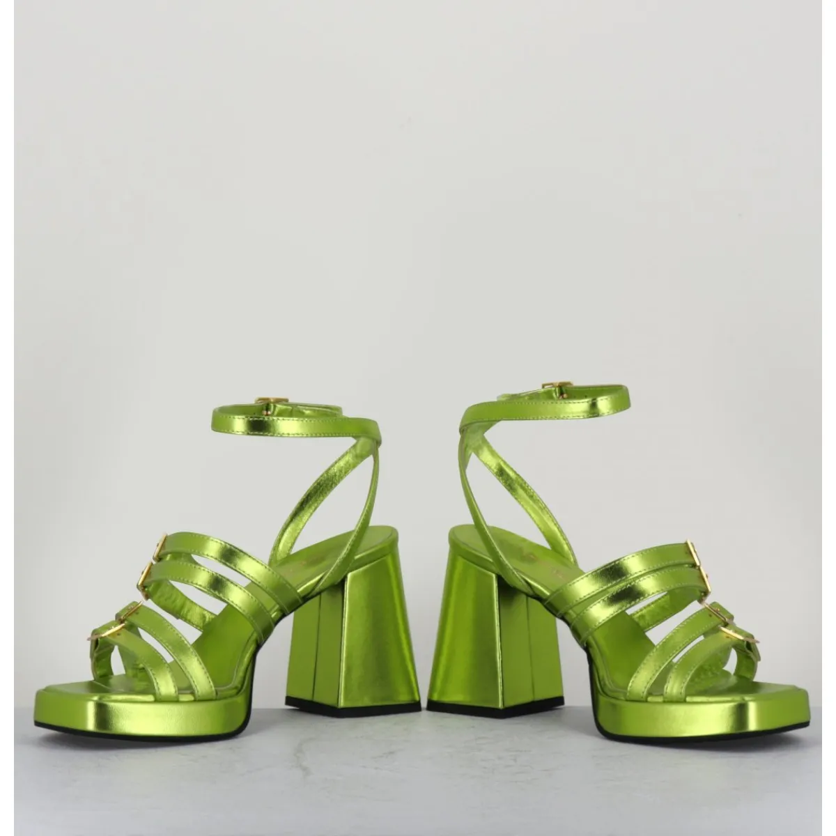 Sandales à plateforme 90s bout carré en cuir métallisé vert acide, multi-brides à petites boucles dorées réglables, montées sur un talon large légèrement évasé.