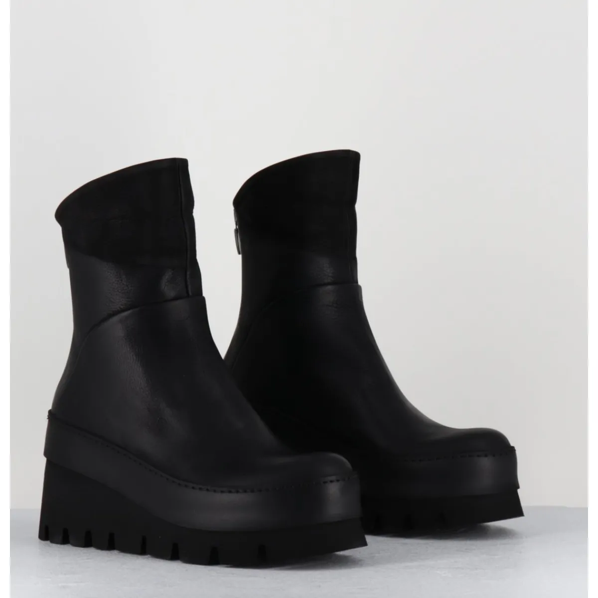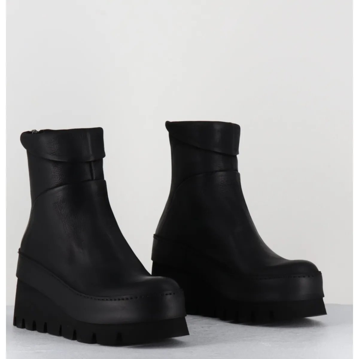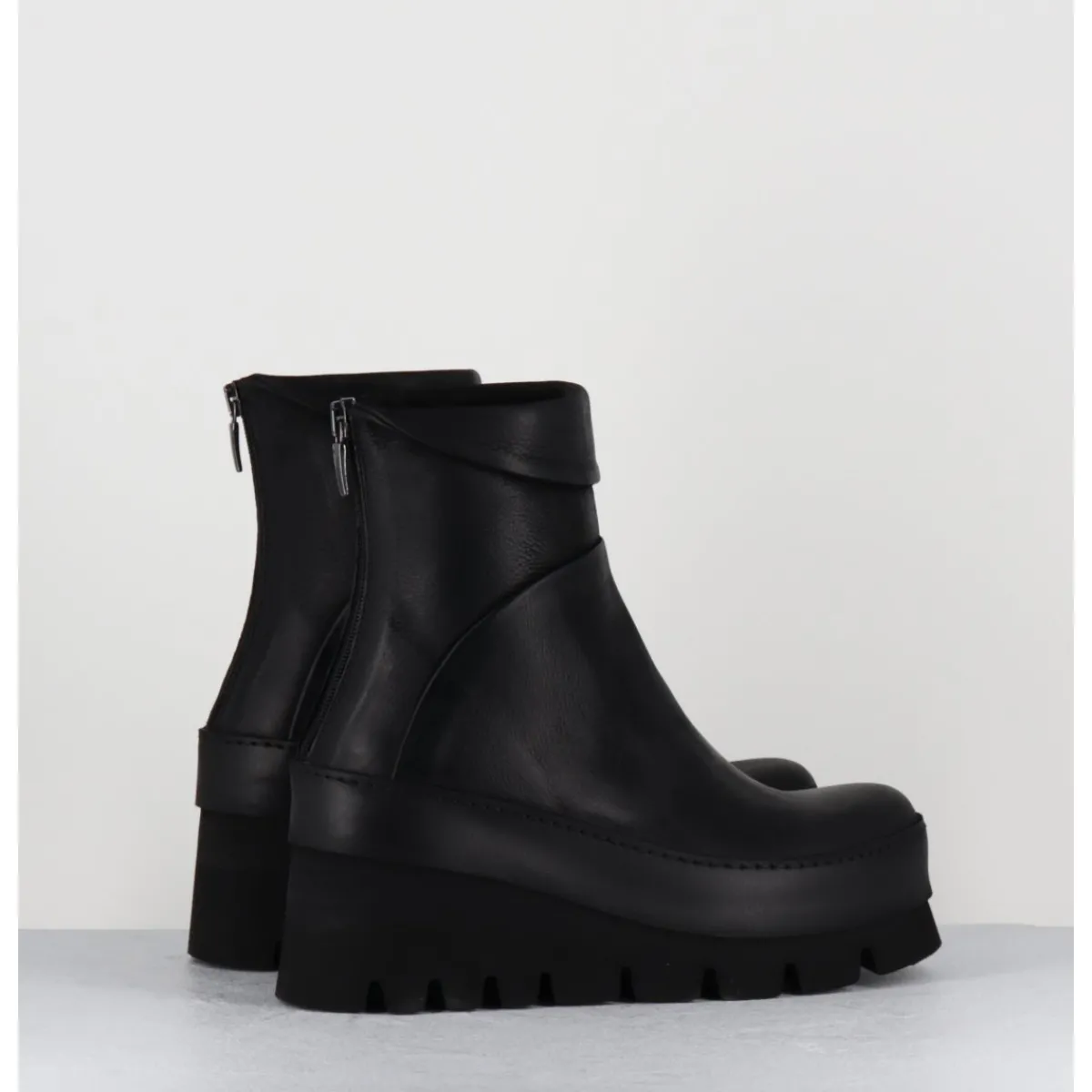Boots compensées en cuir noir, bout arrondi, zip arrière, tige asymétrique modulable, bordure en gomme noire contrastant avec la semelle ultra légère en micro-fibre crantée esprit déstructuré