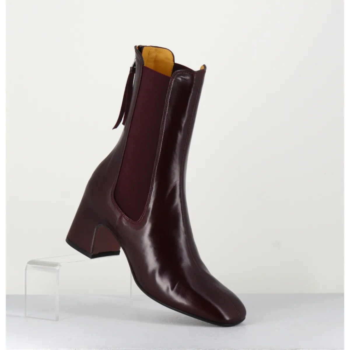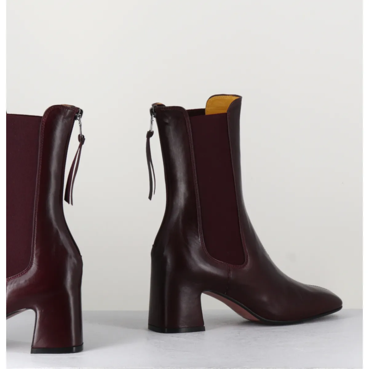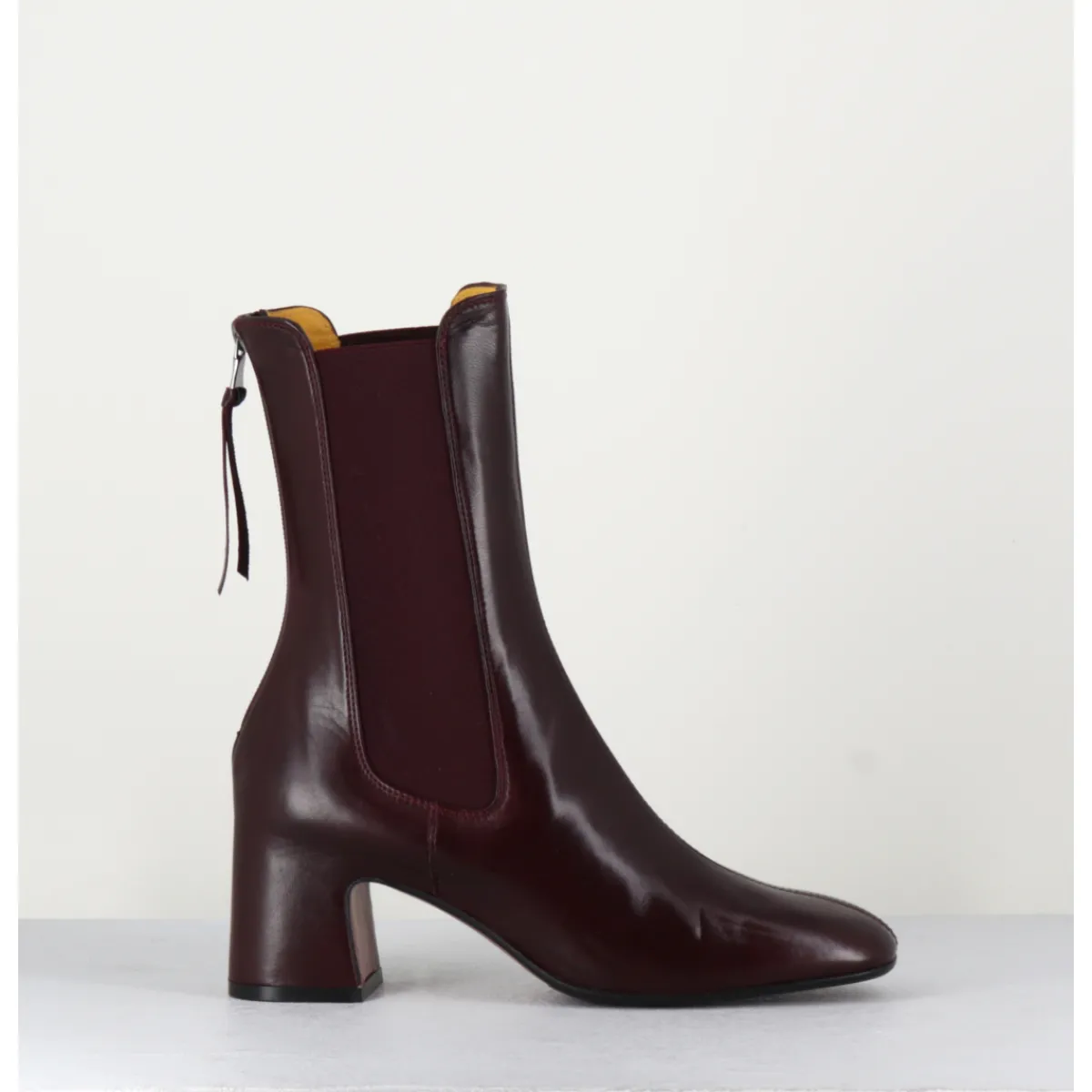 Boots en cuir bordeaux extrêmement souple avec élastiques, bout carré doux, zip arrière, montées sur un petit talon carré esprit 70s. Chic & confortable !