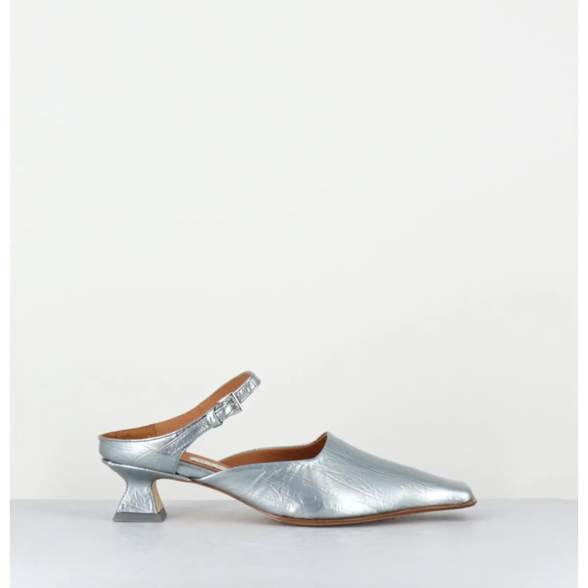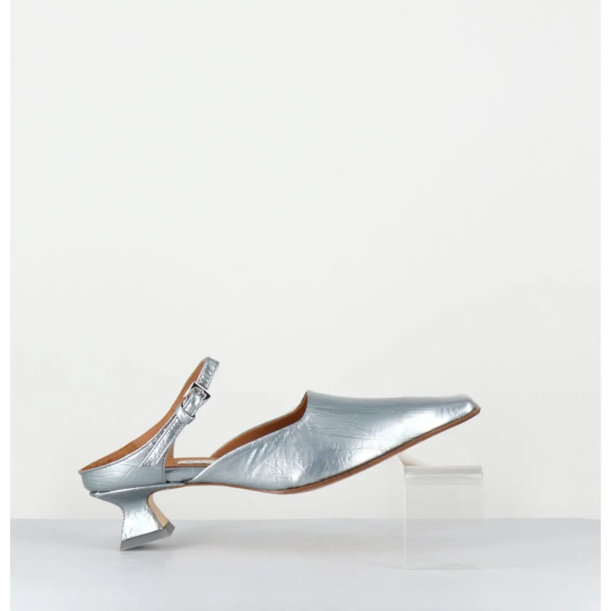 Mules à bride en cuir métallisé bleu ciel, découpe asymétrique, bout carré incurvé rappelant les formes du début des années 2000, montées sur un petit talon pyramidal recouvert de cuir