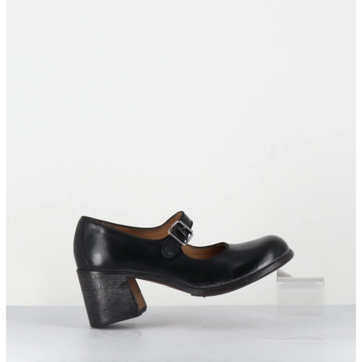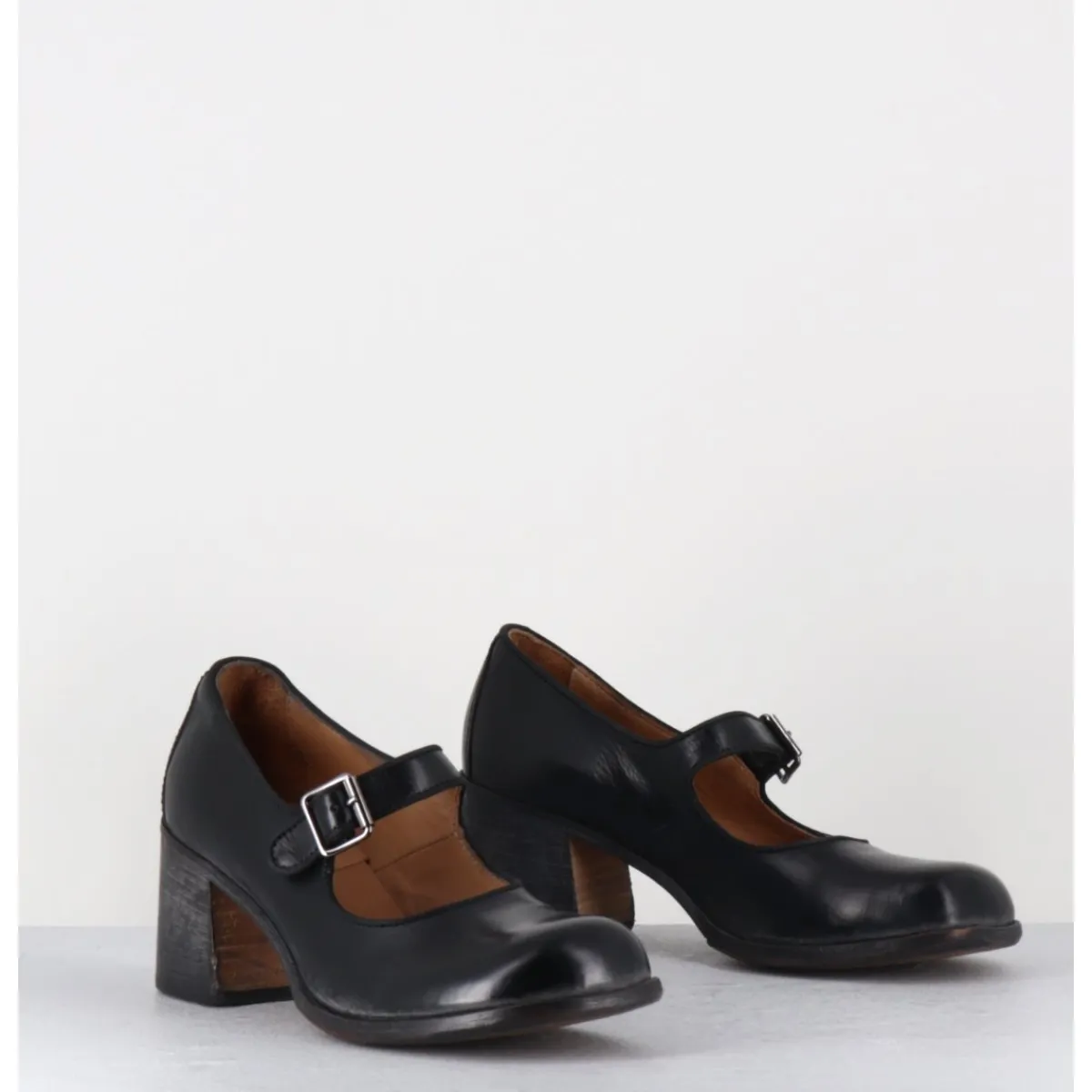 Chaussures babies en cuir souple noir, ligne pure esprit avant-garde, bout carré-arrondi, montées sur une semelle cousue et lavée à la main pour un effet usé et un talon bloc confortable