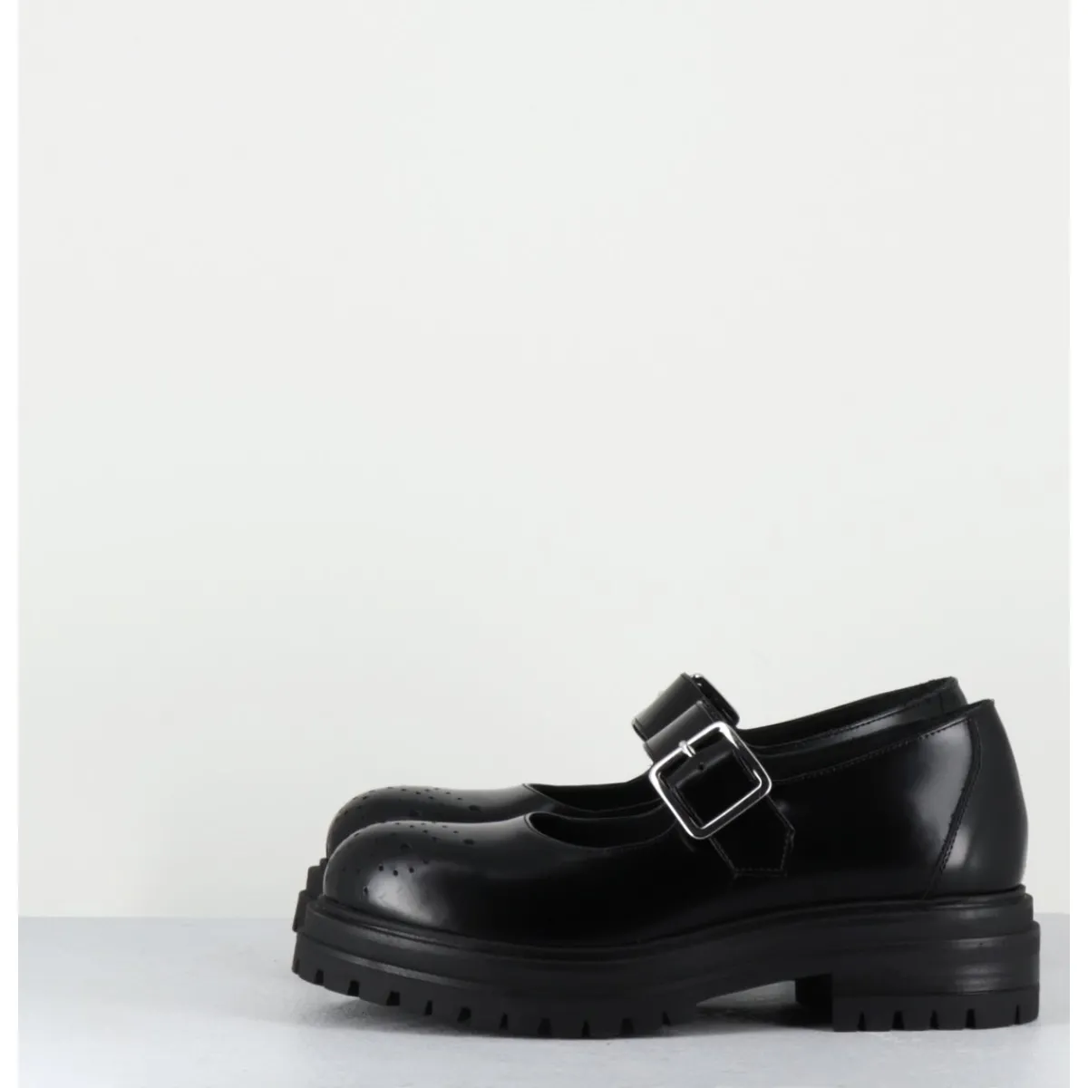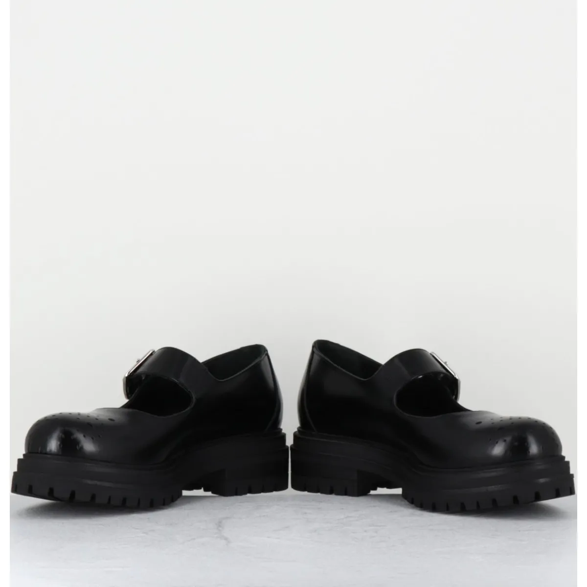 Babies Mary-Jane en cuir glacé noir, bout fleuri, large bride à boucle réglable, montées sur une double-semelle en gomme crantée