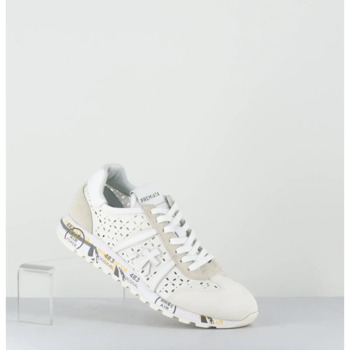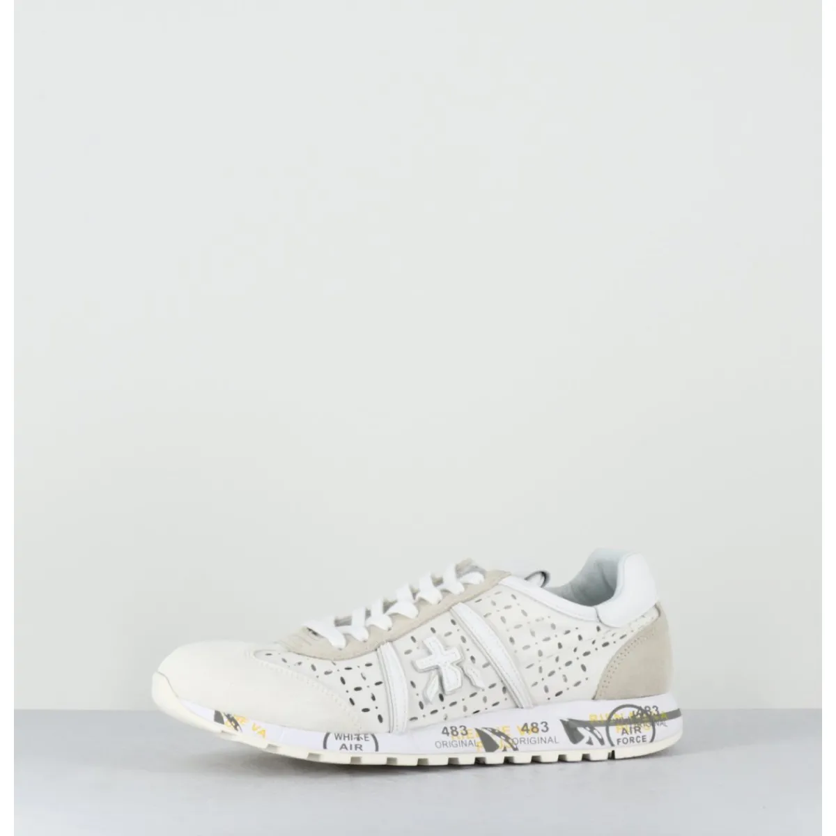 Baskets daim beige et toile ajourée, montées sur une semelle légère, avec imprimé signature de la Maison Italienne Premiata